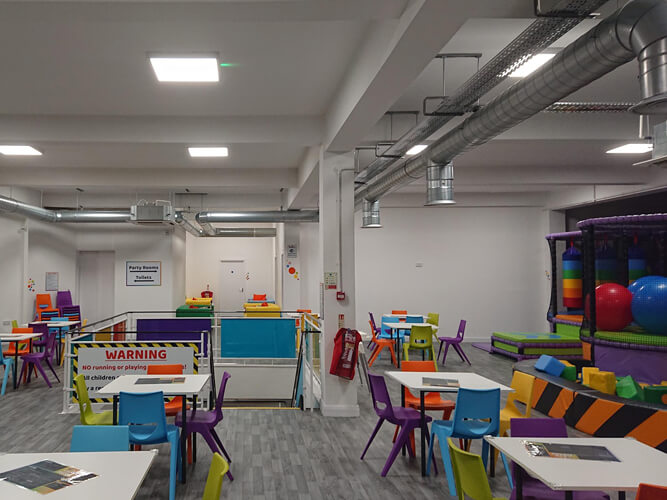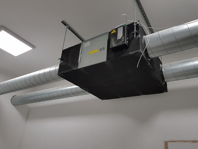 The ventilation unit provides fresh air into a space by pulling air from the outside, as well as extracting stale air from inside the building to the outside through long duct work pipes. Both incoming and outgoing air pass through the ventilation unit which filters the air. The different air temperatures cross over each other and average out, the energy is ‘recovered’. The calculations of the size of the unit depends on the number of people inside the building, another calculation is the volumetric space. Each unit is sized and calculated to meet the current regulations. The units at Baloo’s for example can exchange 1000 m3 of air per hour, so they are quite big units. One on each floor.