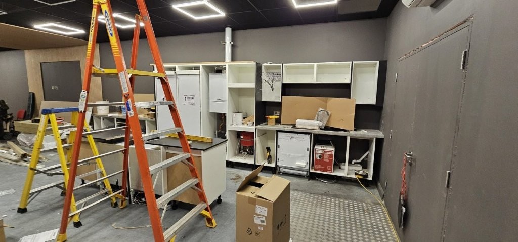 All plumbing and electrical services were disconnected, new partitioning and flooring installed along with some re-configuring of the lighting circuit to suit the new room layout.