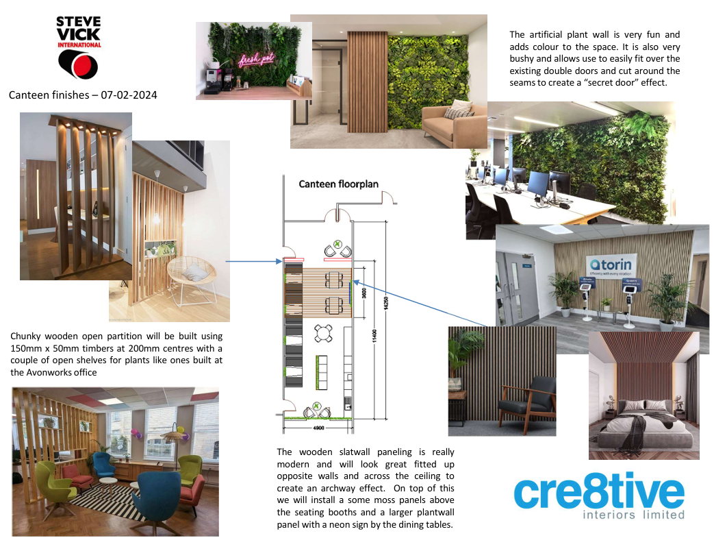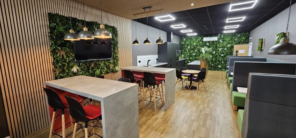 The planter and screens were filled with artificial plants along with the floor to ceiling artificial plant wall which hides the double door into the loading bay. A section of plant wall was fitted behind the TV in the dining area along with some small square frames of foliage to add interest above the meeting pods.