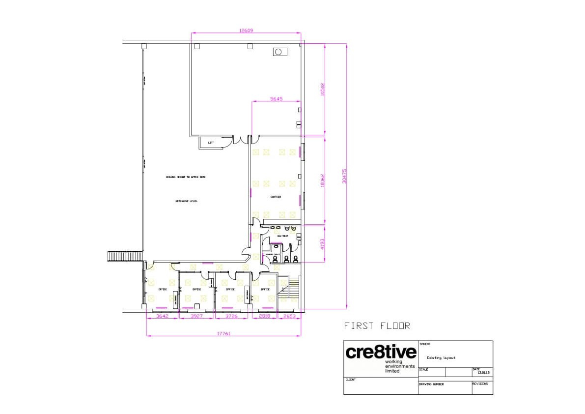 We produced many drawings for each of the areas that we had to work on. This included work to the front offices, so they needed power and data, lighting, repairs to the suspended ceiling and new carpet. Other areas included:
