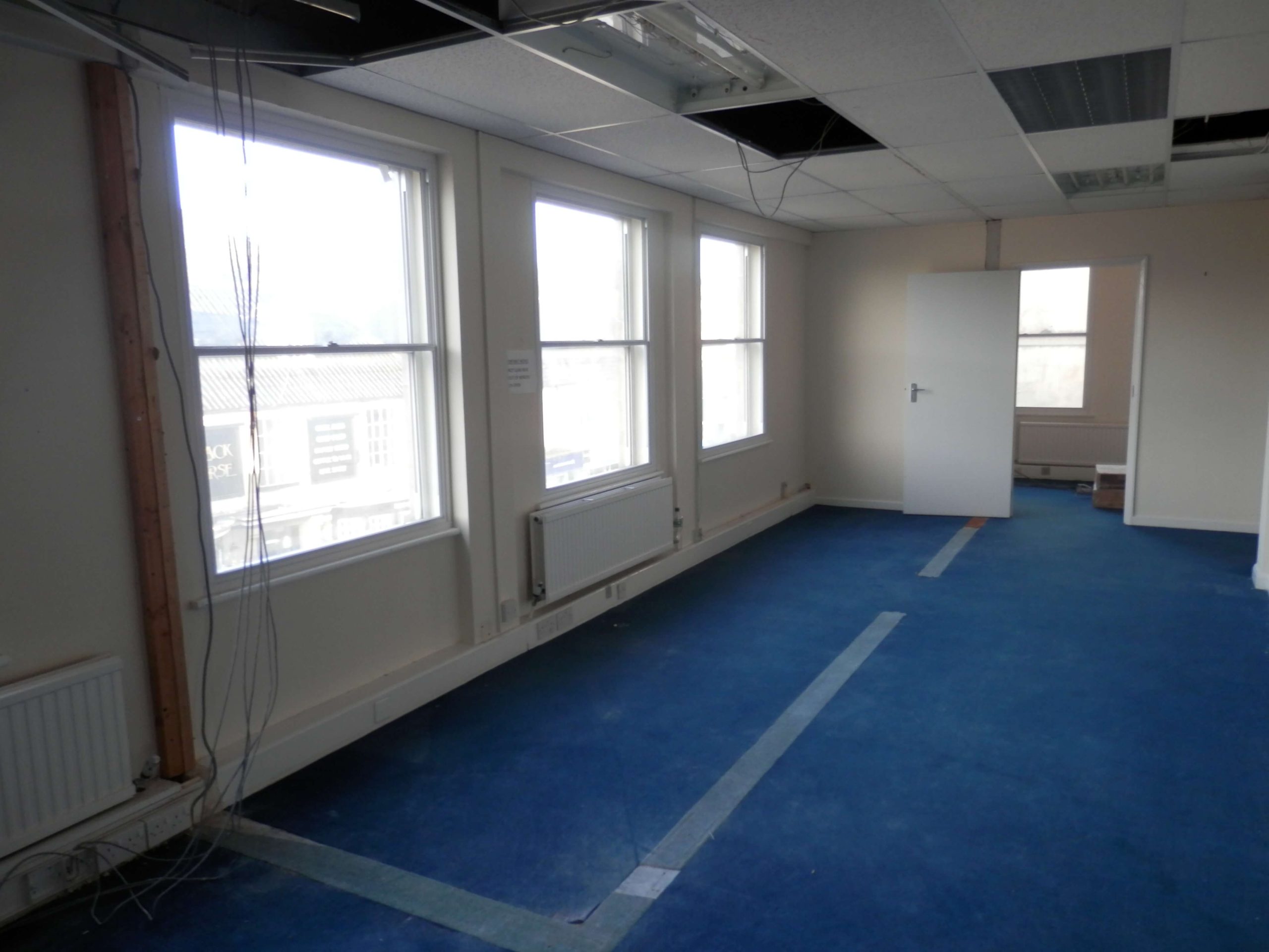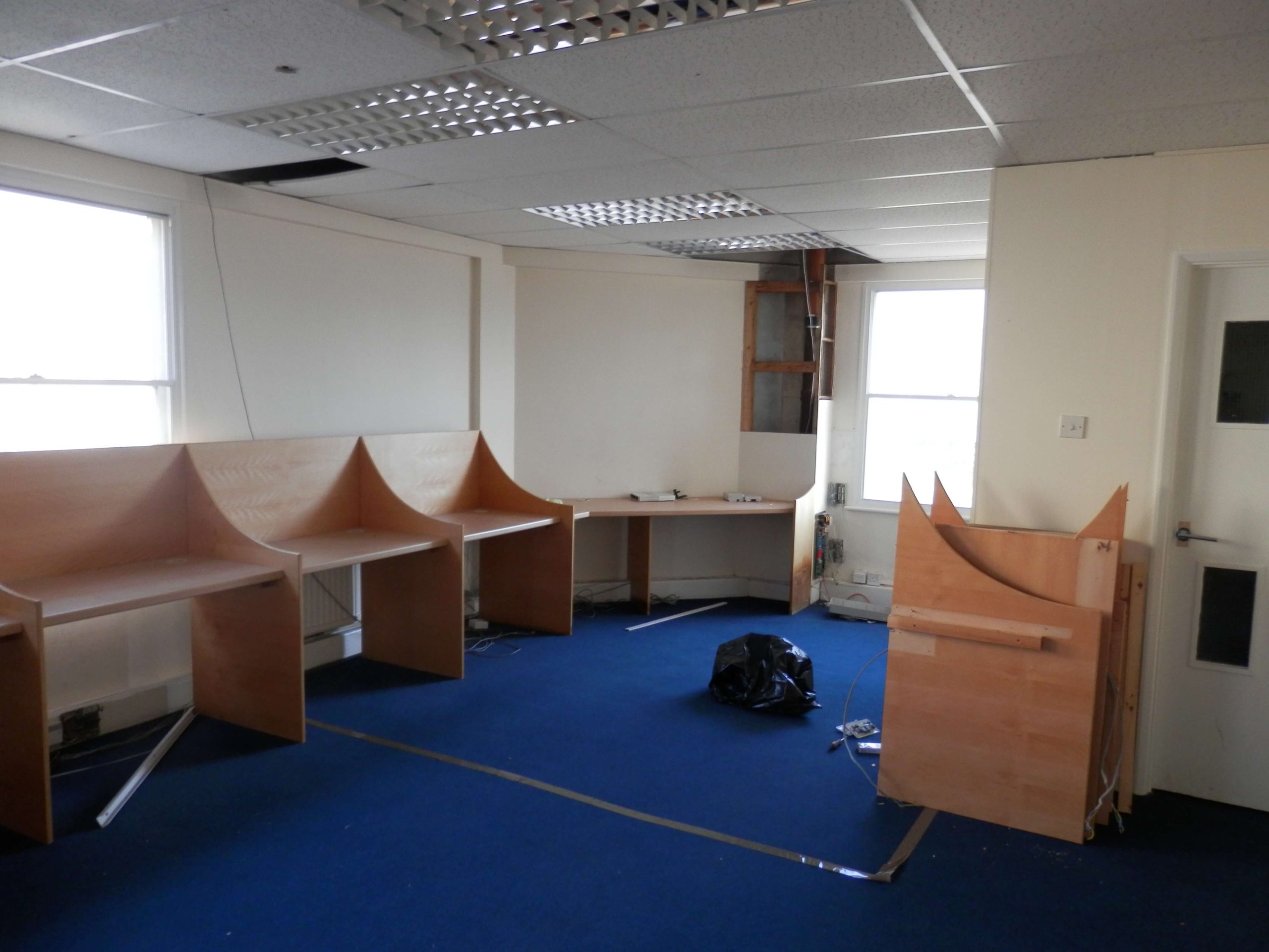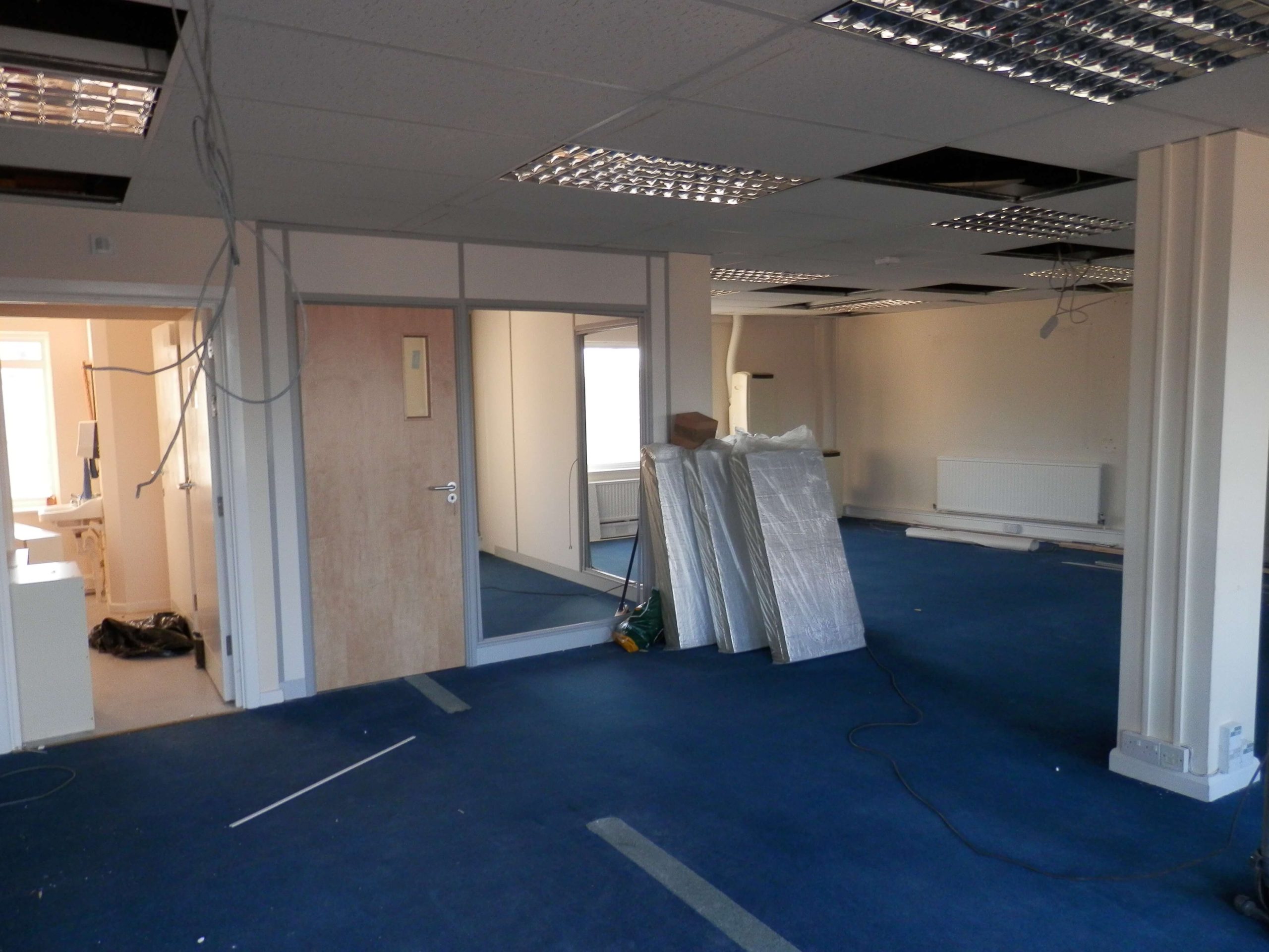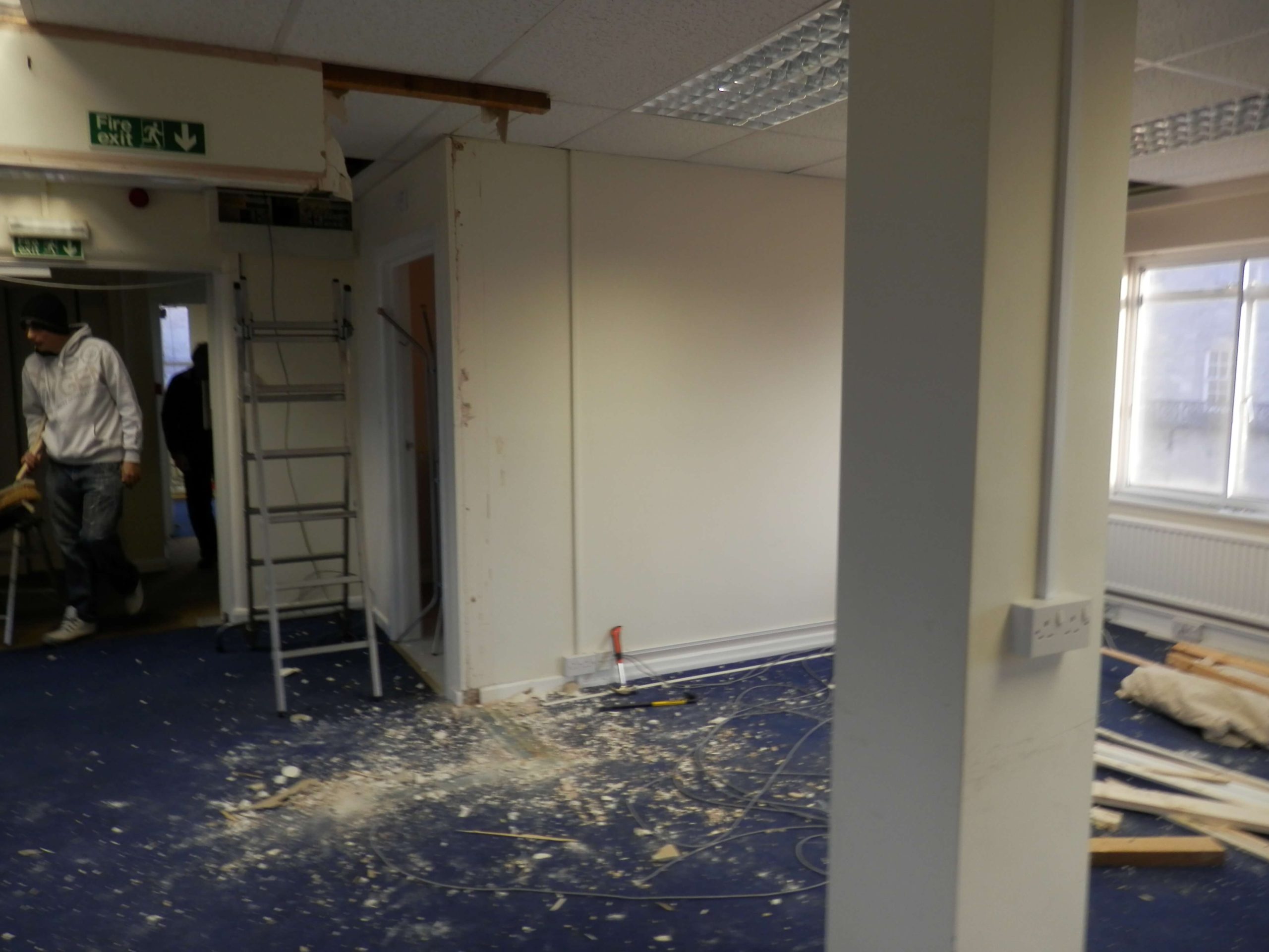 Sat 7 based in Chippenham contacted us recently as they wanted us to remove partitioning walls within their 2nd floor office which included large glass windows. They also wanted new demountable partitioning put up within this office space, once this was done we had to match and repair the carpet.