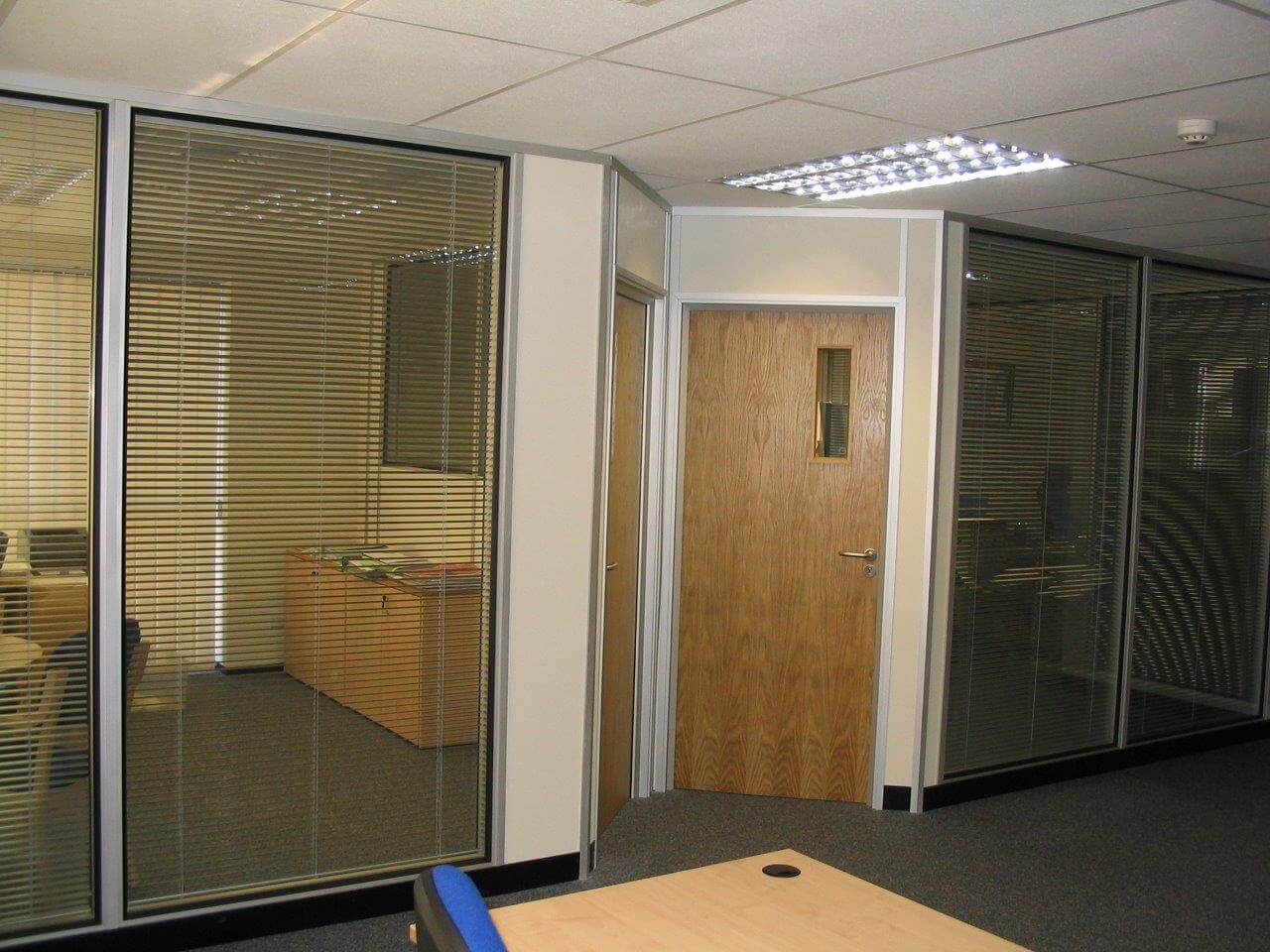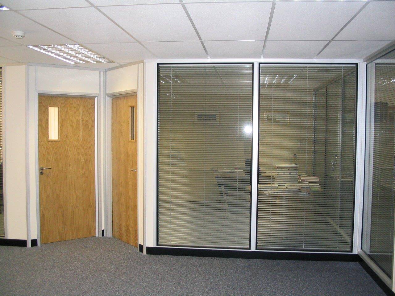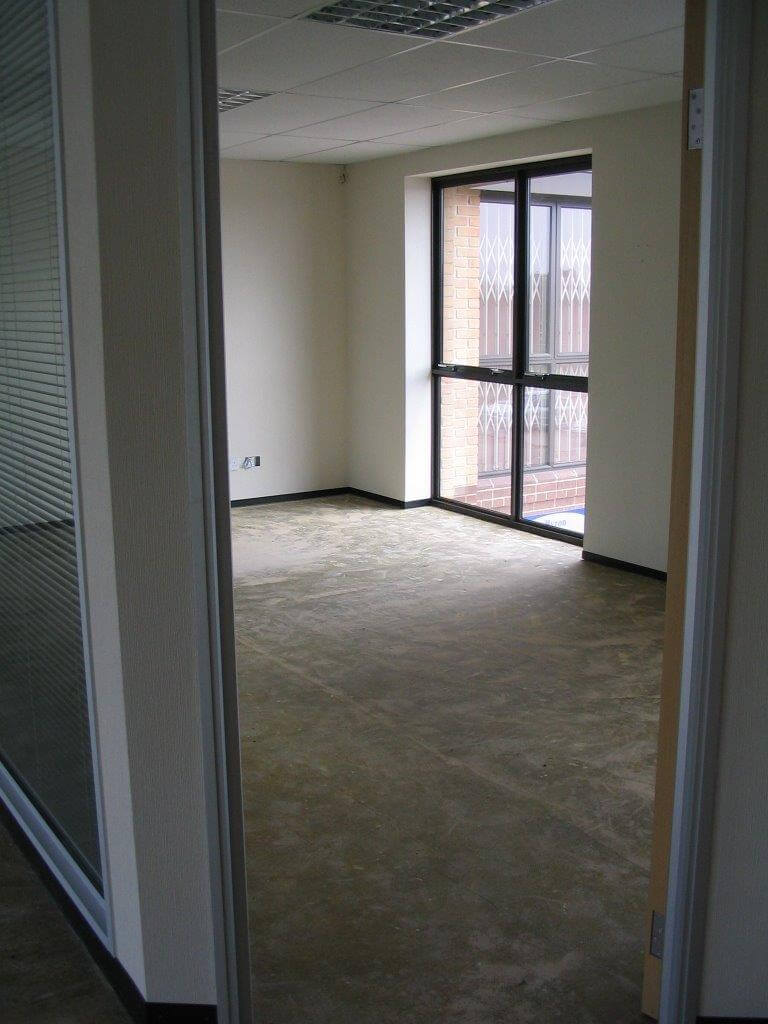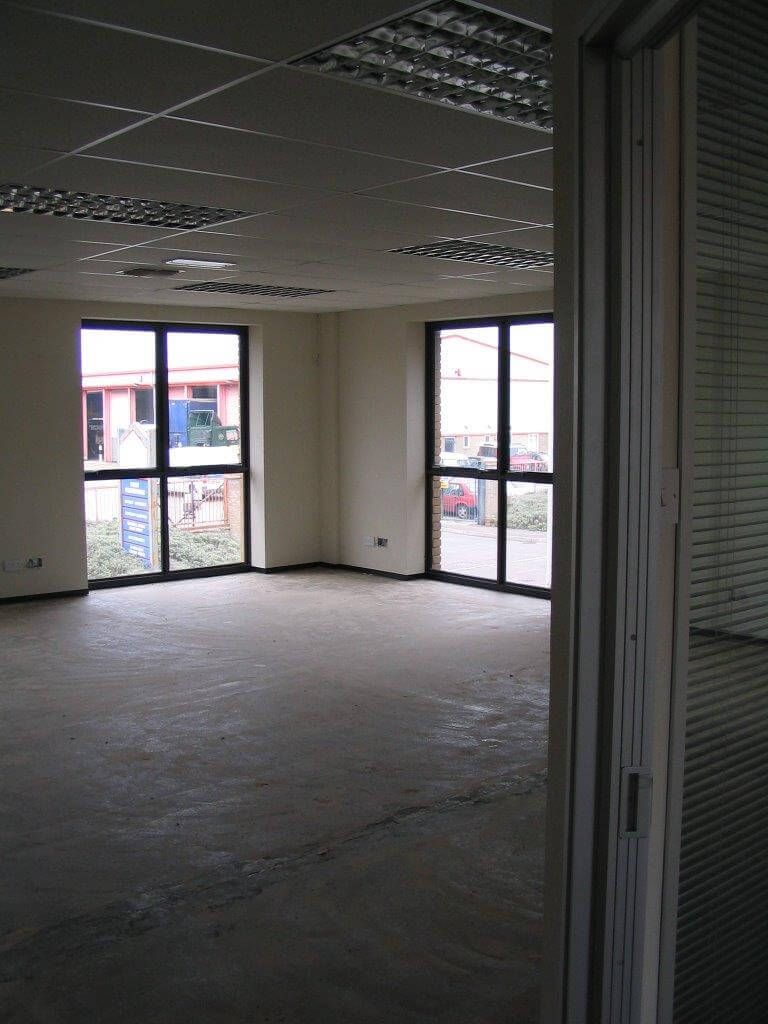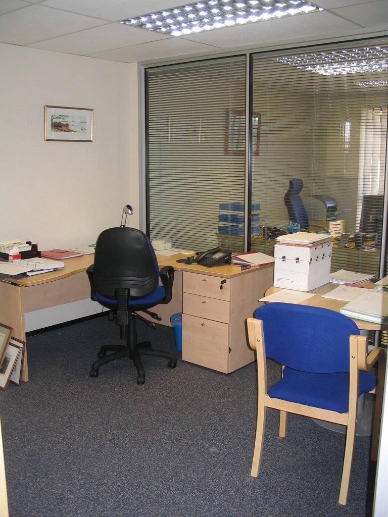 The system is 100mm wide with 4 layers of plasterboard for addded sound insulation. We also had to re-route the ventilation grills to suit the layout and provide the office furniture for the offices which was supplied by Sebastien furniture for business. As you can see from the photographs the design is quiet dated now, using Satin Anodised Aluminium frames and black laminate skirting. More modern designs move away from the black colour and the frames are available powdercoated white or grey, and are in stock. White or grey is the new Satin Anodised Aluminium look.