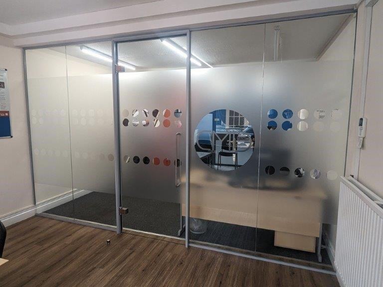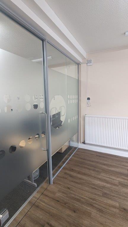 - The third and final visit is a couple of days later to fit the manifestations onto the glass. The bespoke manifestation used a frosted band fir privacy with the CMD recruitment logo cut out which is a really smart way of using the negative space and we think its very eye-catching. Another great example of bespoke branded manifestations can be found on this project in Swindon.