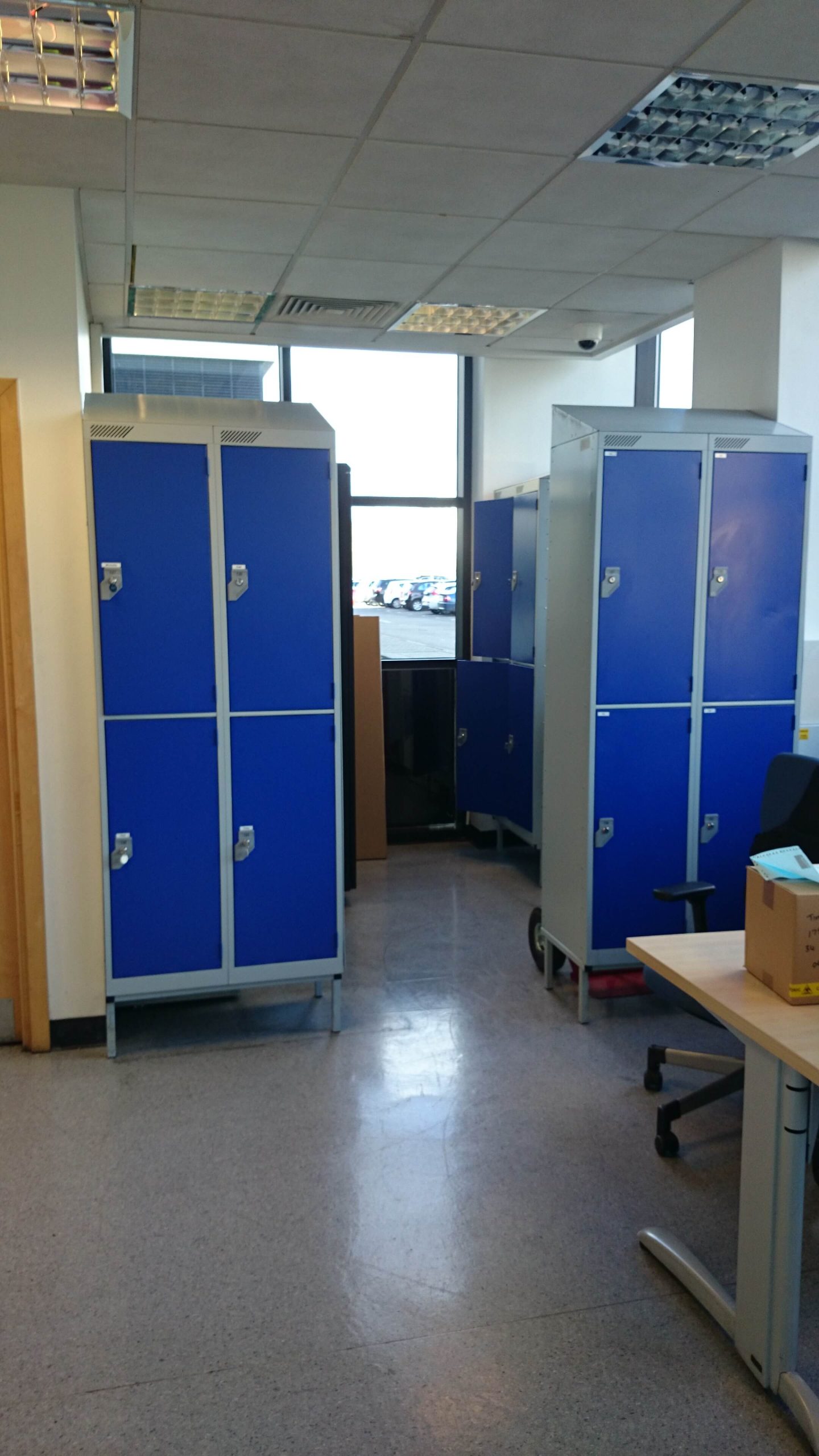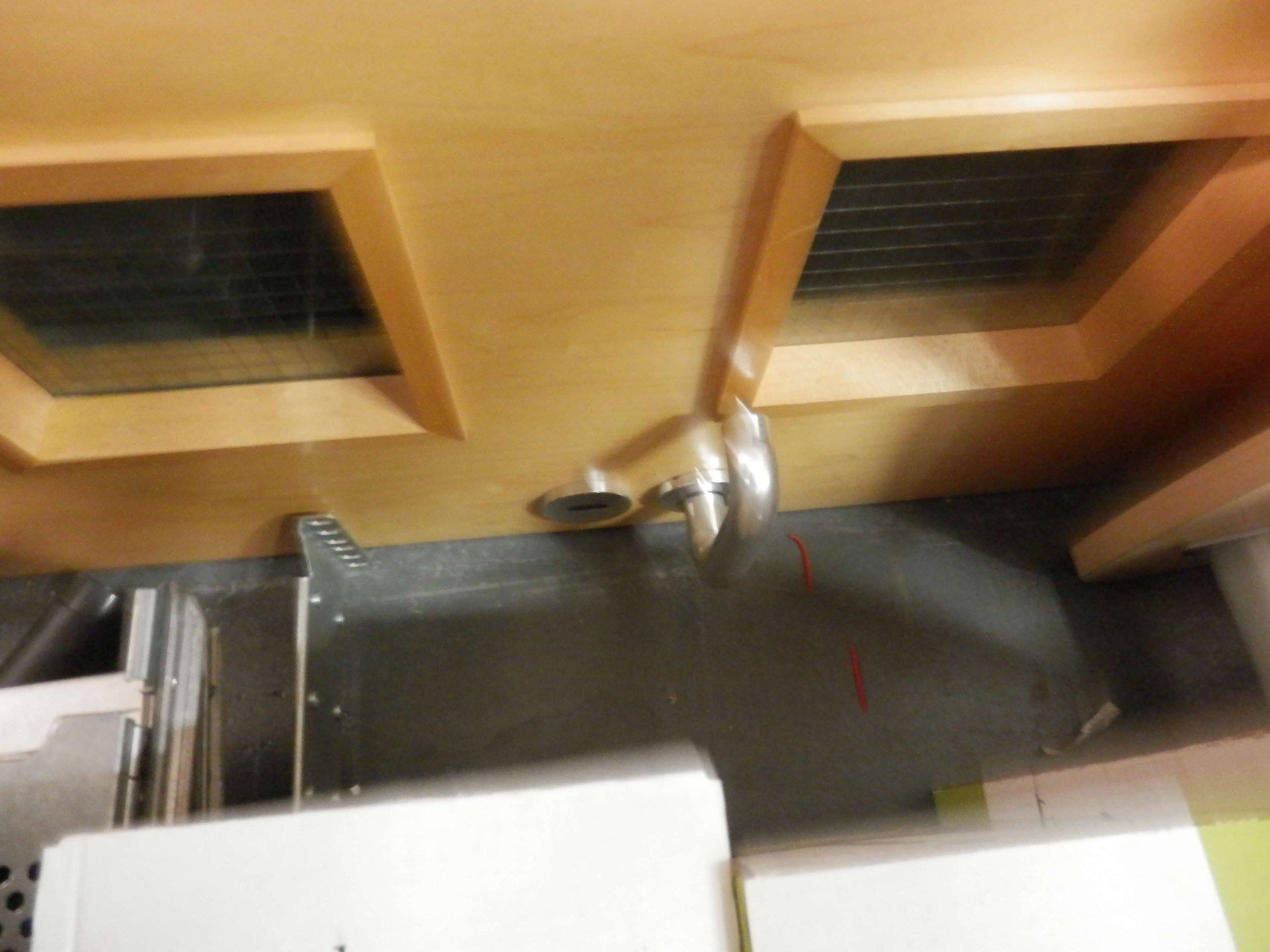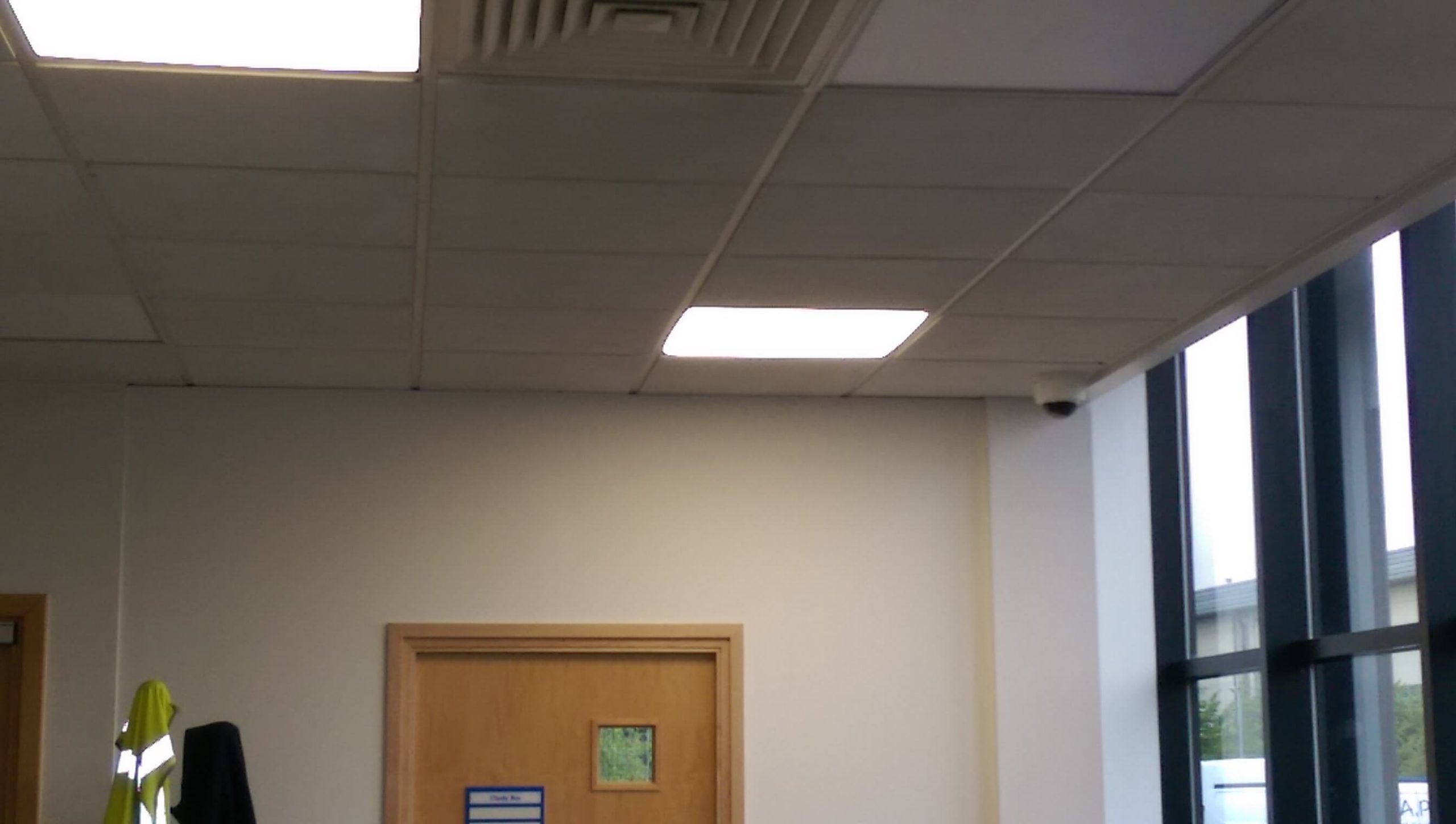 The existing lighting used in the area was CAT2, which everyone used to put in a few years ago, we thought LED panels would give a less direction light for the staff. You can also see the area with the lockers that need to be blocked off. In order to save costs, we had to use an existing door which was actually a good idea as the wood finish would be pretty close to the the existing one next door, and so it would not look too different. We also used a timber frame, as well as taped and jointed the walls so it blended in with the existing wall. There was a slight height difference as the door that we had to use was slightly shorter than the existing.