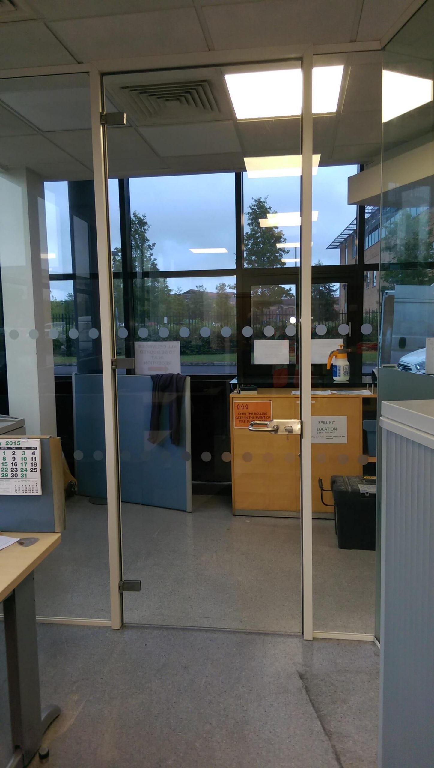 The customers’ main requirement was to segregate the large reception area to give some protection for the staff as they suffered from draughts and noise when the visitors went in and out of the entrance doors. They did not want solid walls but glass partitioning.