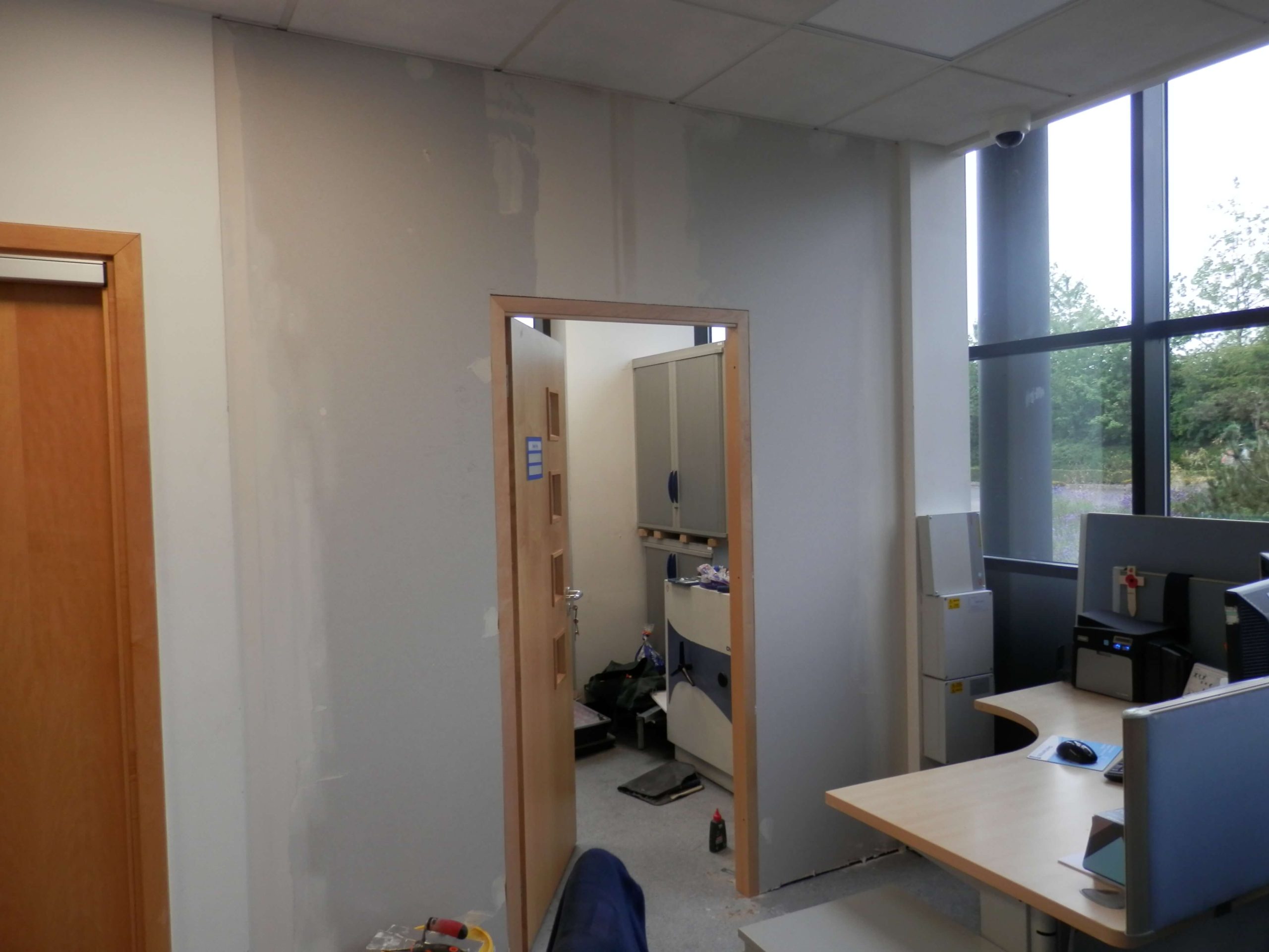 Creating the server room wall actually took longer than to build the frame and new glass door. There was quite a bit of work involved. As well as cutting the wooden frame and fitting the existing door, the solid wall had to be tape and jointed. When tape and jointing two coats are applied and the first coat has to dry overnight, so it can be rubbed down and the second coat put on. Once finished the wall was painted.