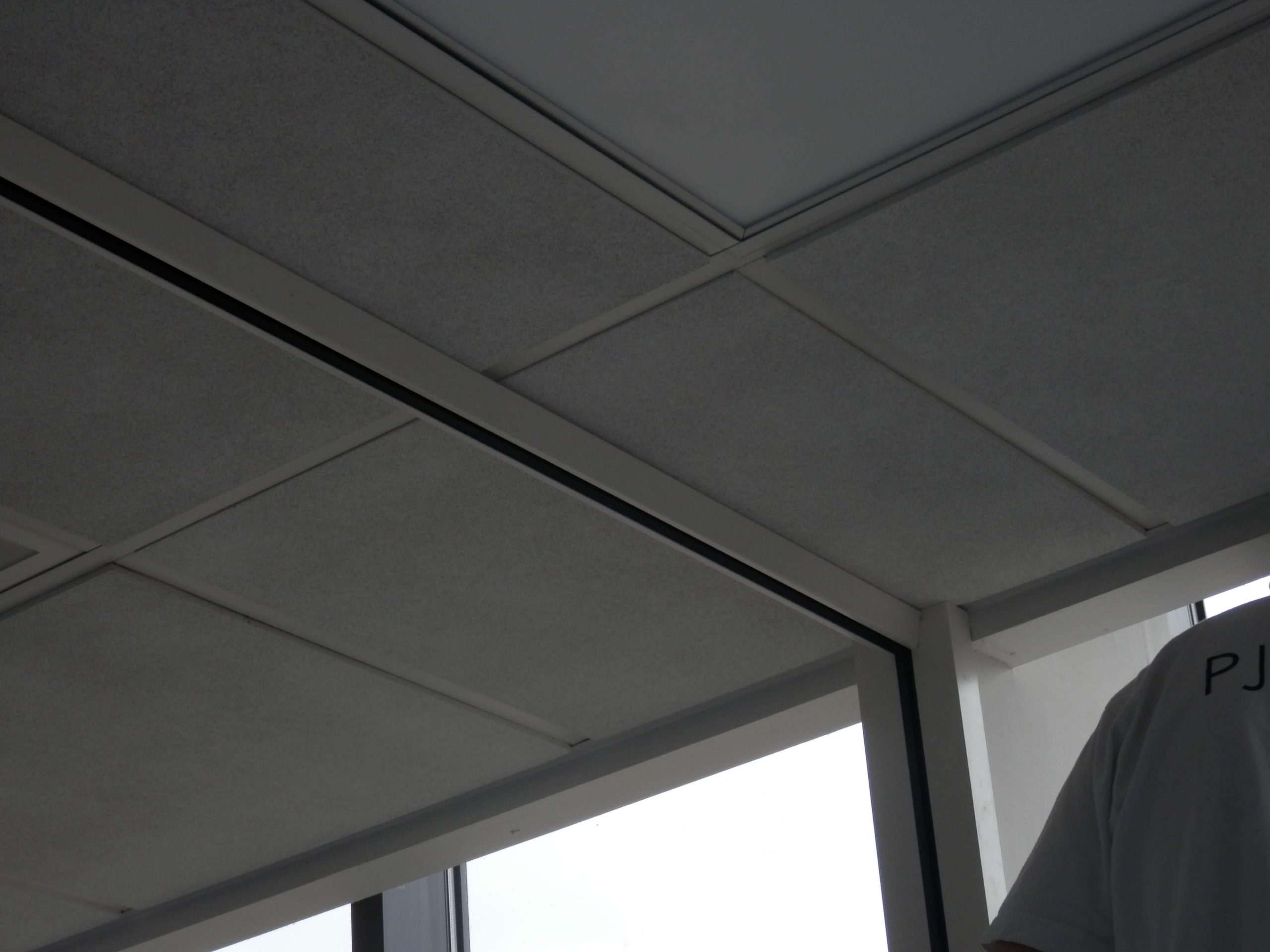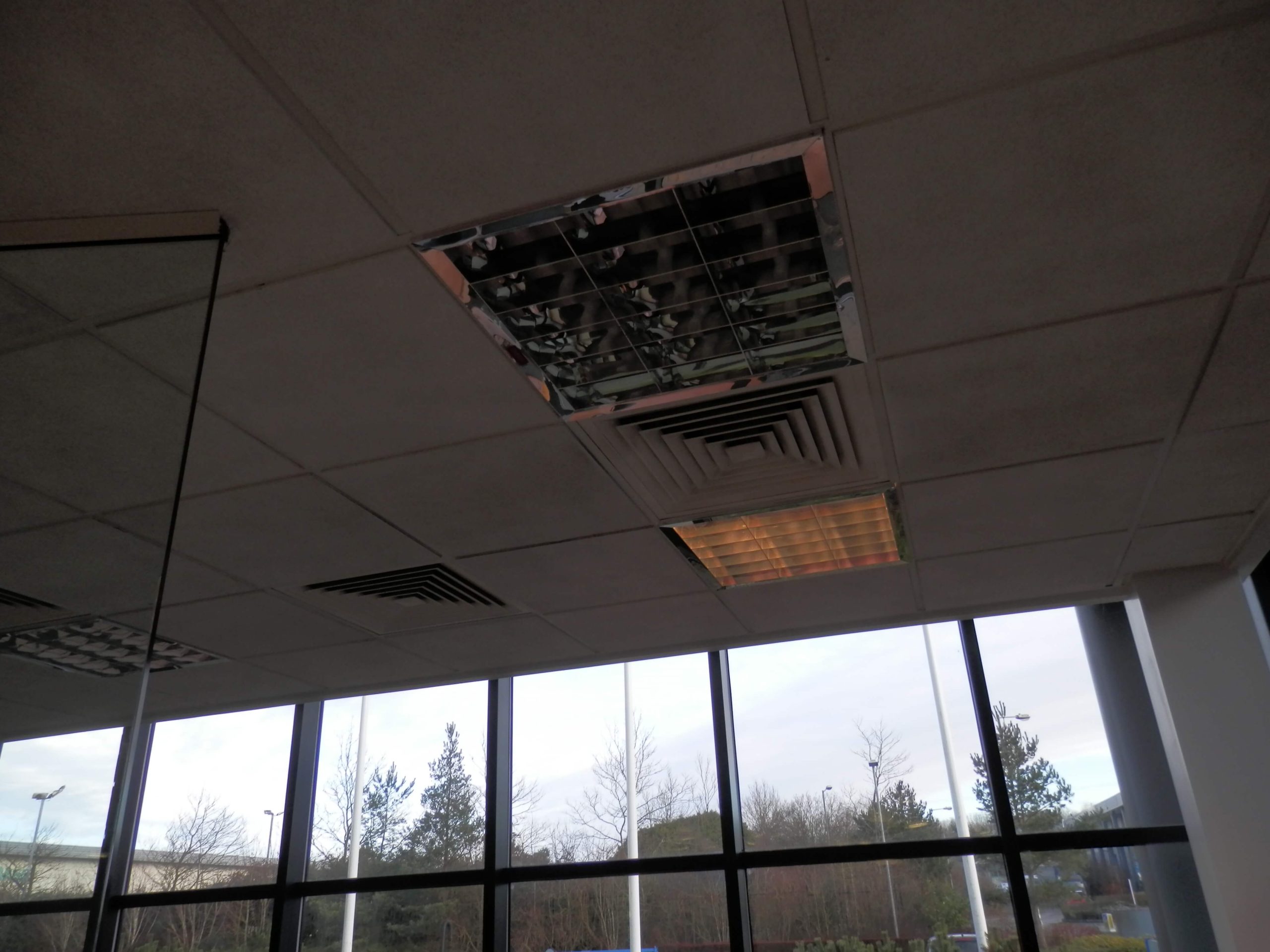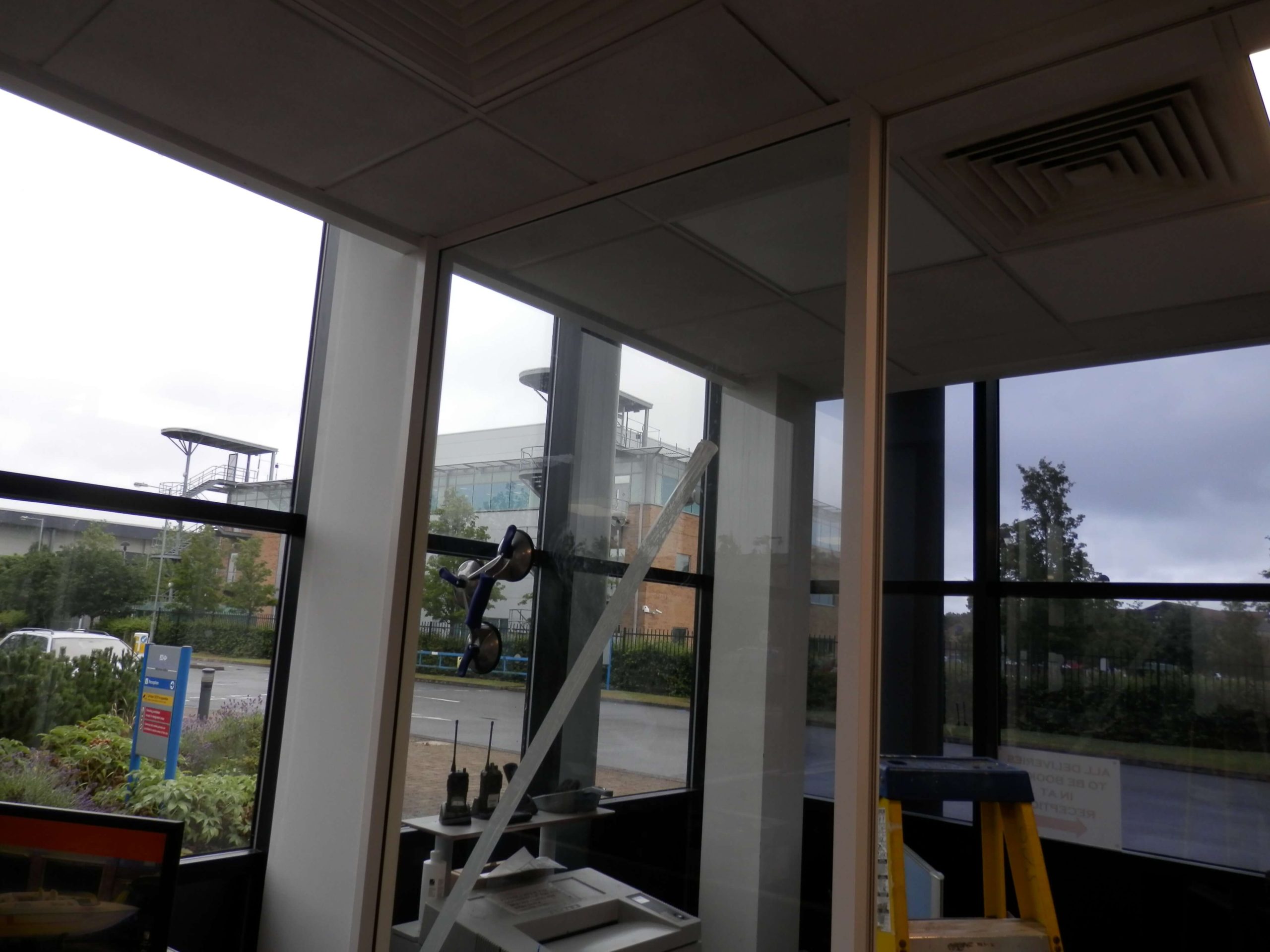 The partition to close off the existing area had to fix to an external window upright, and there was a gap between the suspended ceiling edge and the edge of the window. The customer also wanted to maximise the amount of glass used, so we used a glass partitioning system. The most expensive item was the glass door. Each panel of glass is individually measured to take into account the rake of the floor and the ceiling, and of course the door has to swing freely so it does not catch on the floor.