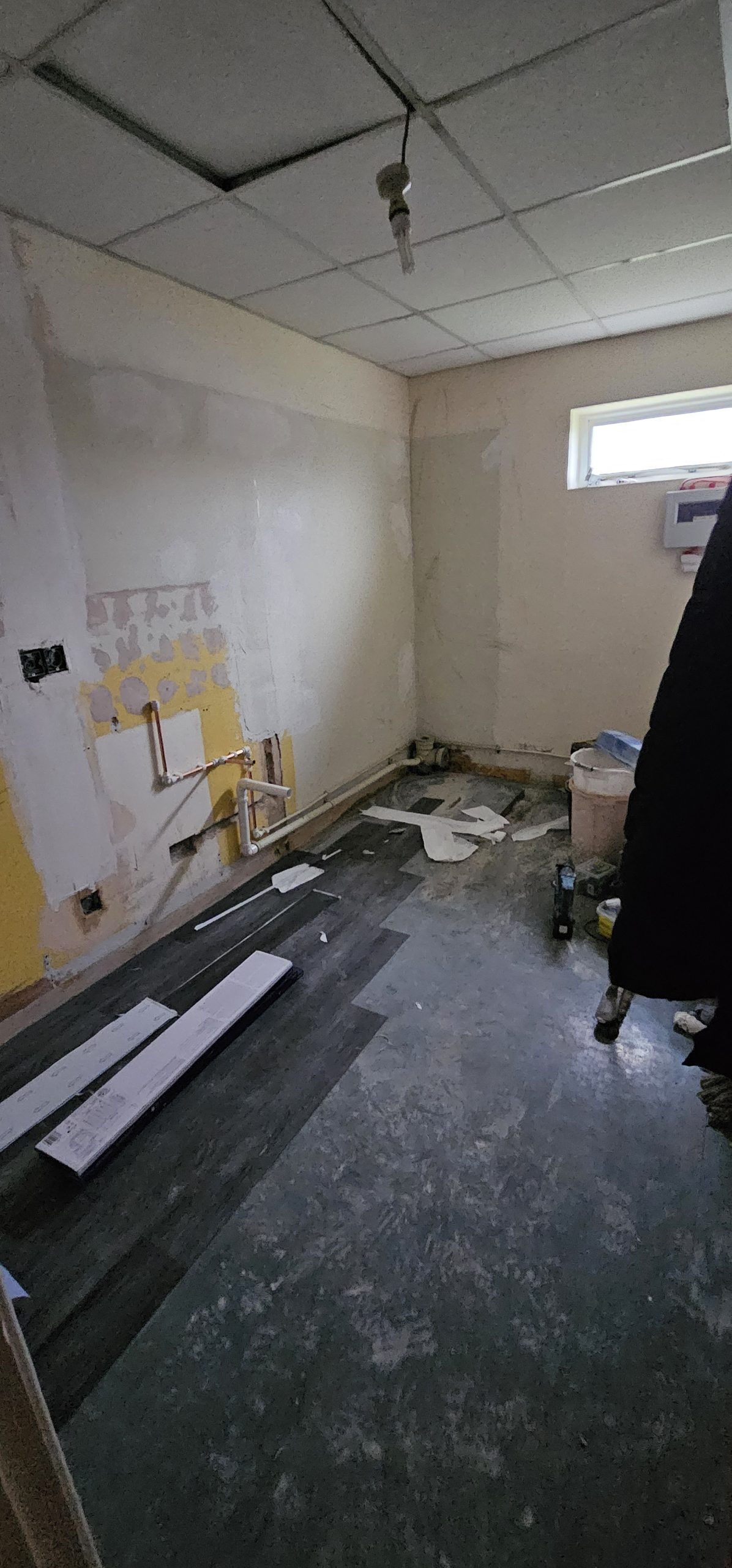We installed new electrical chasing into the walls for the kitchen before filling all the holes in the walls and making good ready for decorations.