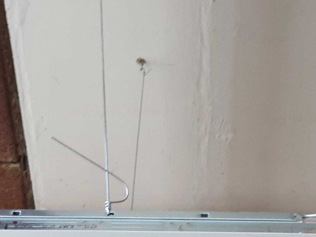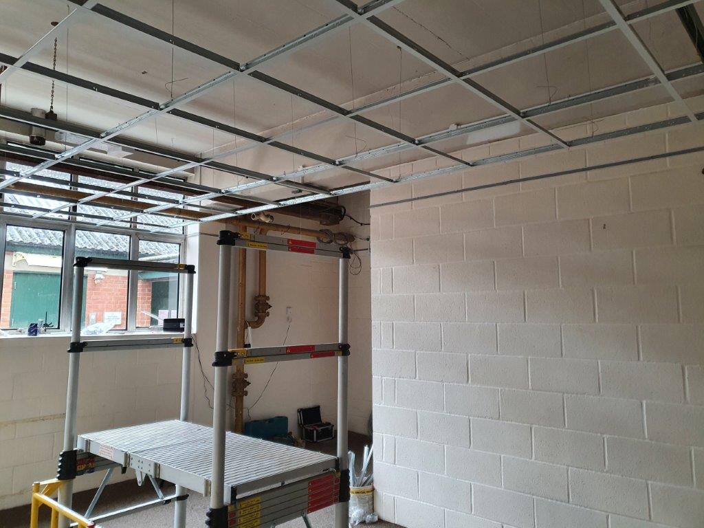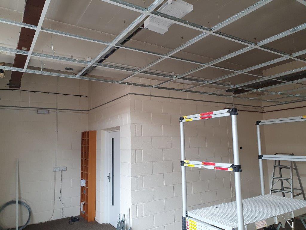 You will notice one of the photographs below shows a fire detector and red cable. This was connected to the building system so had to be repositioned onto the new ceiling once finished.