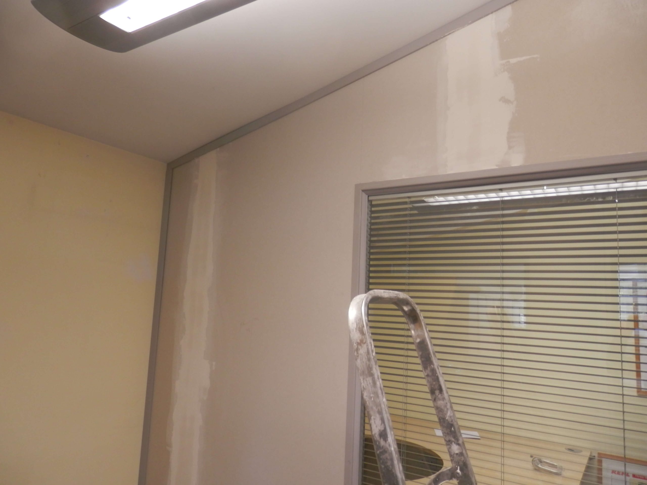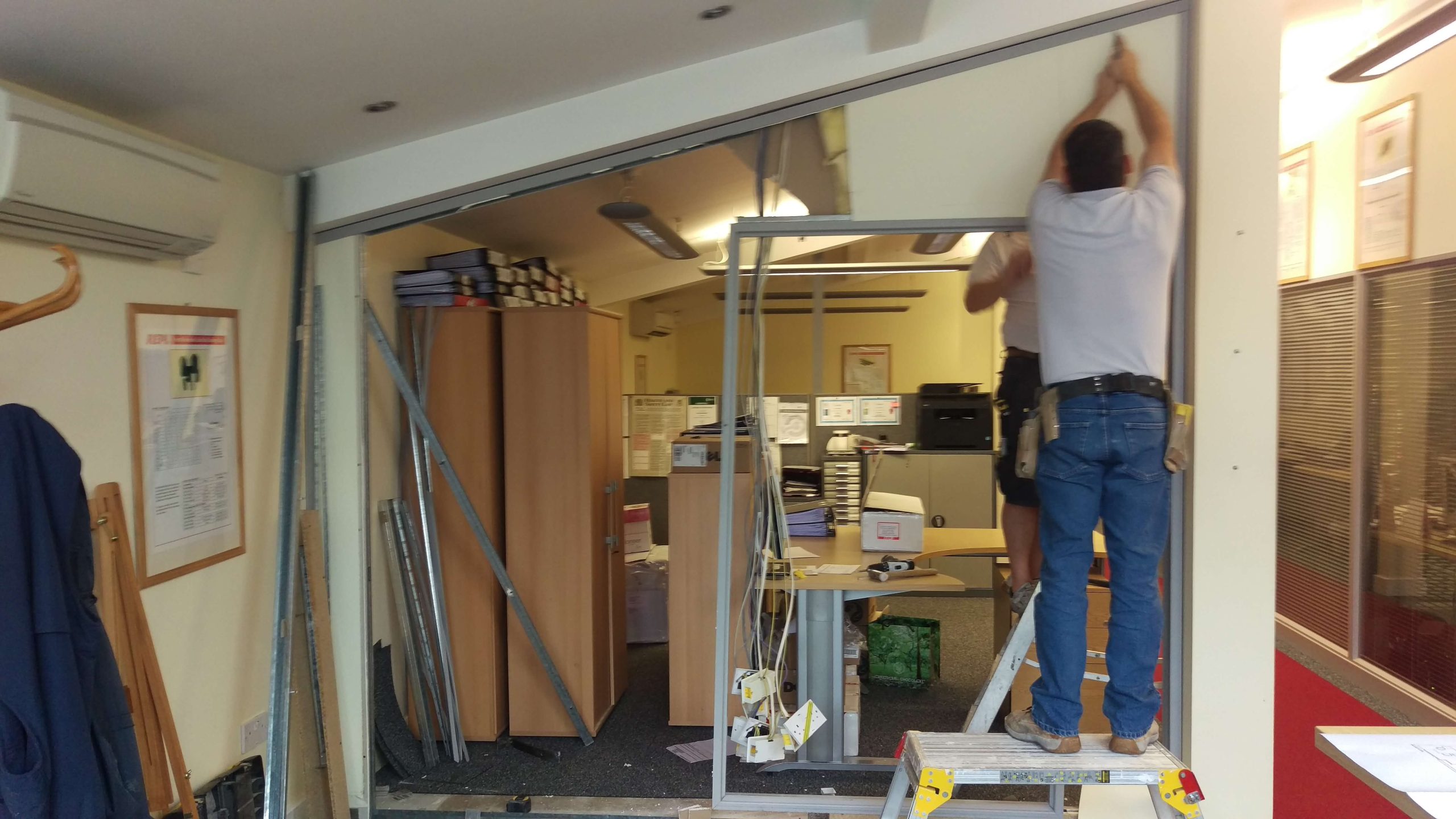 The photographs above show the wall to be re-used, we could re-use all of the grey aluminium parts along with the window frames, glass and blinds but had to replace the plasterboard and stud work inside.