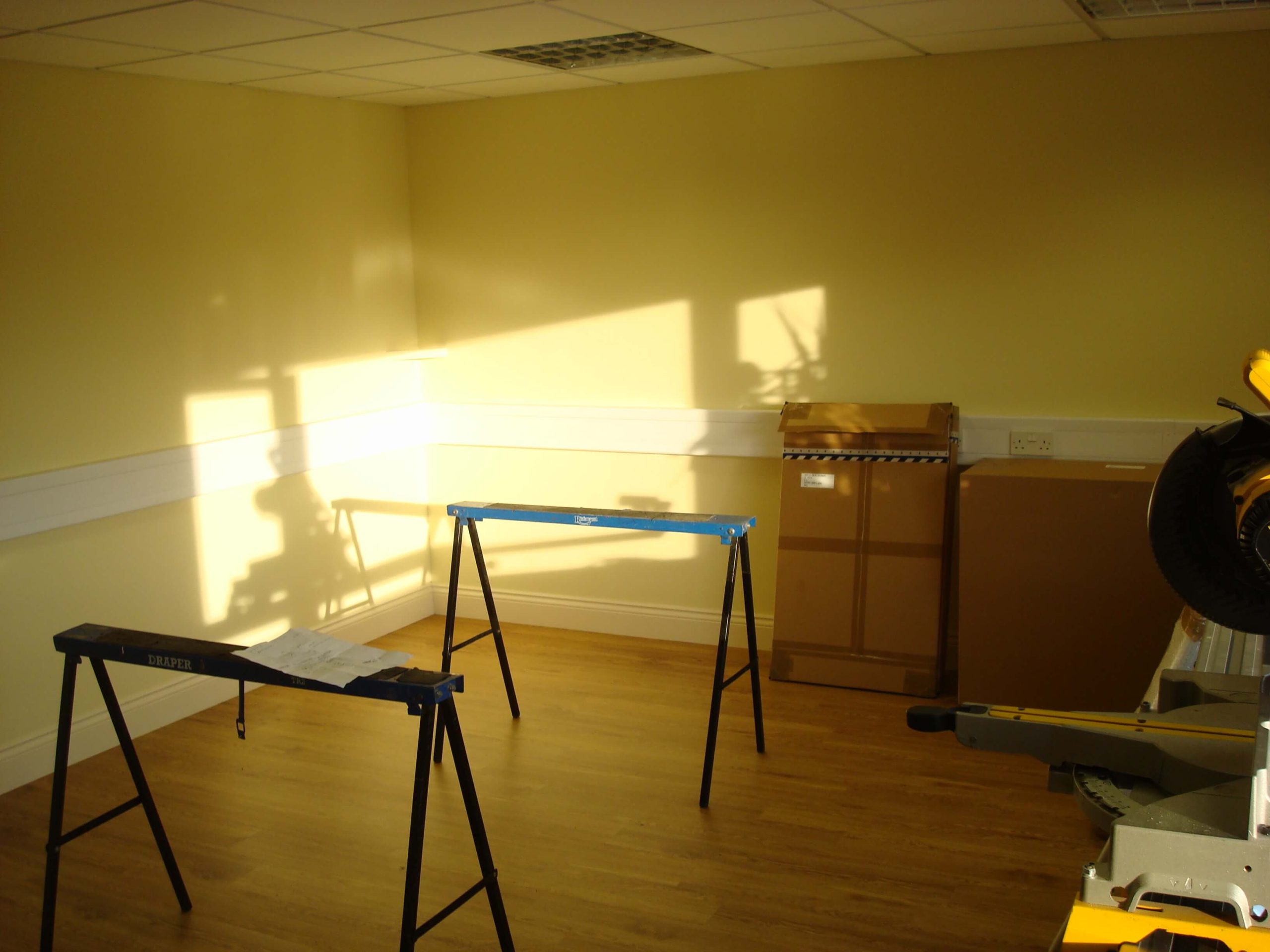 The main building is rented, and so a requirement from landlords is that the partitioning needs to be demountable. The condition of the existing space was pretty good, with cabling and lighting already in place. We did have to re- cable all of the Cat5 data and voice sockets to the comms cabinet position, as well as re-position power sockets in the perimeter trunking so that there appeared in the correct places. All we had to do was to fit some partitioning as well as some storage wall for the main meeting room. We also had to build a small kitchen.