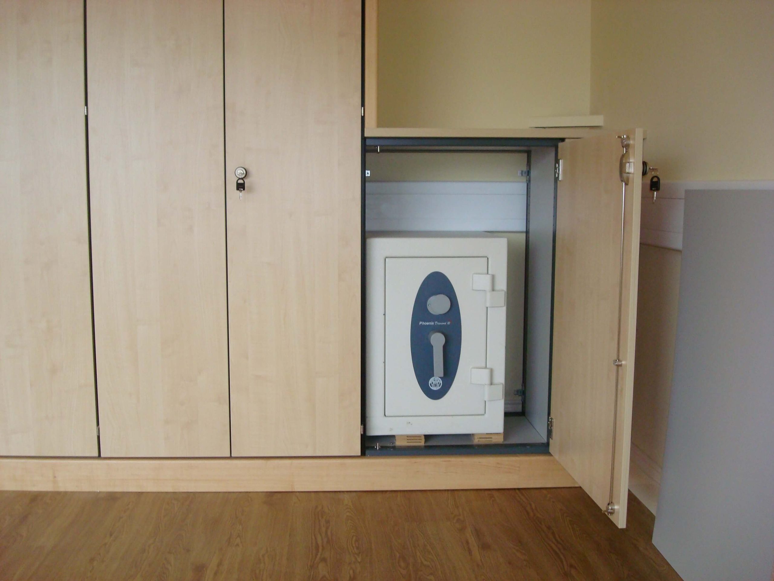 A metal framed version of the wall was chosen for extra strength. This also allows flexibility for shelves to be added and taken away as needed. It was important to integrate a safe within the cupboards for security. The added weight of the safe was reinforced for support. When the cupboard door is closed the safe is neatly hidden away in its own compartment.