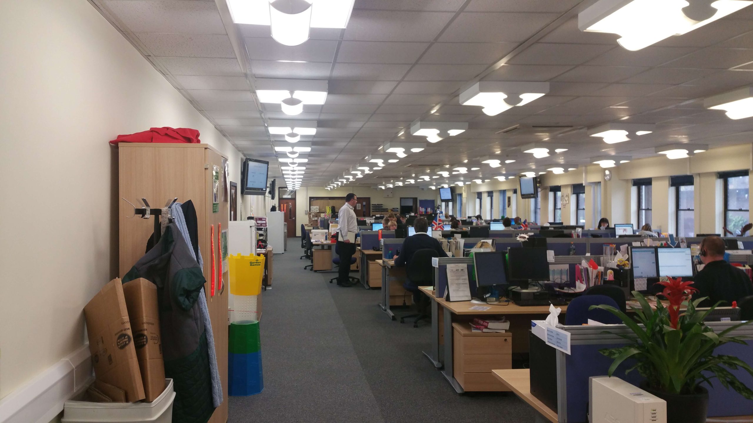 We had to take special consideration to ensure that we matched the existing carpets, light fittings and wall paint. A new wall and doorway at each end of the office had to be created to separate the office from the corridor and we needed to install new power and data sockets for the additional desks and the new printer and TV positions. Once drawn and the basic costings were agreed, we then looked into more detail on how to ensure the project didn’t disrupt the busy customer service department, how to minimise the dust from taking down the wall and how to co-ordinate the project to ensure it was completed over three weekends to meet the customers deadline.