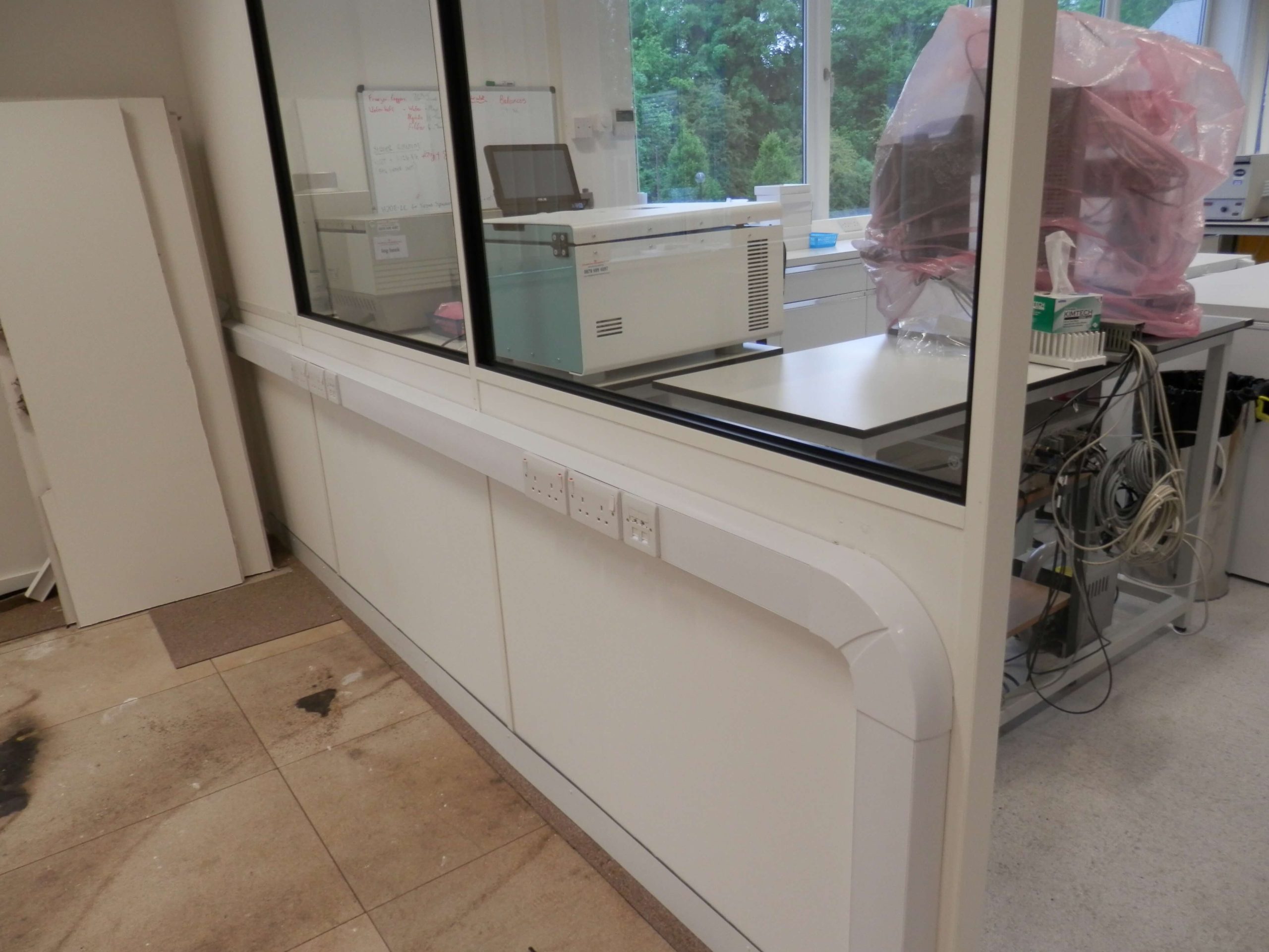 The glass front of the laboratory had large windows from table height to the ceiling forming the corridor. This line of wall needed to be extended further into the office space as shown on the drawing.