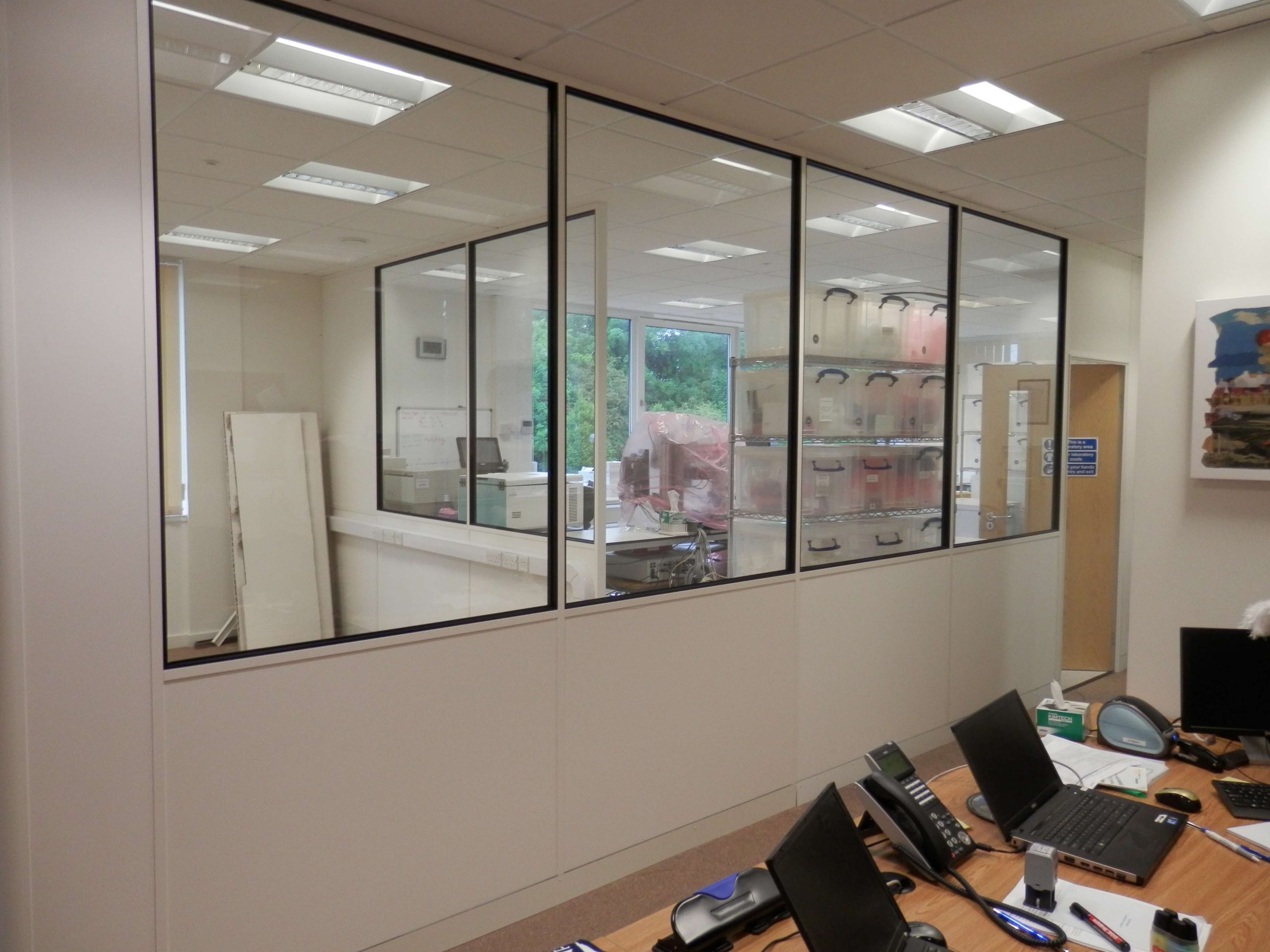 An office extension is a pretty simple thing to do for us to do. Our customer, J P Kummer, specialises in adhesives and wanted to extend their existing laboratory which was constructed from demountable partitioning. (If you want to know what demountable partitioning is please click this link). Unfortunately we could not simply take down the partition as the electrics that was fitted to the partition wall had to be moved.