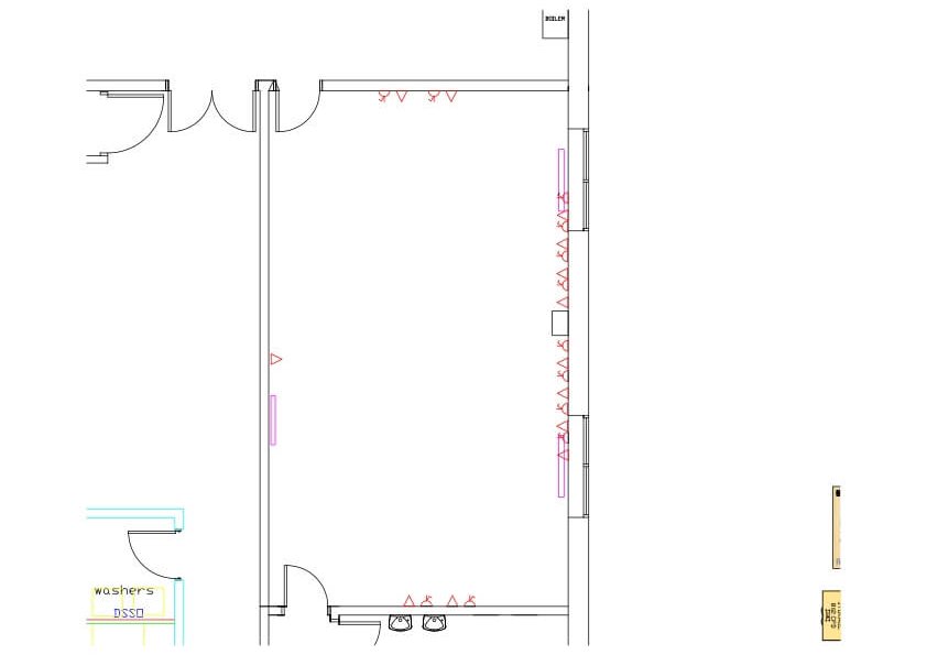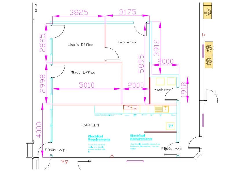 We produced many drawings for each of the areas that we had to work on. This included work to the front offices, so they needed power and data, lighting, repairs to the suspended ceiling and new carpet. Other areas included: