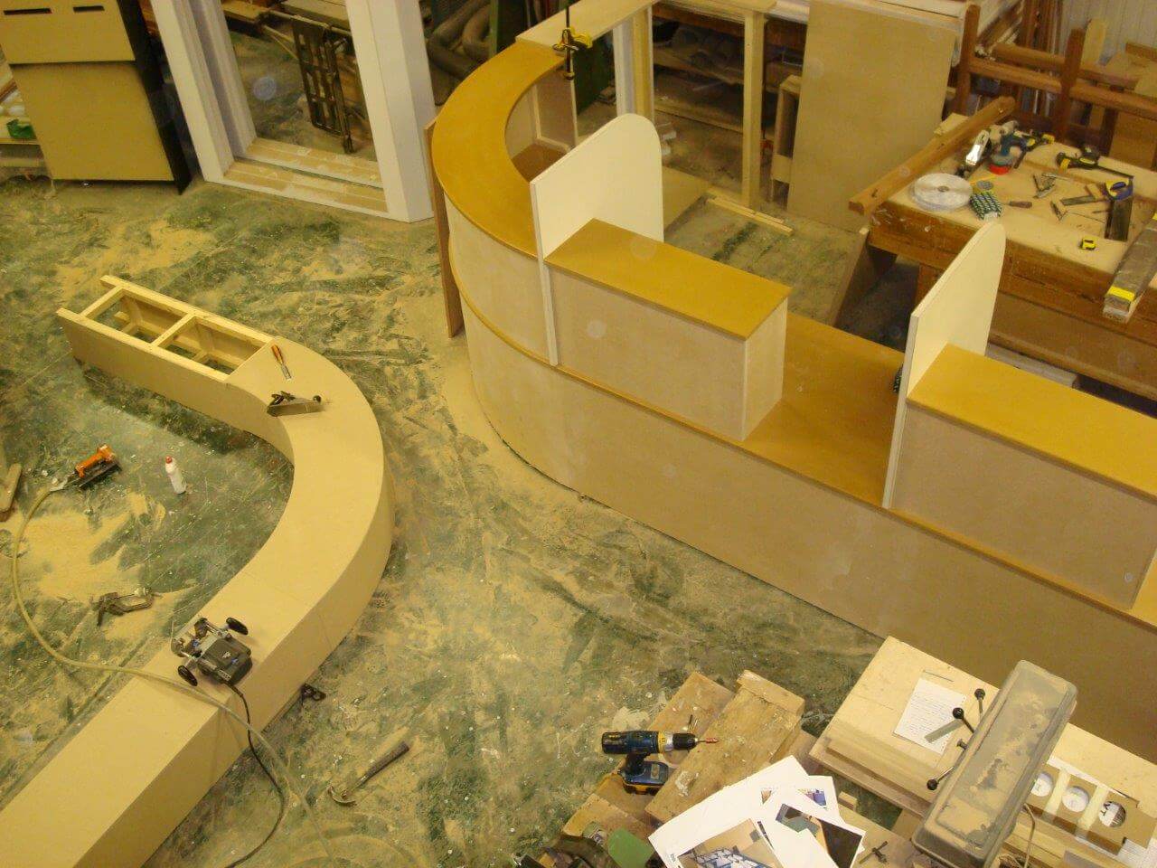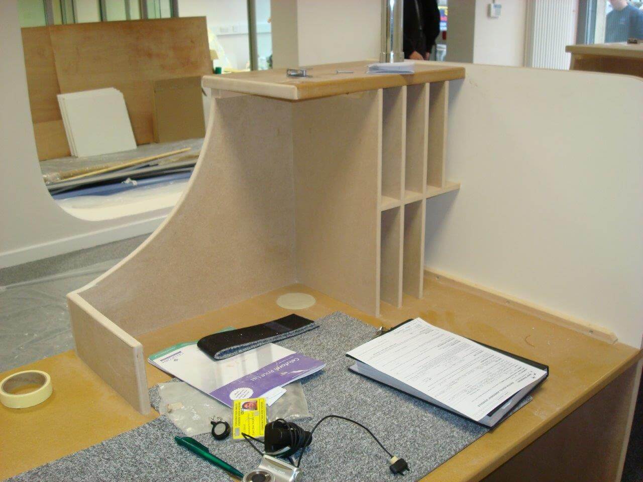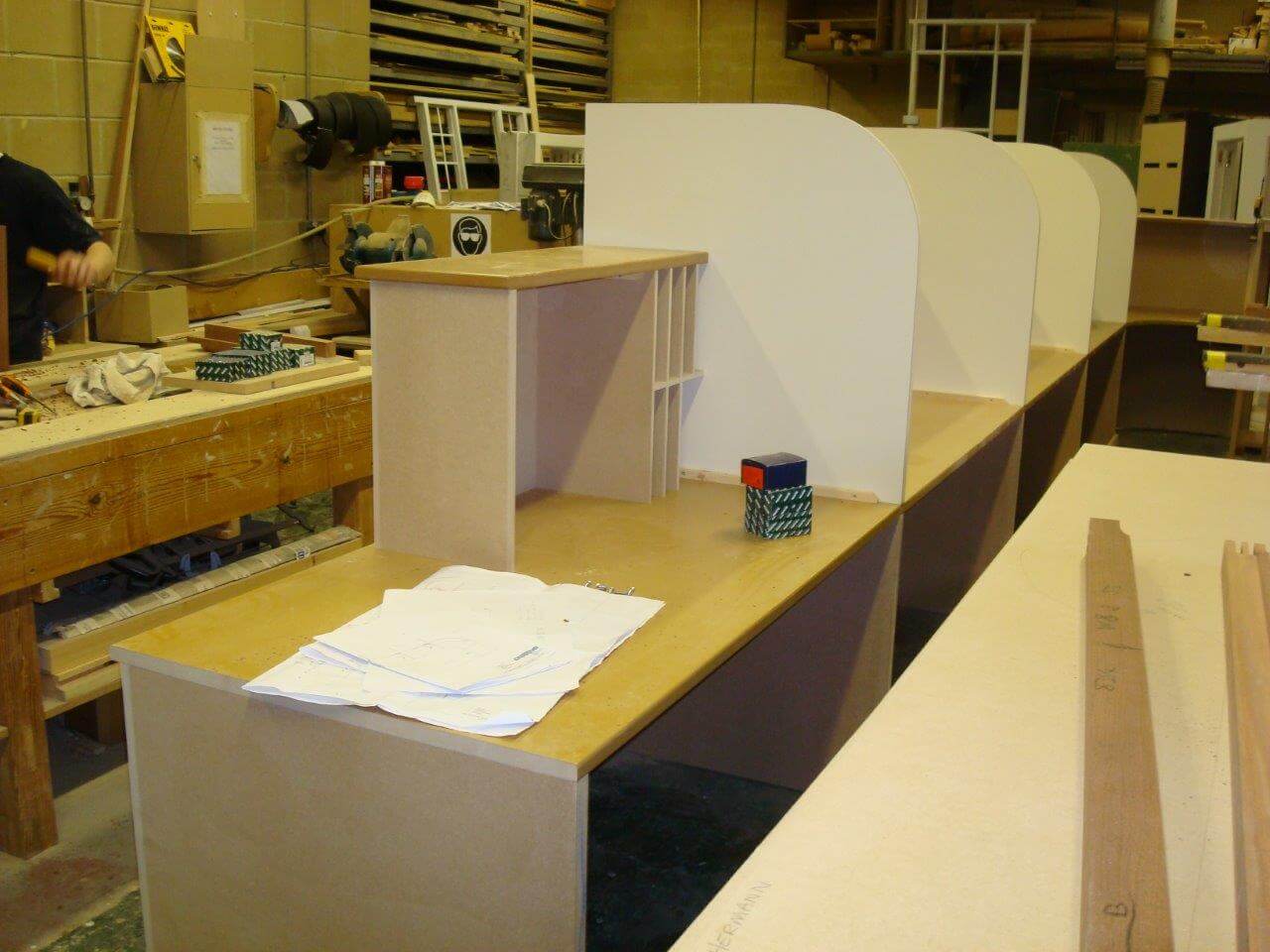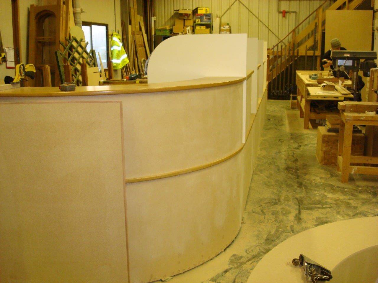 The way to make this size of reception desk is to make it off site in the workshop and then assemble it on site.