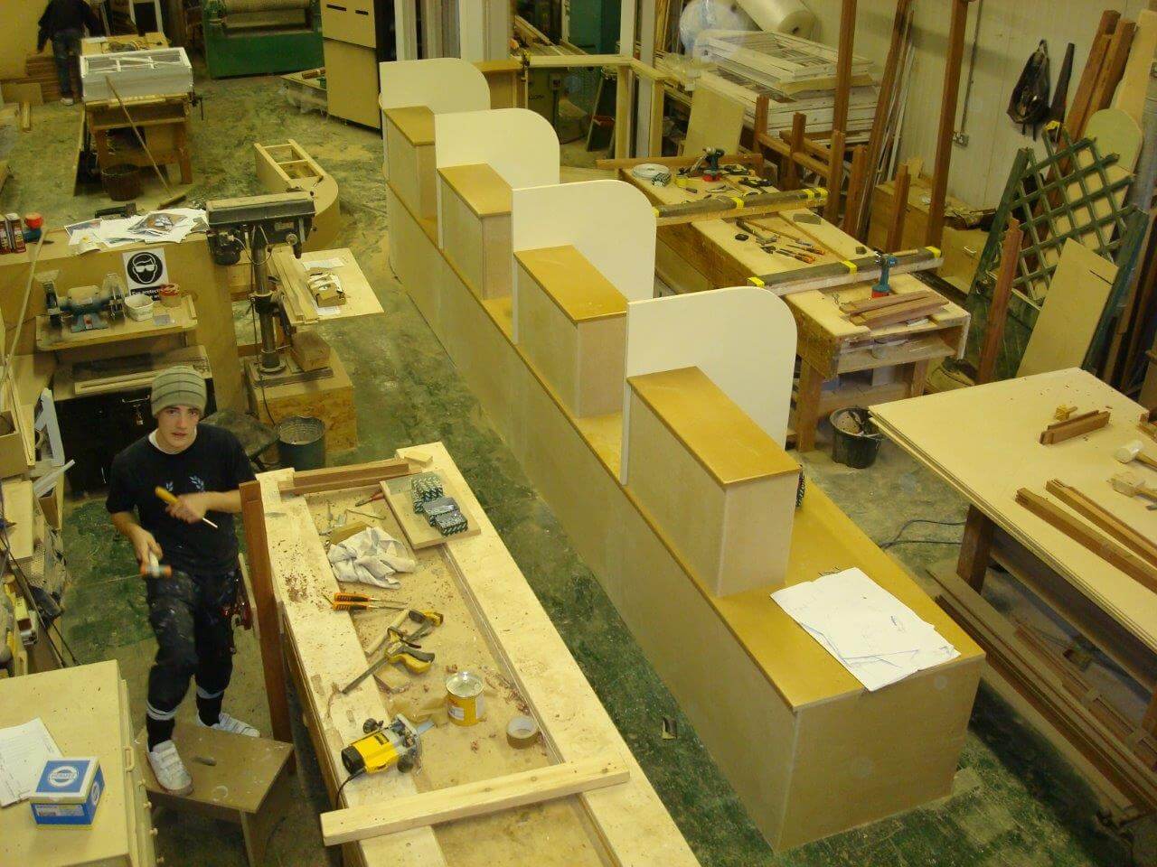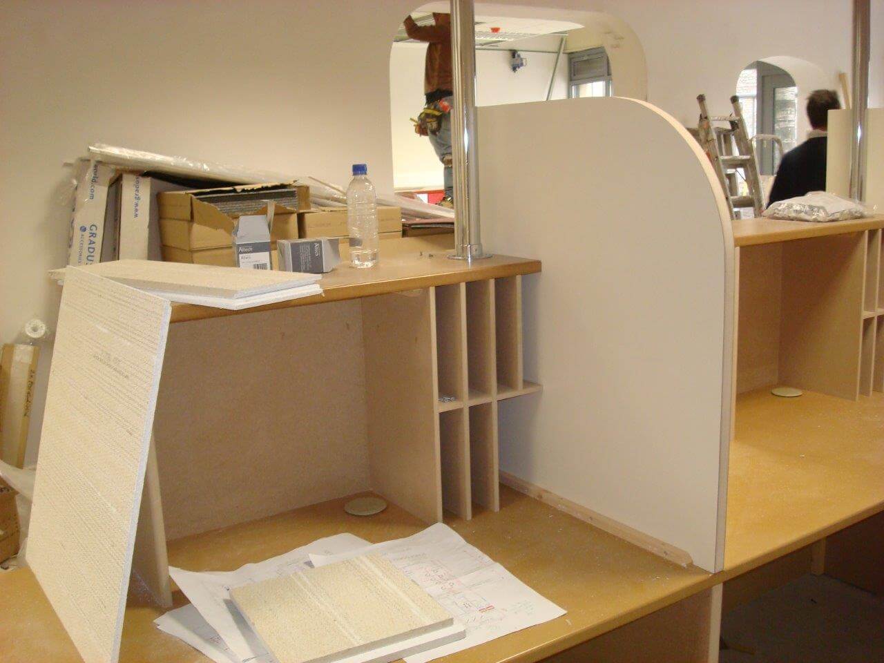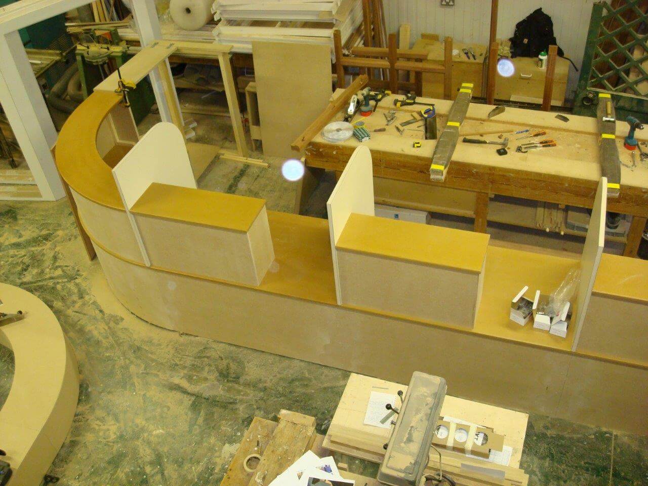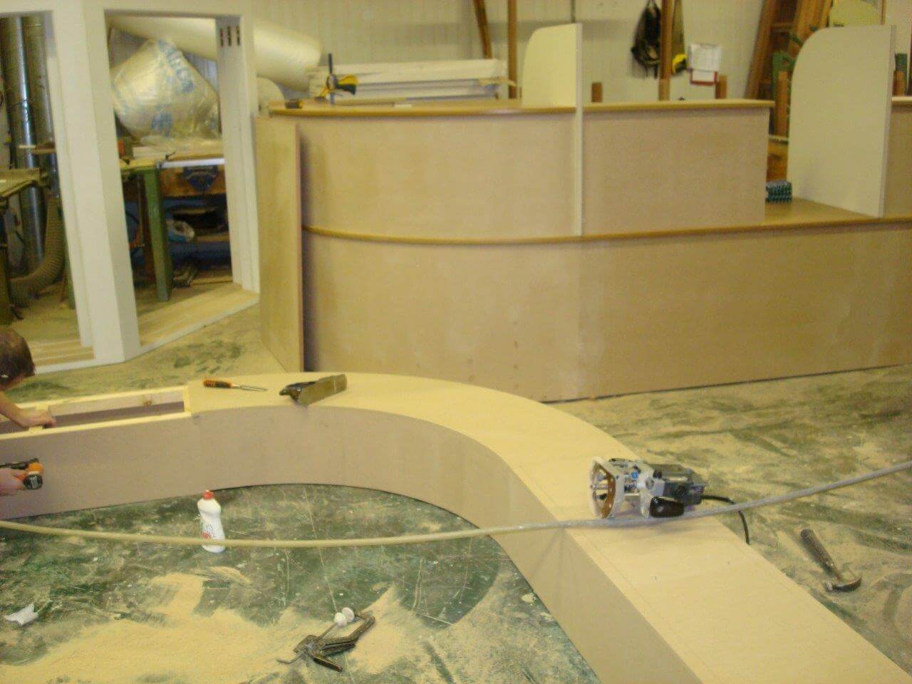 The way to make this size of reception desk is to make it off site in the workshop and then assemble it on site.