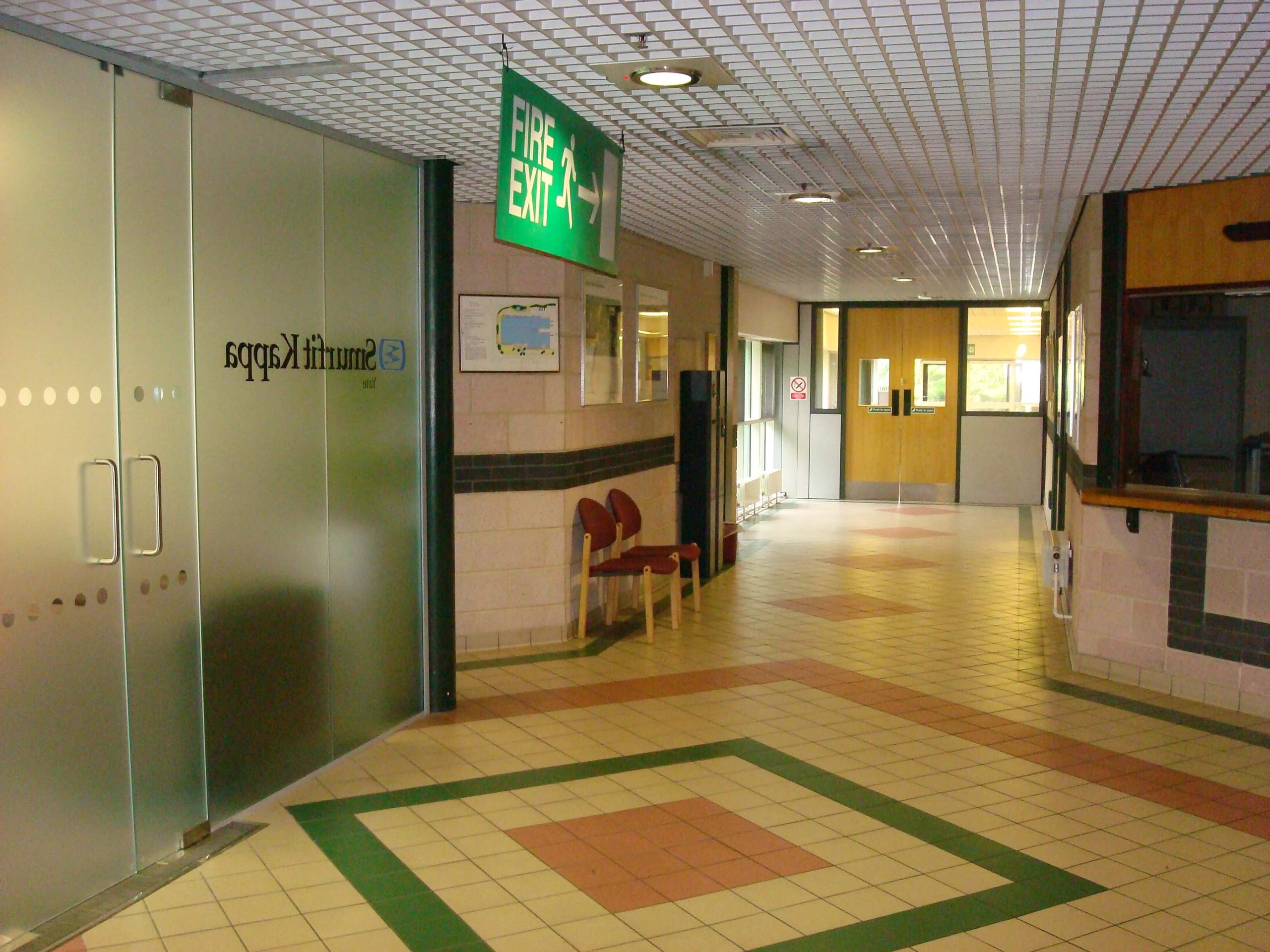 The total open area was vast, dominated by an open egg crate ceiling, dull lighting, brick walls with a dark oppressive atmosphere, and a dated looking ceramic tiled floor with a mosaic of colours pinks and dark greens. The reception office was situated in a brick built room at the far end of the open foyer area.