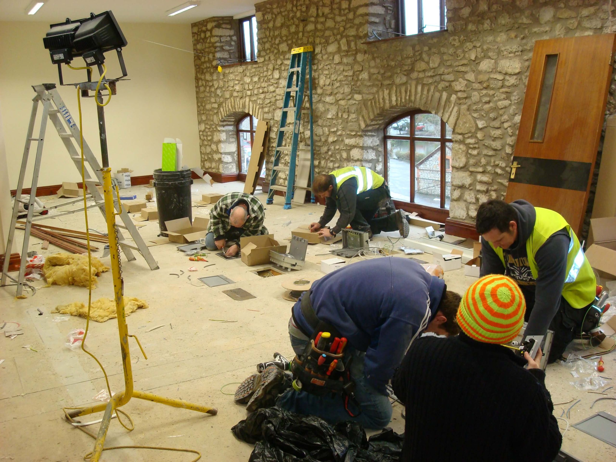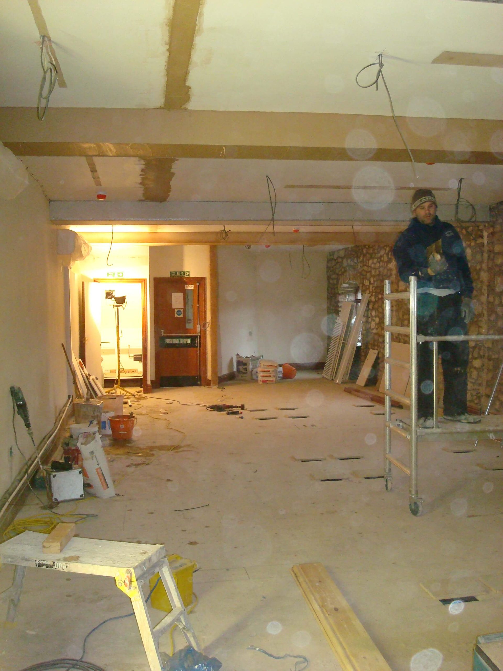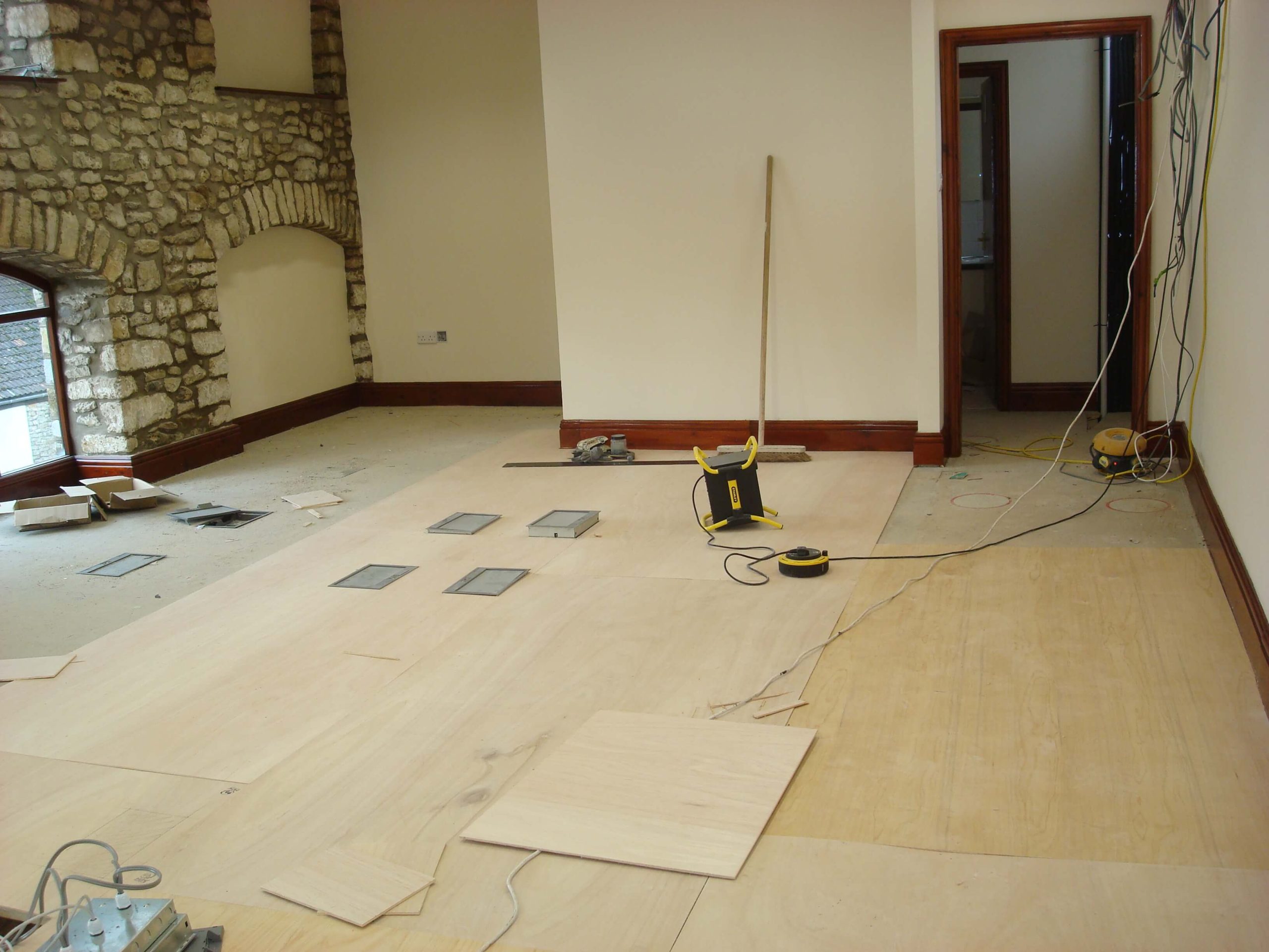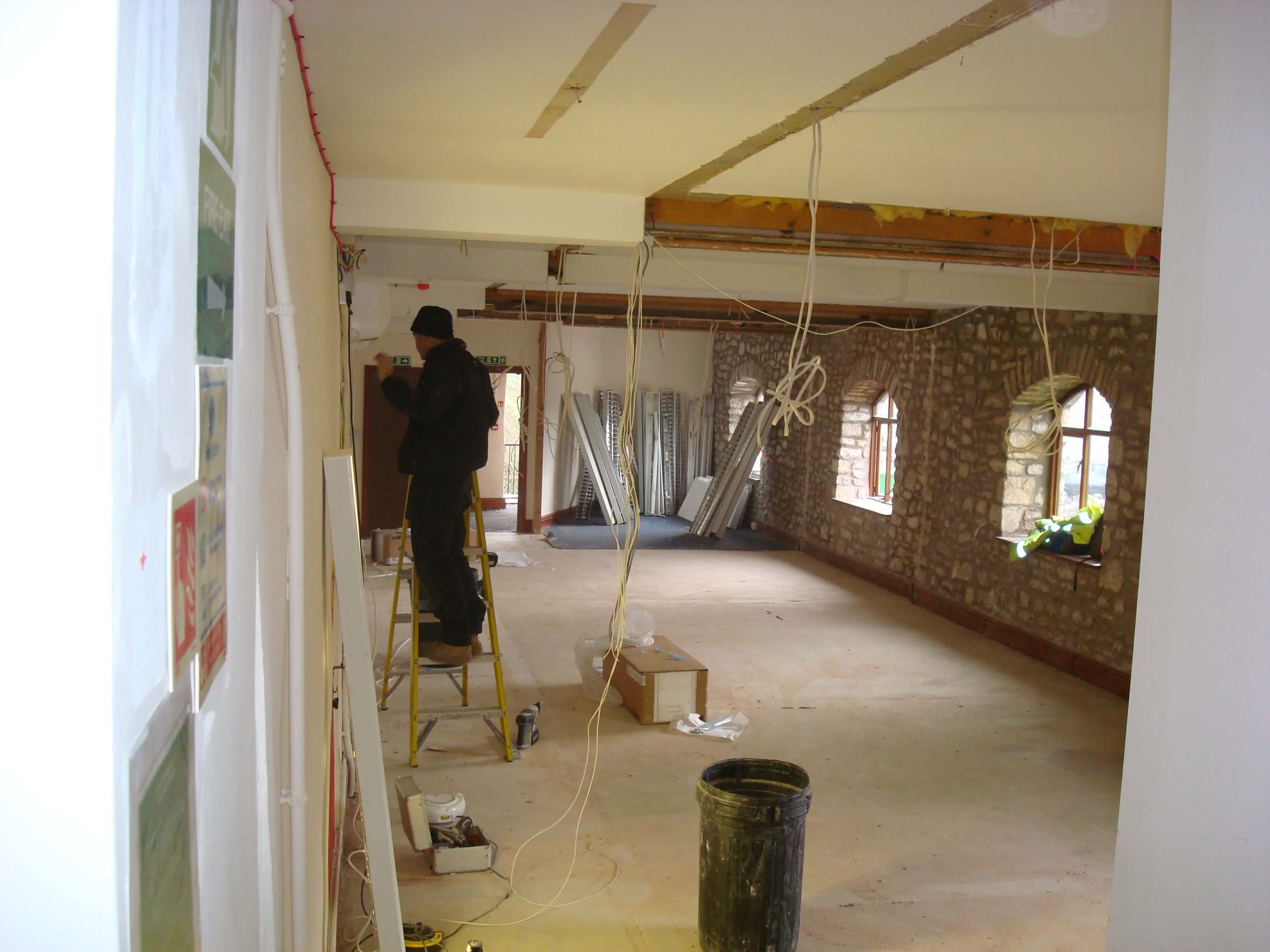 Cre8tive was asked to tender to carry out an office refurbishment in a 3 storey building in Shepton Mallet. Having successfully won the project, the next problem was how to carry out the work in a relatively short space of time, over the winter months with snow on the ground and no heating until the air conditioning was commissioned. The building was not a traditional office, in that there were no suspended ceilings (and not the height to fit any), and no raised floors, and the customer wanted lots of walls removed as well as fitting CAT6 cable into floor boxes in all of the floors.