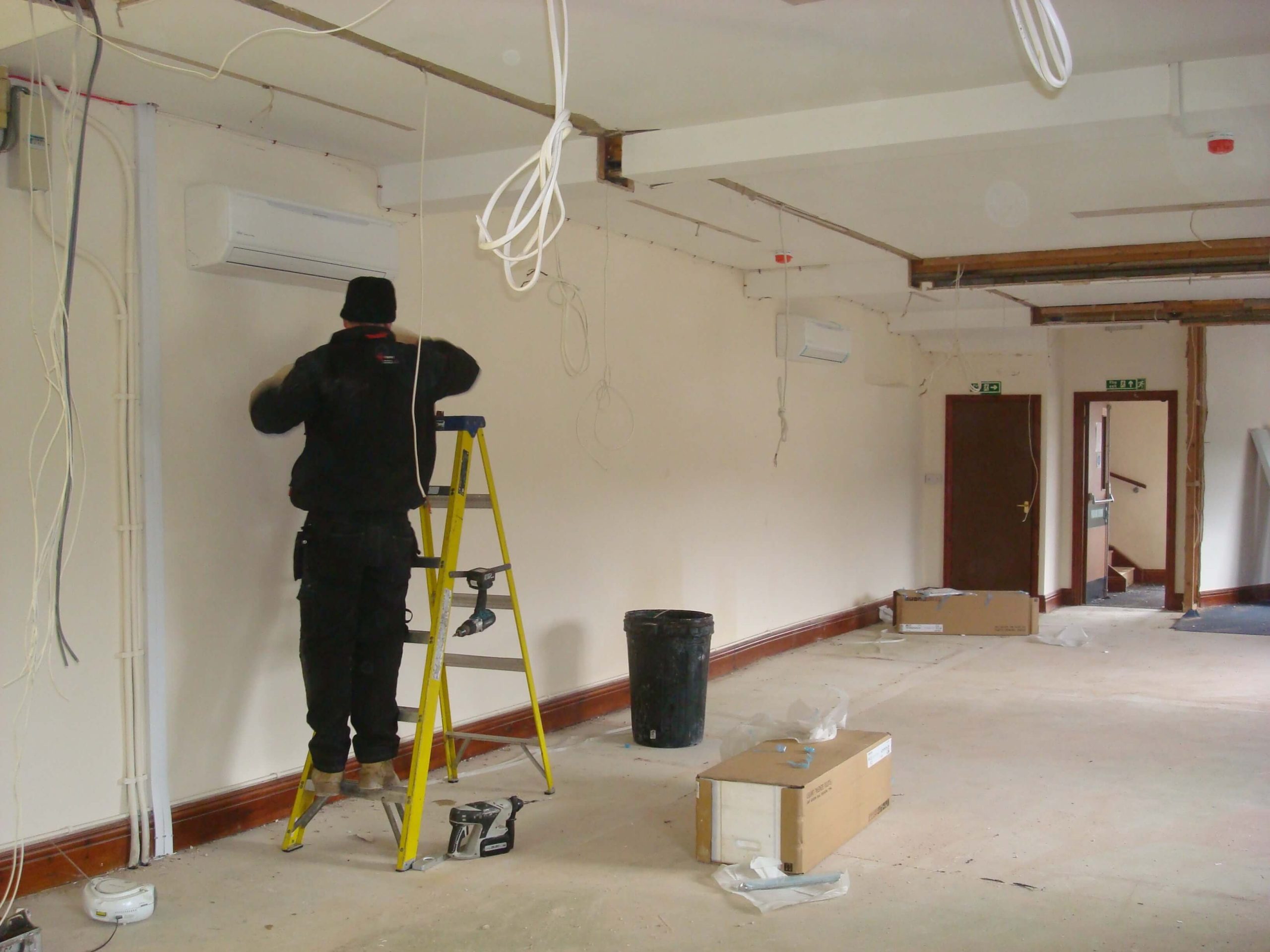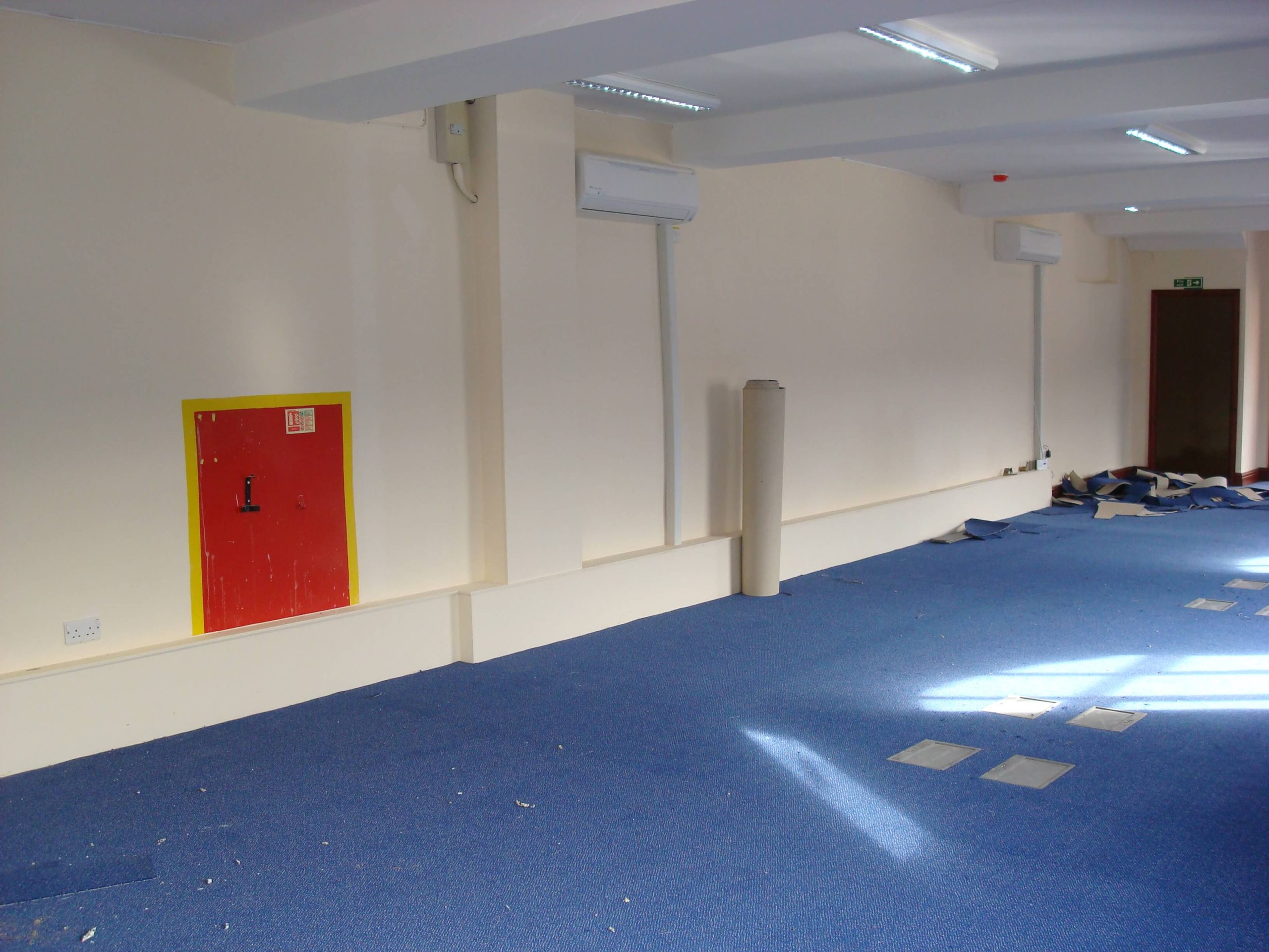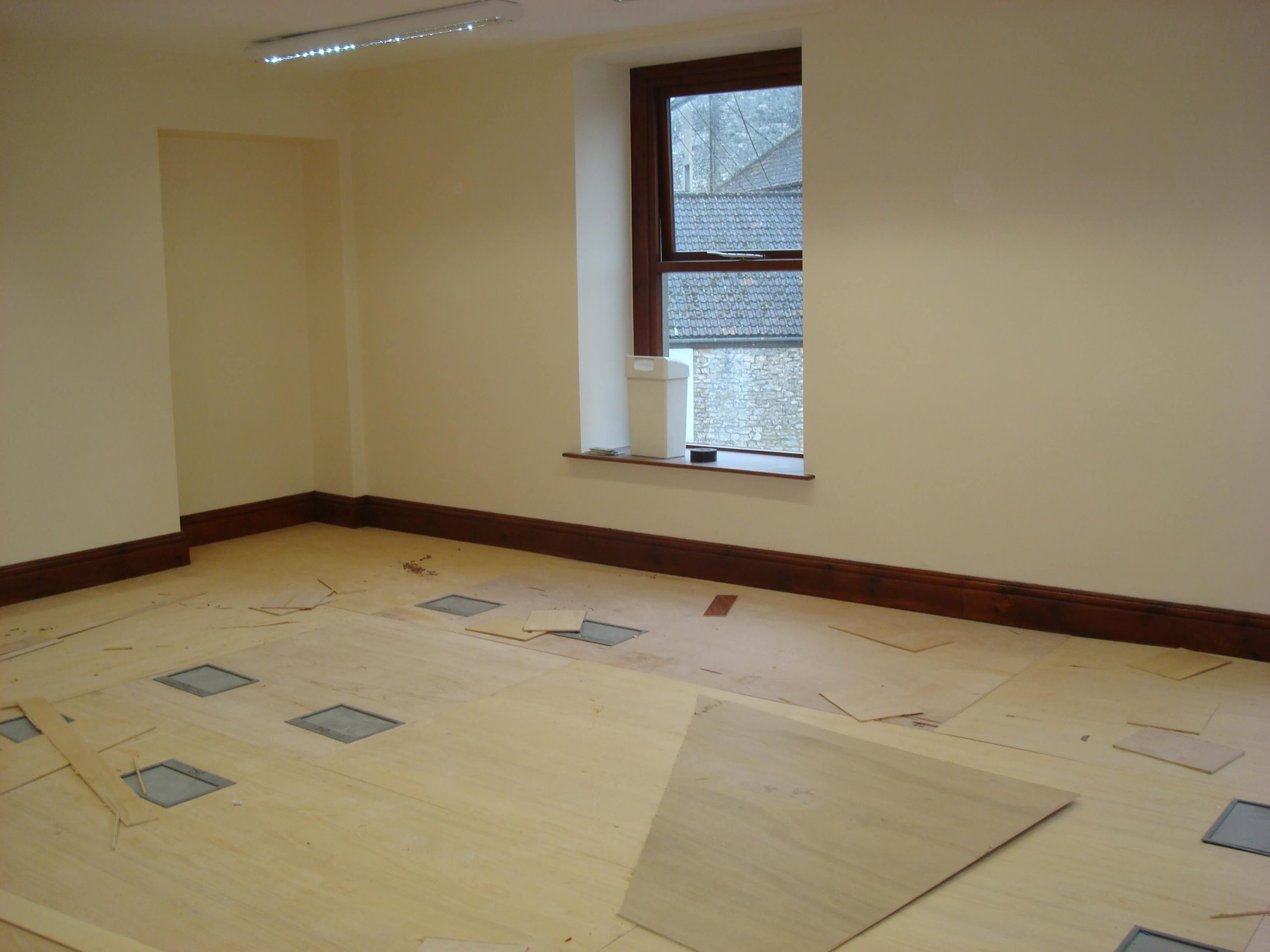 Cre8tive was asked to tender to carry out an office refurbishment in a 3 storey building in Shepton Mallet. Having successfully won the project, the next problem was how to carry out the work in a relatively short space of time, over the winter months with snow on the ground and no heating until the air conditioning was commissioned. The building was not a traditional office, in that there were no suspended ceilings (and not the height to fit any), and no raised floors, and the customer wanted lots of walls removed as well as fitting CAT6 cable into floor boxes in all of the floors.