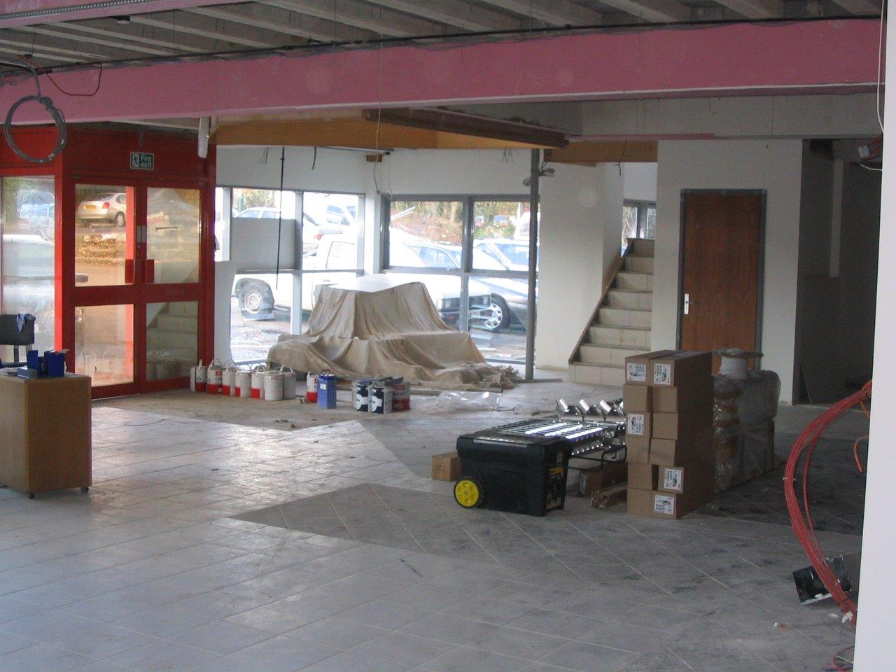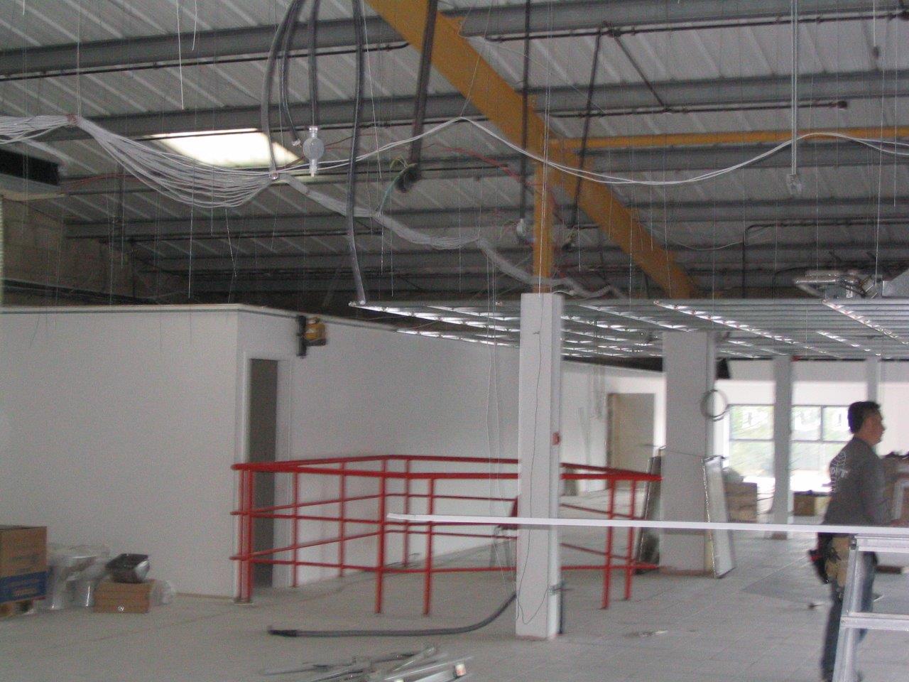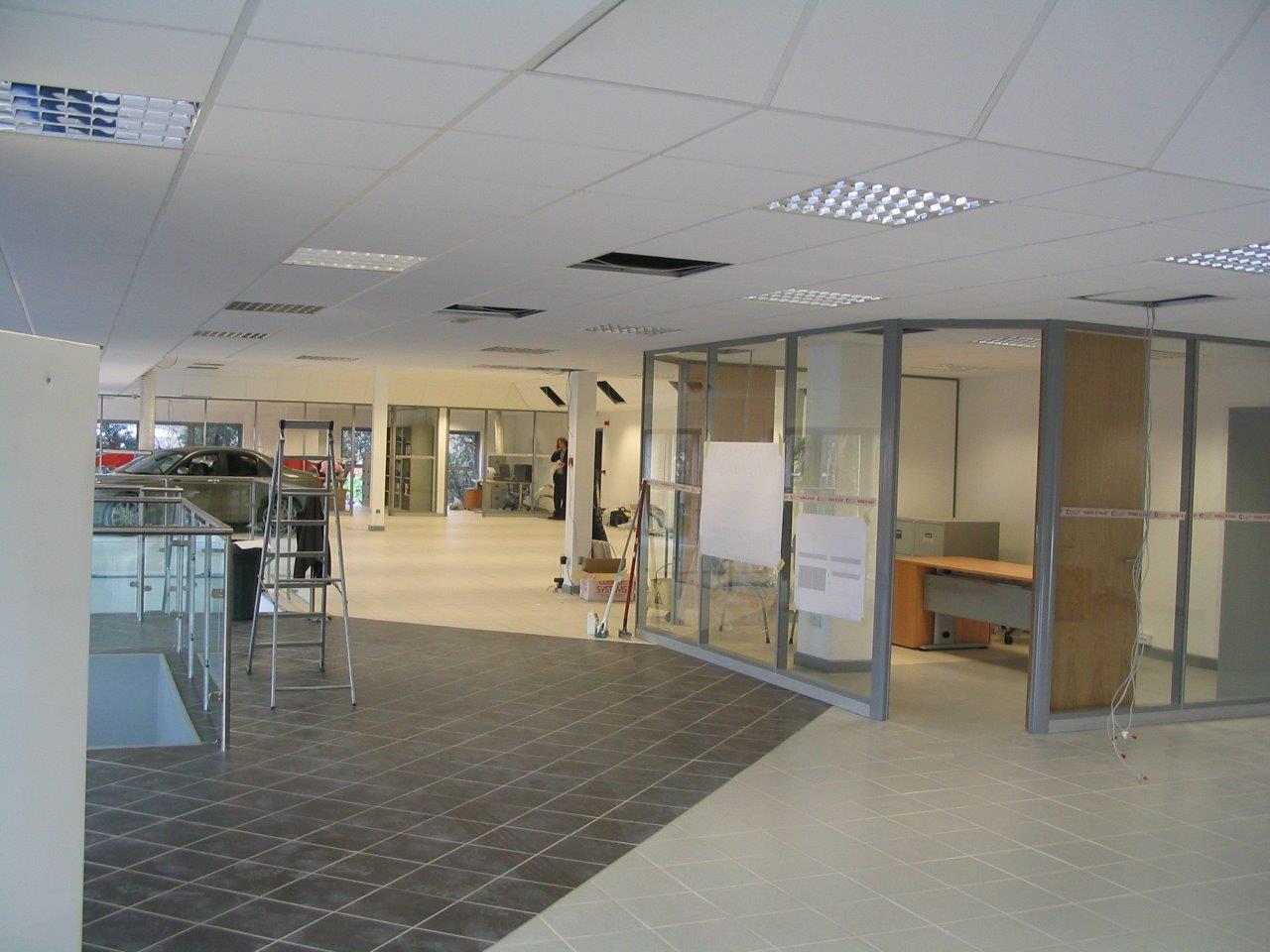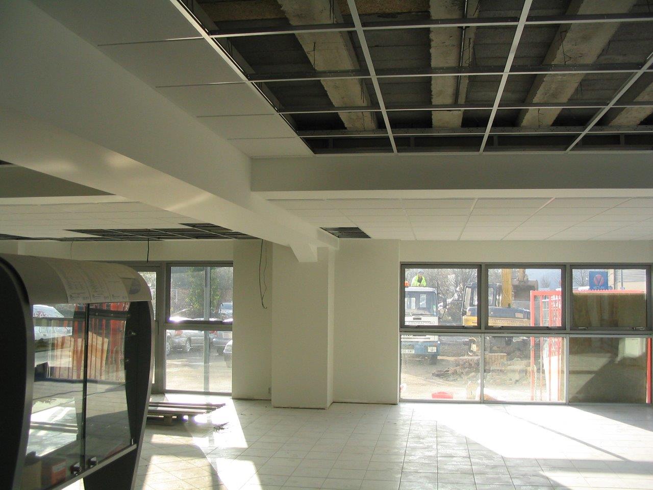 The upstairs ceiling was actually very complicated to do as the customer wanted to maximise the head room upstairs but it was not possible to raise it completely due to the edges of the building. We therefore set another ceiling higher, beyond the outer edges. The difficulty with this is in lining up all of the grids so that it would look right. In the time allocated to do the upstairs ceiling, a good 25% of the time nothing was actually built, the time was spent setting out the dimensions and working out all of the angles. As you can see we left some of the tiles out so that other services could be fitted, but if you are ever in Chippenham, please visit the Chippenham Motor Company and you will see what we mean. (They also sell cars).