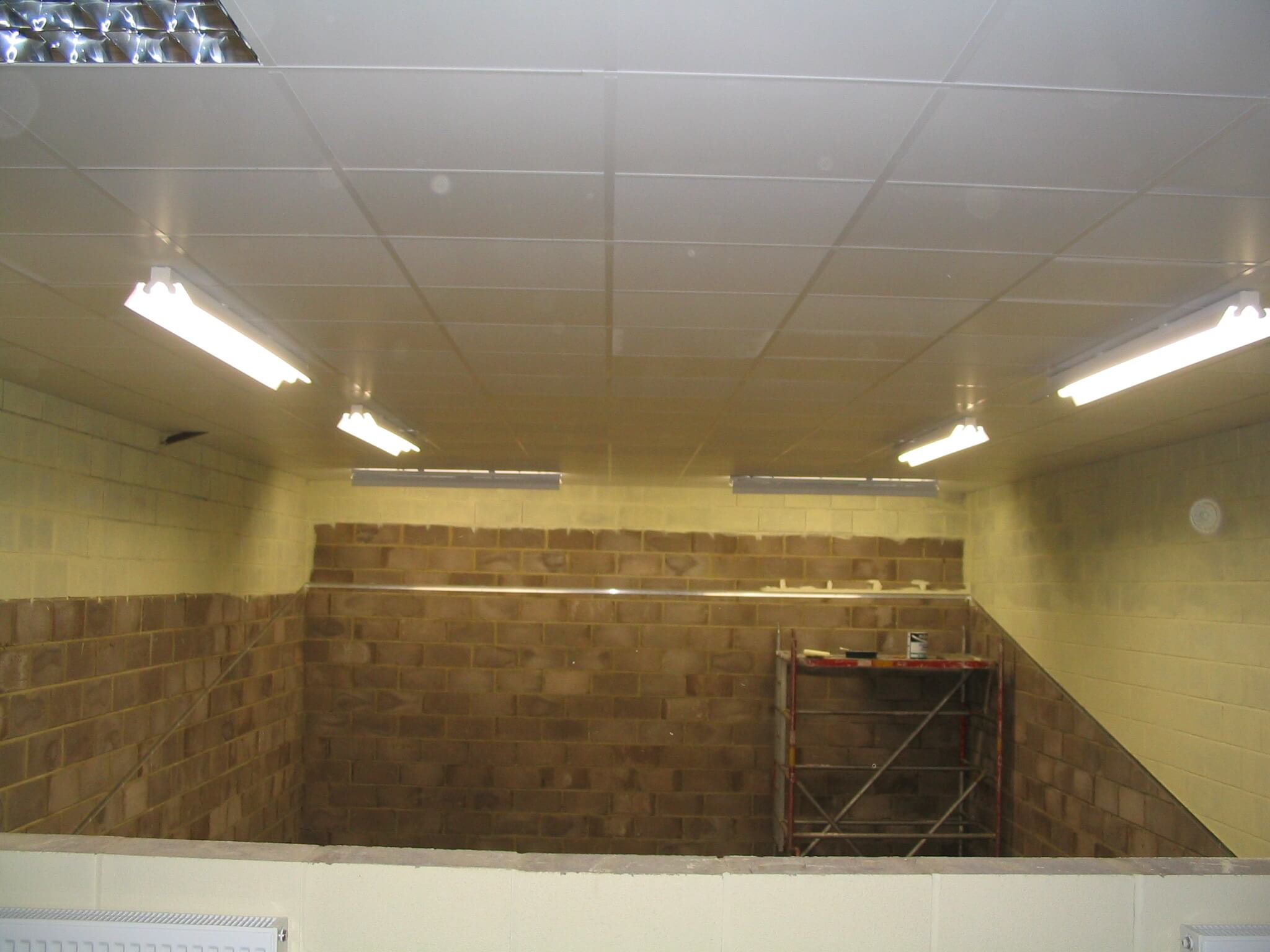 We fit all our suspended ceilings in with a laser, so the surface is completely flat. We also give advice on certain types of tiles as you can fit a cheap ceiling but the actual tile may not be correct application. In this case a standard mineral fiber tile would not have lasted, and as the squash court was in an outbuilding, there was a chance of moisture getting into the tiles. As soon as moisture gets into the fibers the tile will sag and you will see shadows on the corners of the tiles.