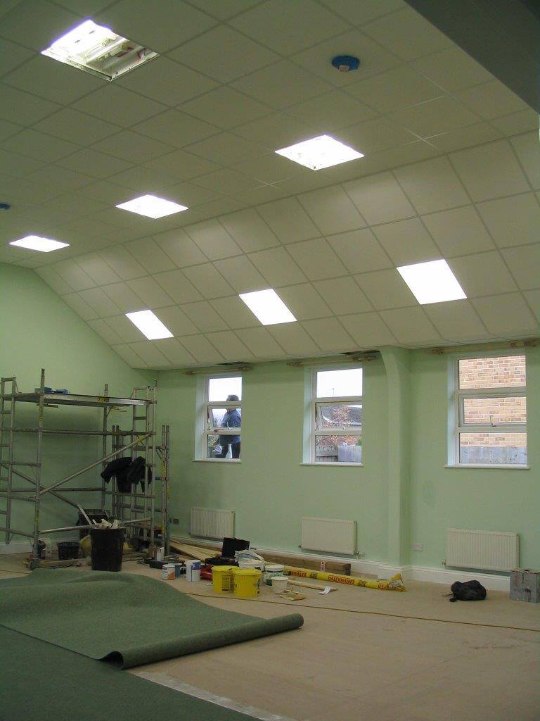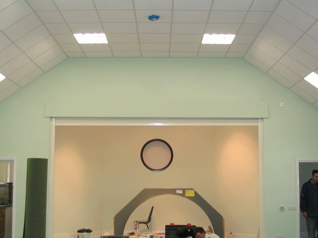 When we visited the church initially the problem they had was that it was very cold and they had some problems with the other areas out the back of the main hall as well. We could have run a suspended ceiling right the way across the hall level at one height. It would have been easy to do and cheaper. There was actually quite a bit of height in the slope of the roof so we suggested we follow the line of the roof and try and get the ceiling as high as we could.  We also suggested a special ceiling tile with high insulation properties which the church went for.