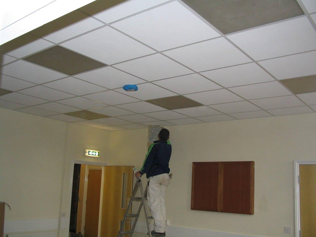 There are many offices with old fissured tiles, with sagging tiles and a mottled grey look they make the office look very dated. We like to fit nice white clean tiles to give a fresh look.