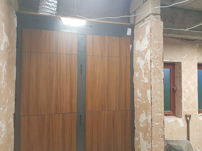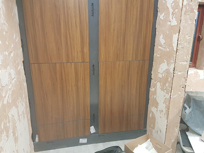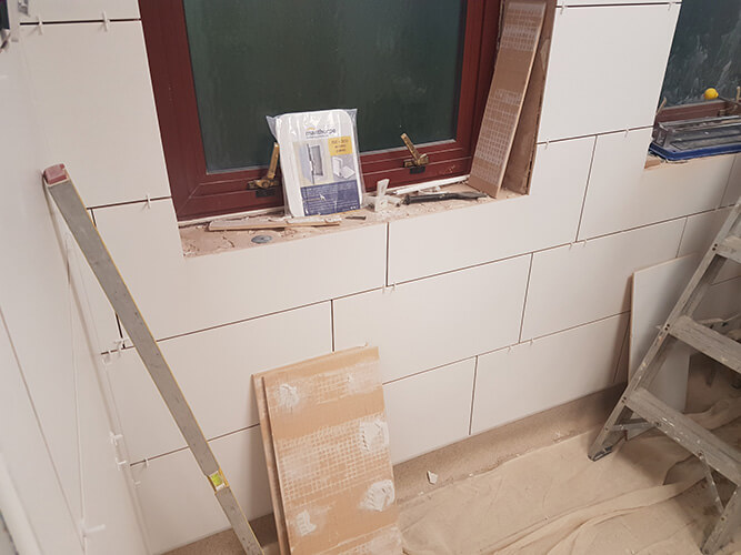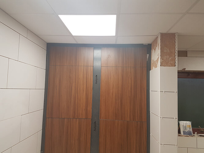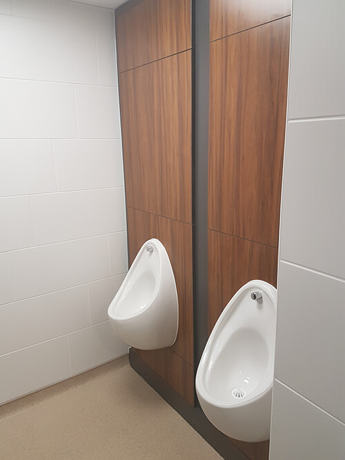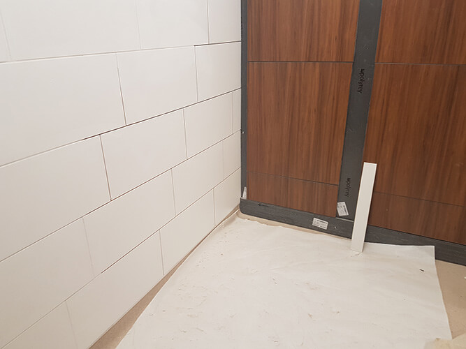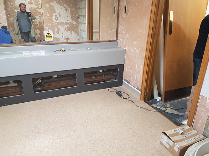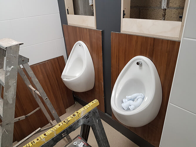 As soon as we got on site our fitters made quick work of removing the tiles, suspended ceiling and old sanitary ware. We used floor protection to ensure the mess didn’t spread into the hallways and offices when we were transporting the rubbish to the skip. Once the toilet was stripped back to basics we could install the IPS panelling and all the associated plumbing behind them. The coved edges of the new anti-slip flooring provided a level base to start tiling which made a dramatic difference in a short space of time. Large format tiles look great and because of their size they cover a large amount of area very quickly.