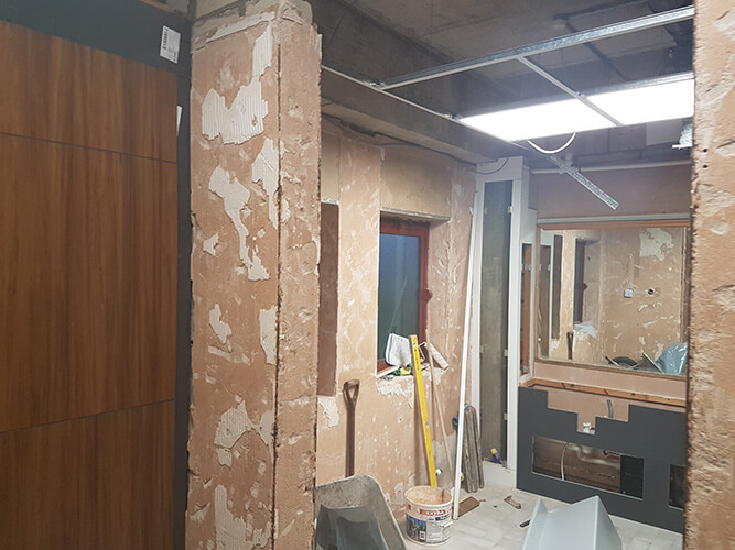 Once the flooring and tiles were installed the suspended ceiling, sanitary ware and cubicles were installed. The mirror was given a new minimalist frame to replace the wooden architrave.
