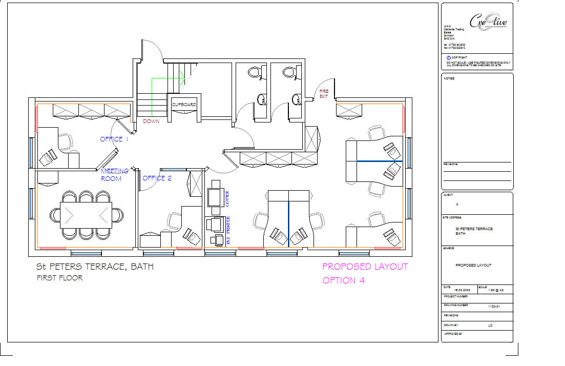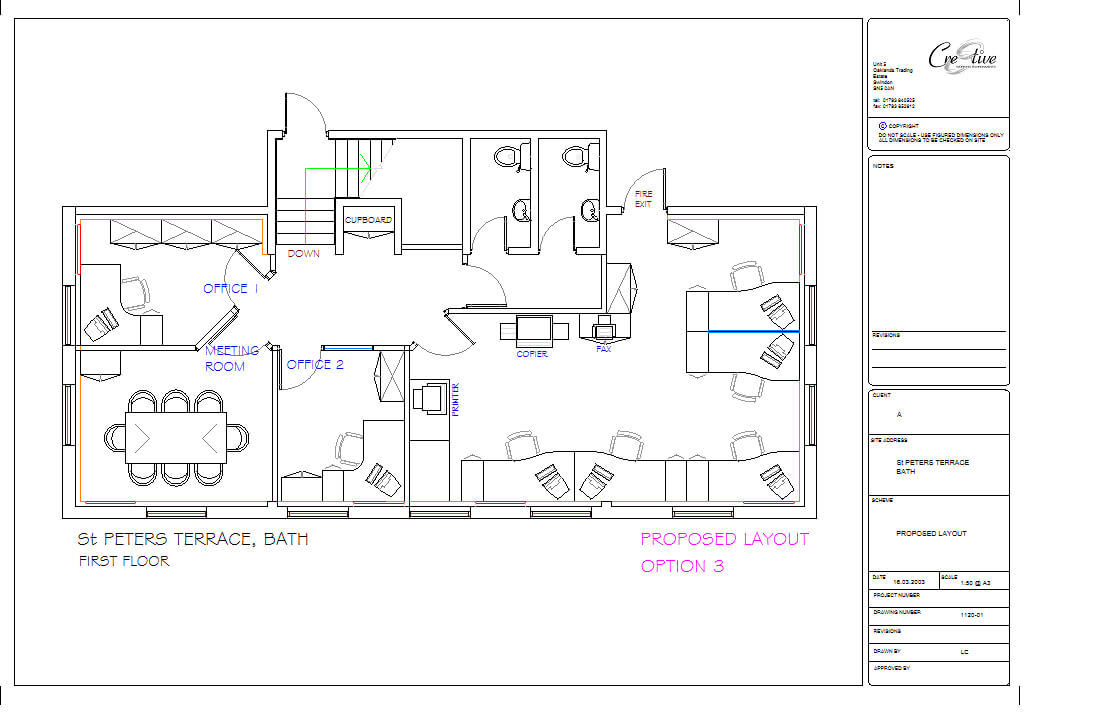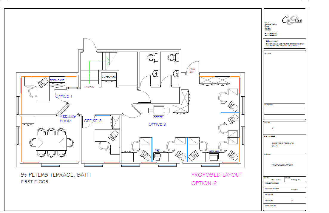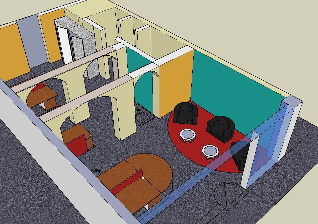 The space was quite small, there was also a requirement to fit a certain number of people inside the office and so a basic space plan was required.Moving on from a basic space plan we applied some colours to the layout as well so the customer had some idea what could be done by using different carpet colours. There is a difference between basic drawing work and space planning, please click on the link for more of an explanation.