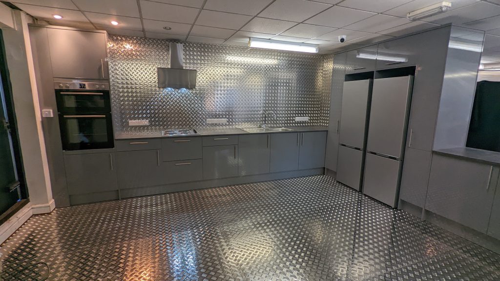 We used a gloss grey slab style kitchen with a 22mm oxidized metal effect worktop and then installed stainless steel checker plate onto the floor and walls to create a stunning shiny metallic effect.