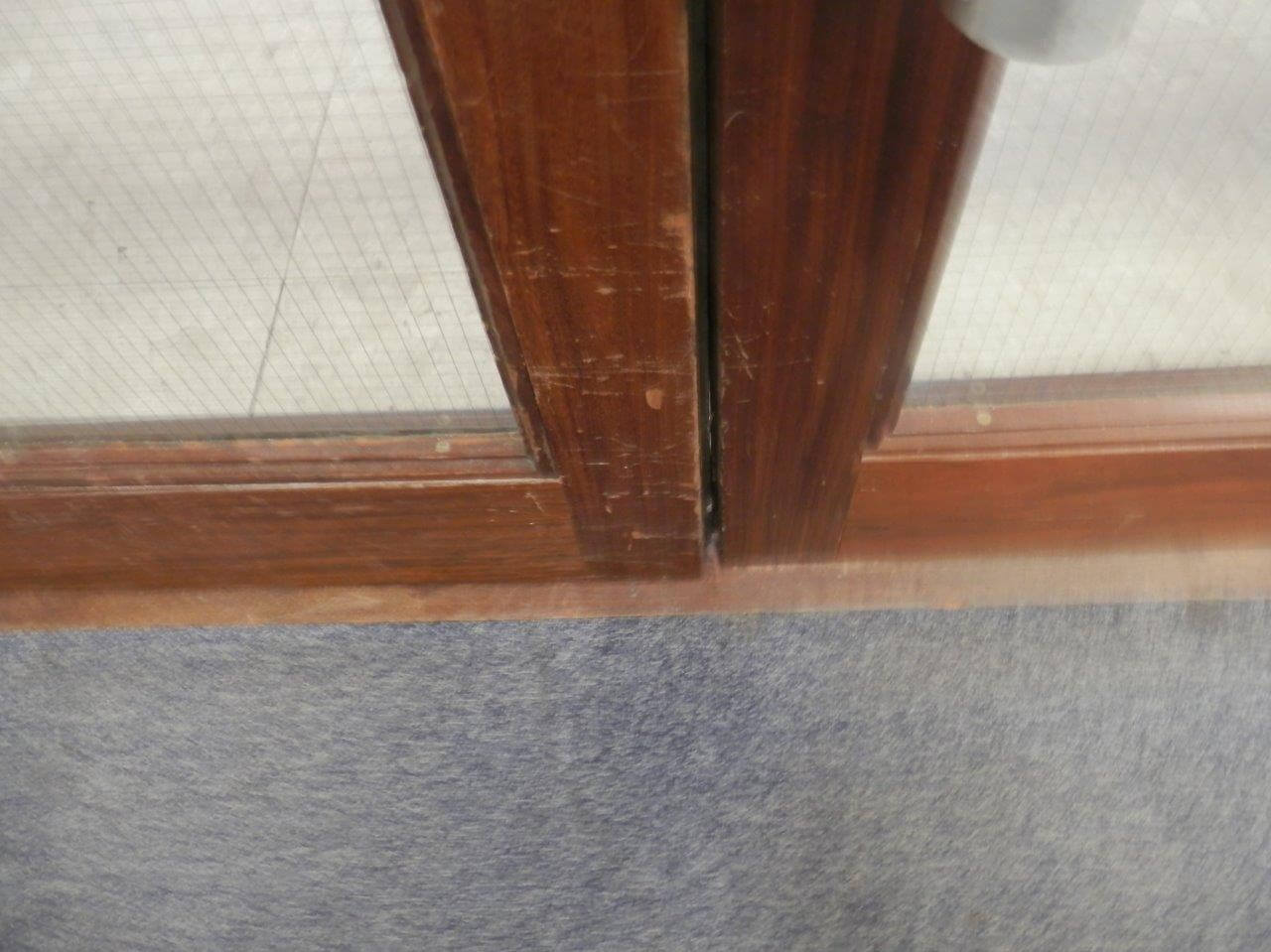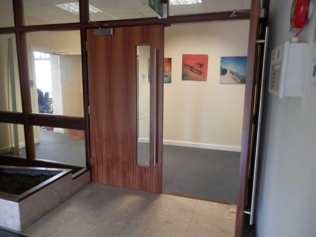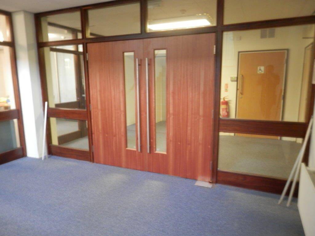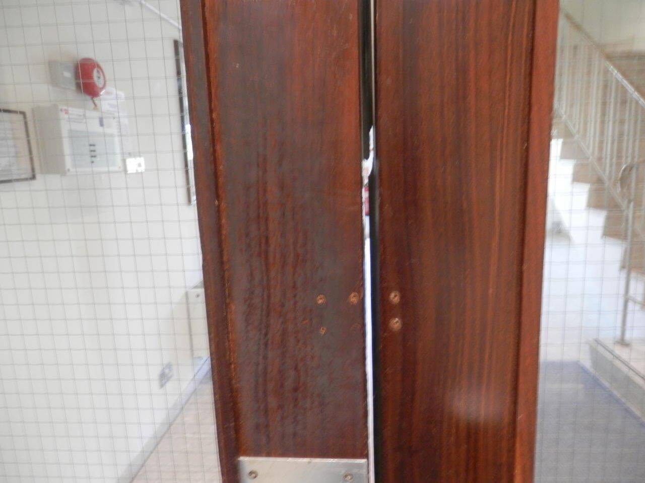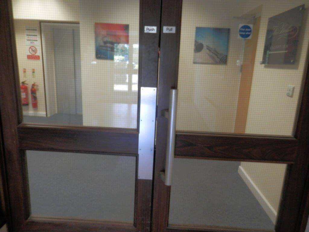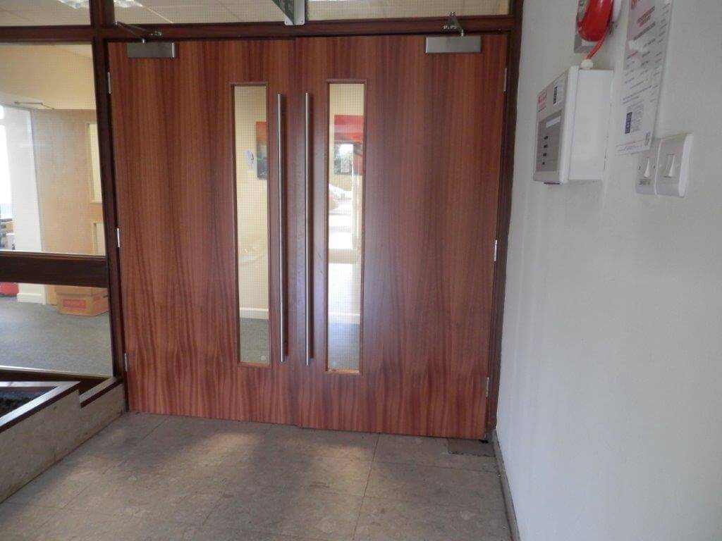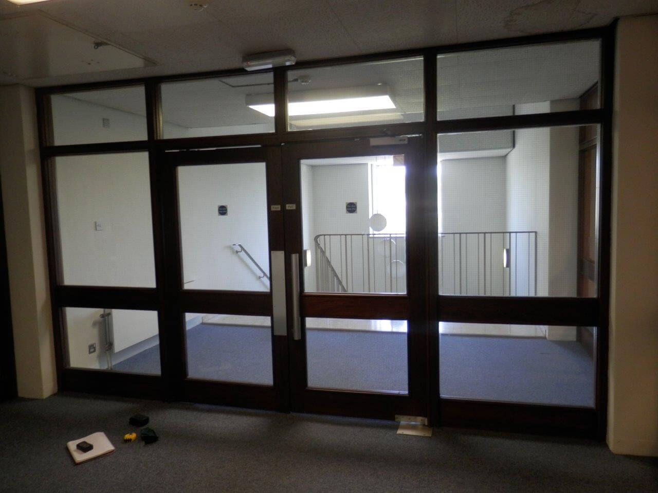 As you can see from the above photographs the existing doors had vision panels at approximately the same height as the glass panels on either side. Over the years the doors and frames had dropped, and as the doors had to be planned to fit, it would not be possible to line them up again.