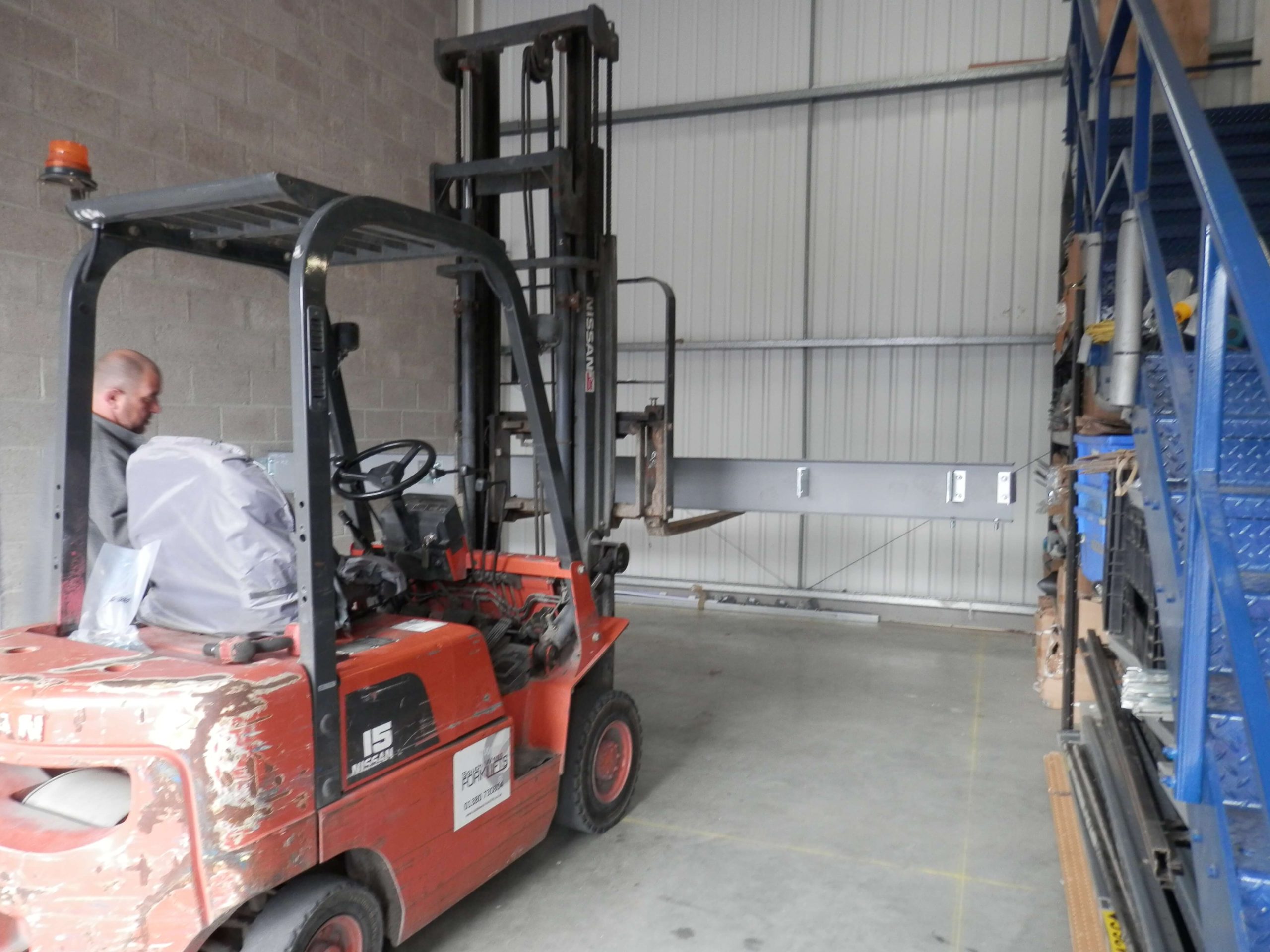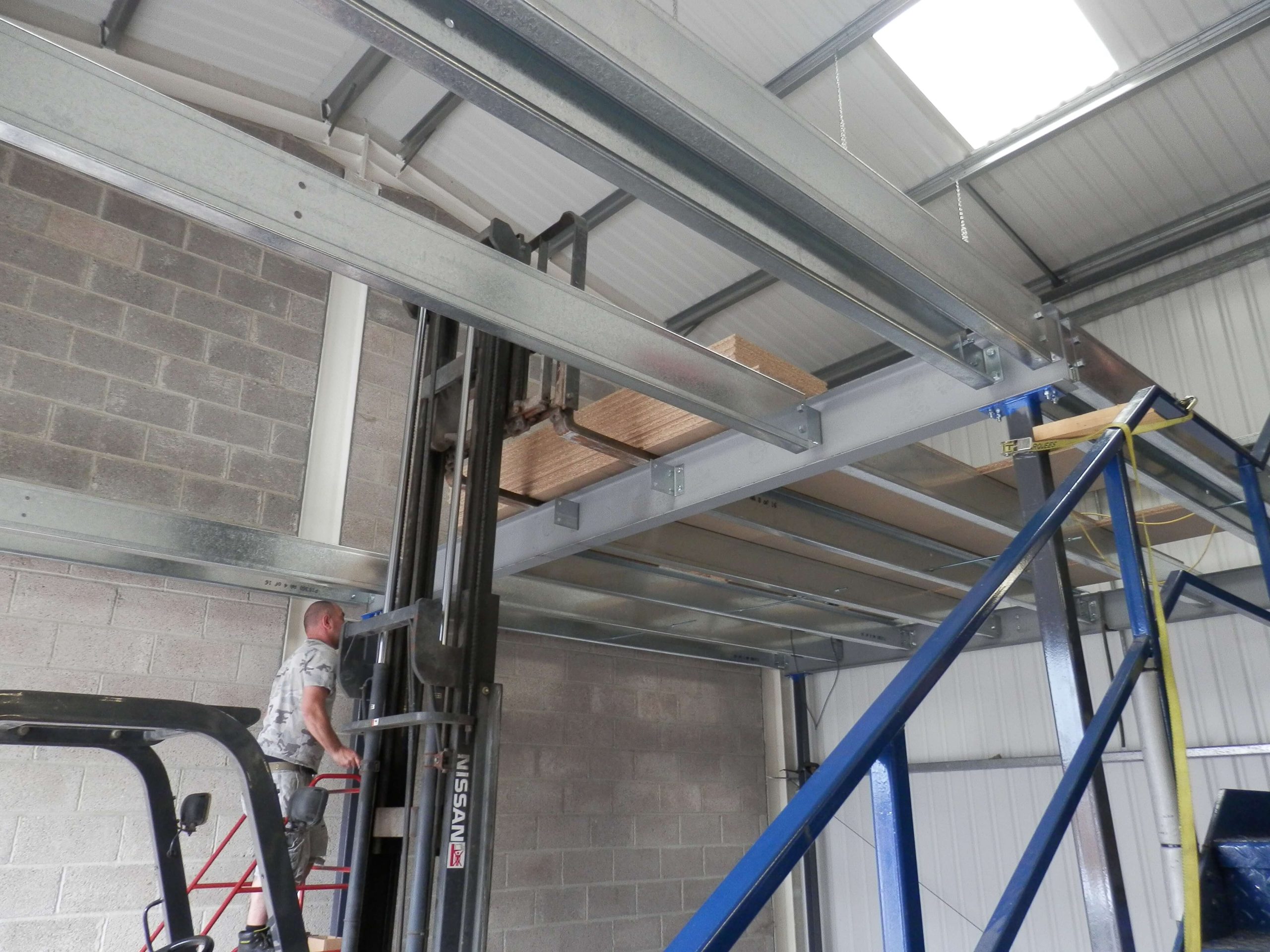 As you can see from the photographs below, it is essential a fork lift is used. It allows the main beams to be lifted to the height required fully supported whilst the upright support posts are installed. We also use the forklift to lift up the 38mm thick particle board onto the floor which saves time. Each board panel is then cut to fit and is secured from the underneath of the floor.