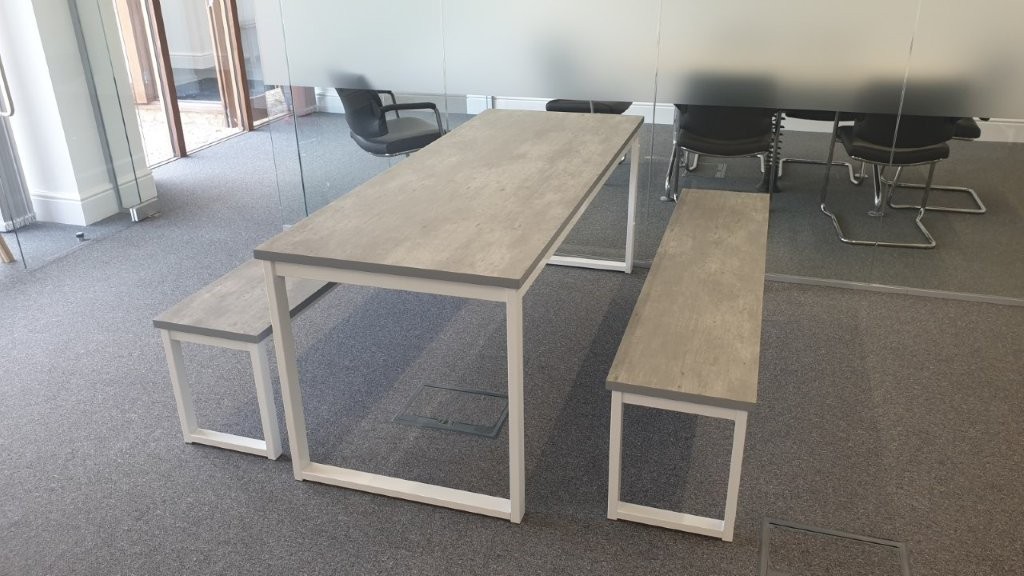 Below shows the remaining construction photos, some show the assembly of the desks using a ‘beam’ system, with shared leg frames. The main advantage in using a beam system is that the support leg frames are shared amongst adjoining desks, hence reduce the costs. Shared leg frames gives more leg room under the desks. The central spine of the desk cluster also has a cable management tray which keeps all of the power and data off the floor. The cabling can then be run from the edge of the walls, rather than worry about floor boxes near where people sit. Floor boxes would need cables running up from the floor boxes to the desks. Much neater to have cable management in the desks themsleves.