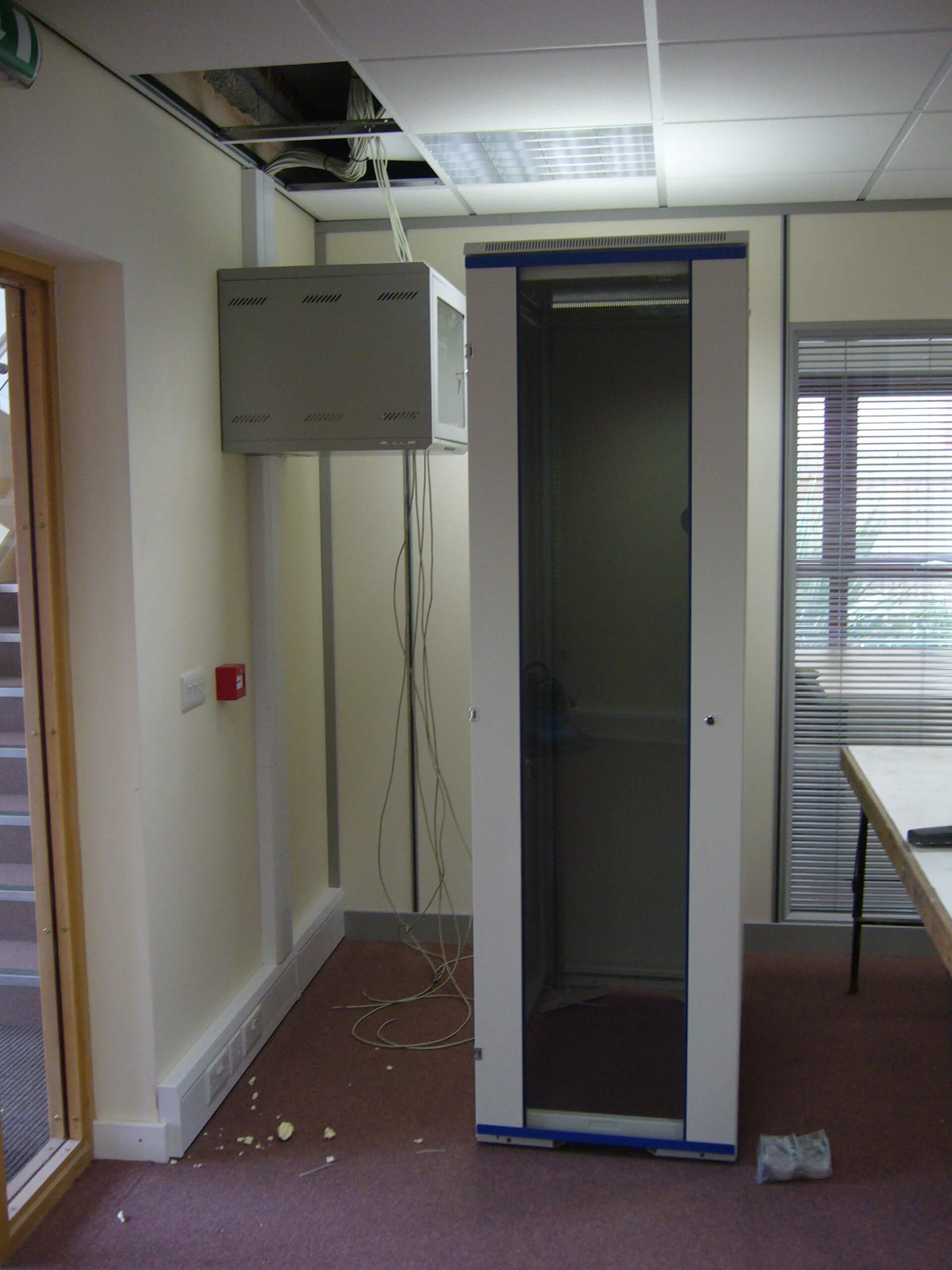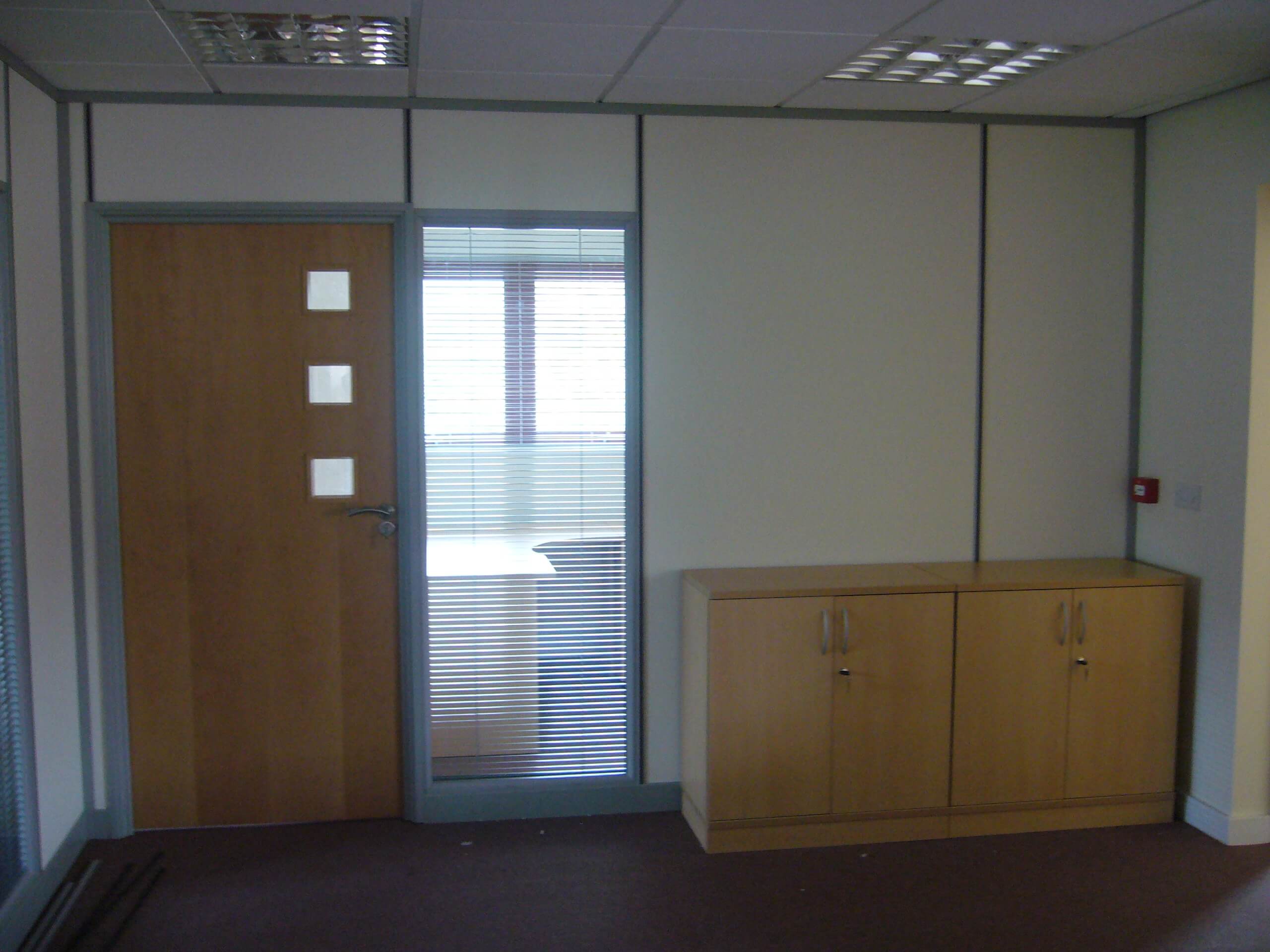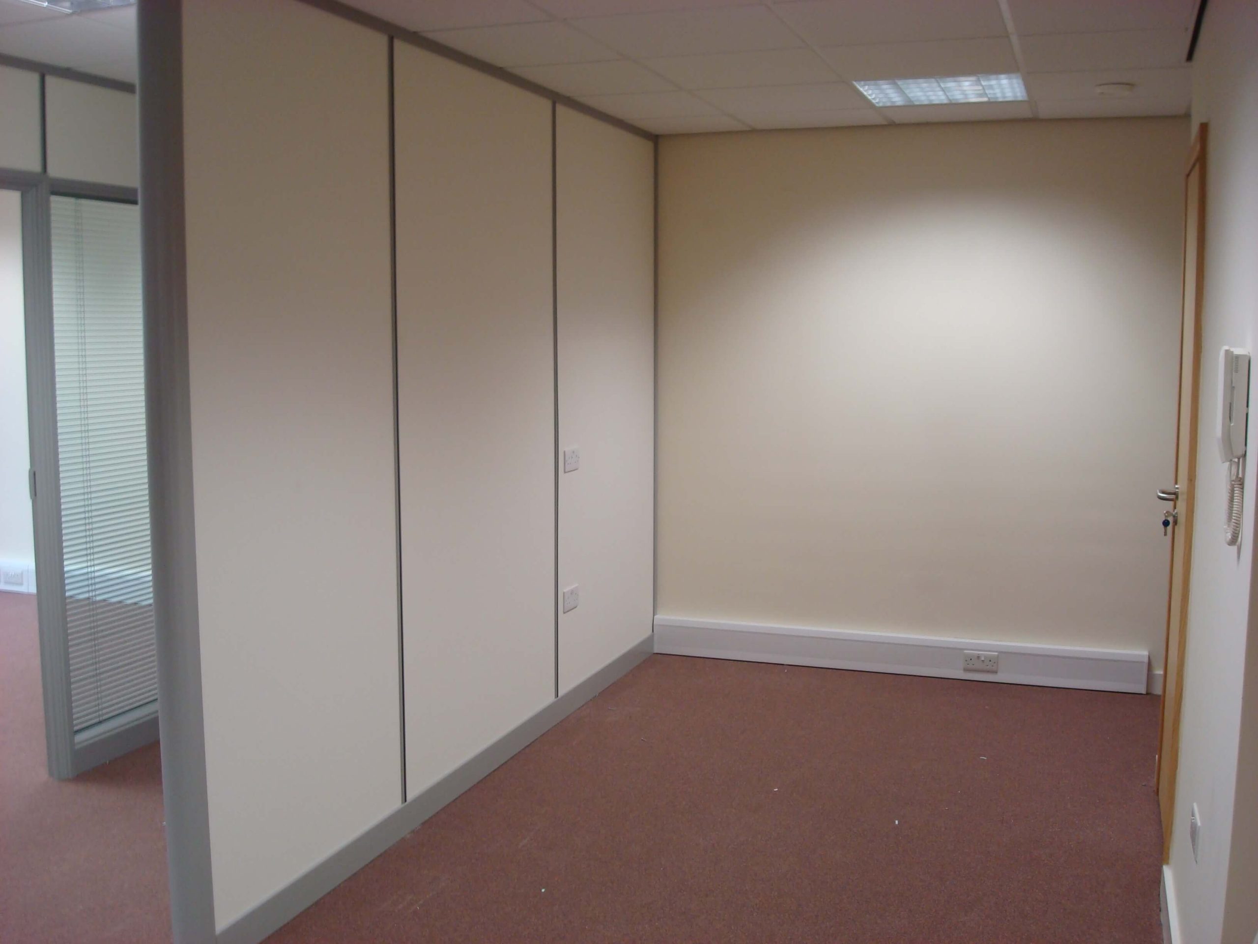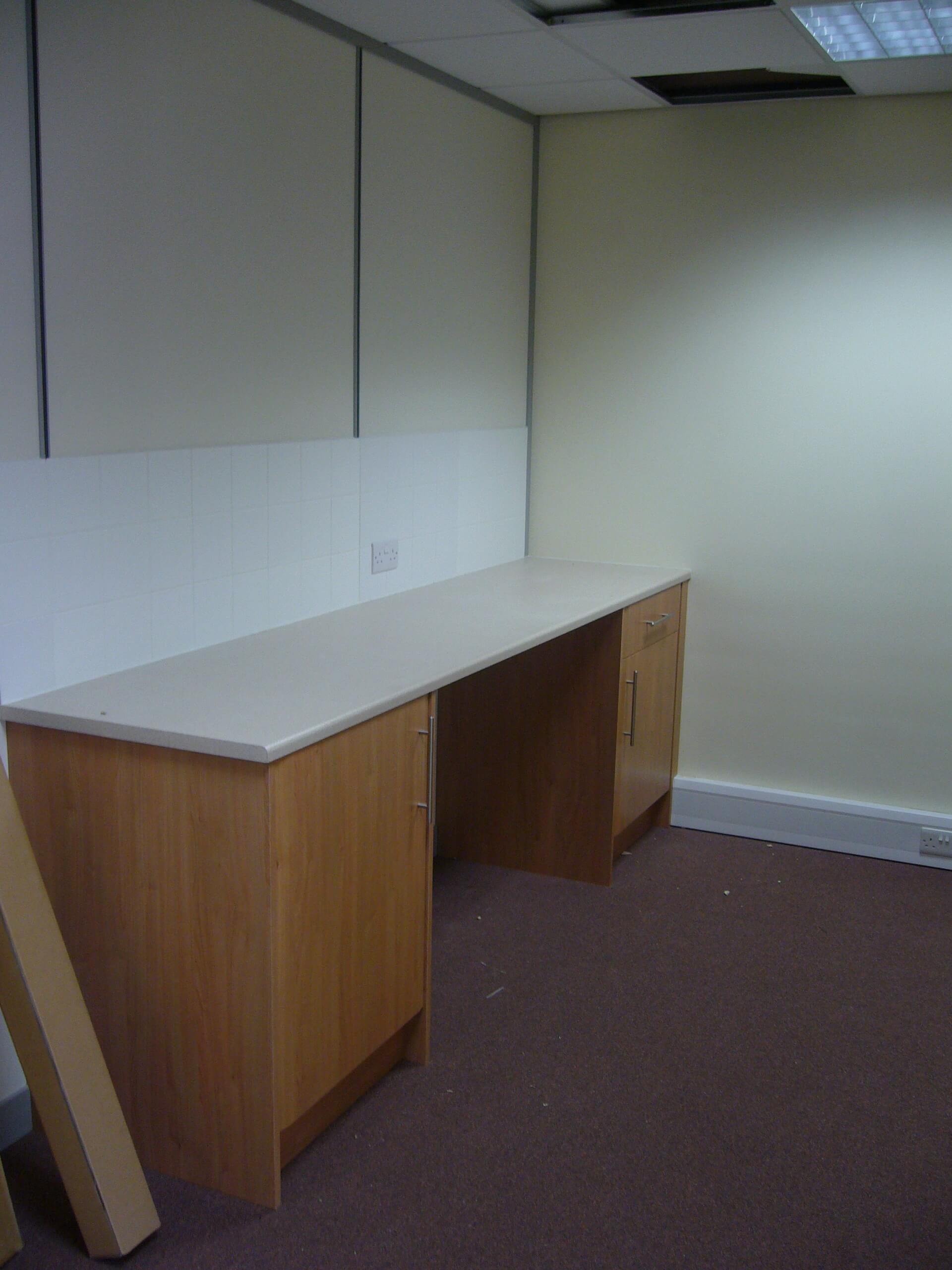 The main building is rented, and so a requirement from landlords is that the partitioning needs to be demountable. The condition of the existing space was pretty good, with cabling and lighting already in place. We did have to re- cable all of the Cat5 data and voice sockets to the comms cabinet position, as well as re-position power sockets in the perimeter trunking so that there appeared in the correct places. All we had to do was to fit some partitioning as well as some storage wall for the main meeting room. We also had to build a small kitchen.
