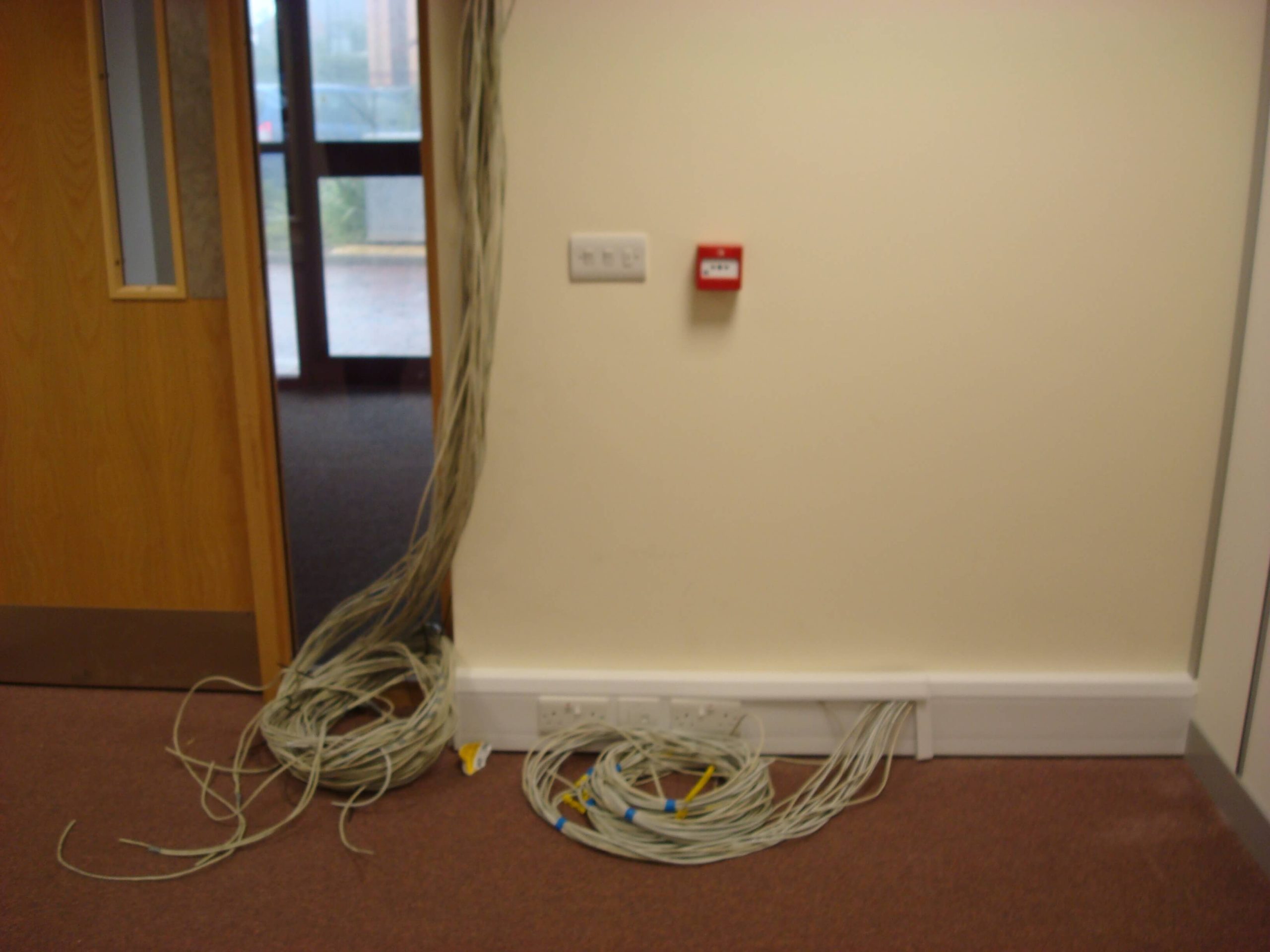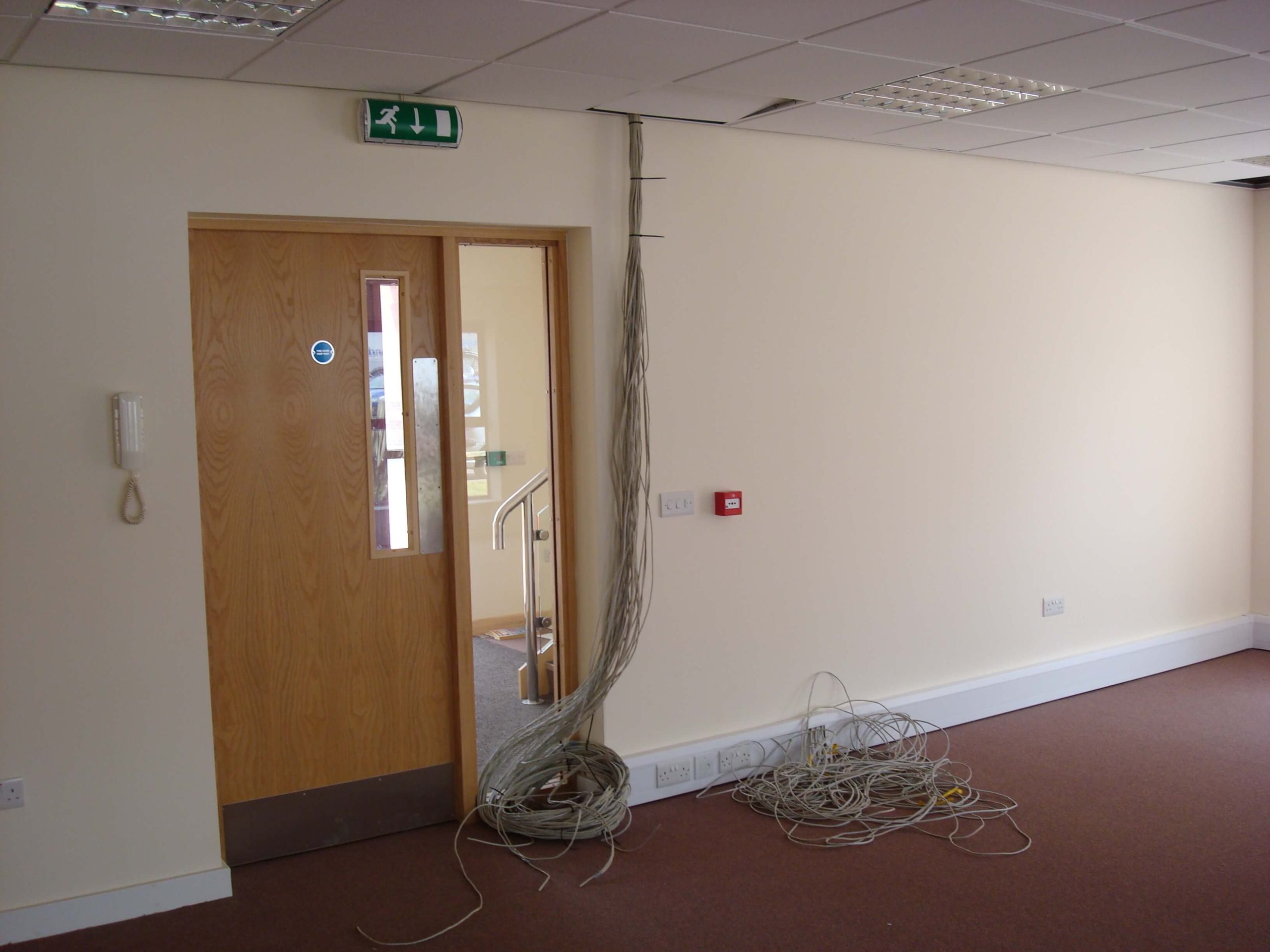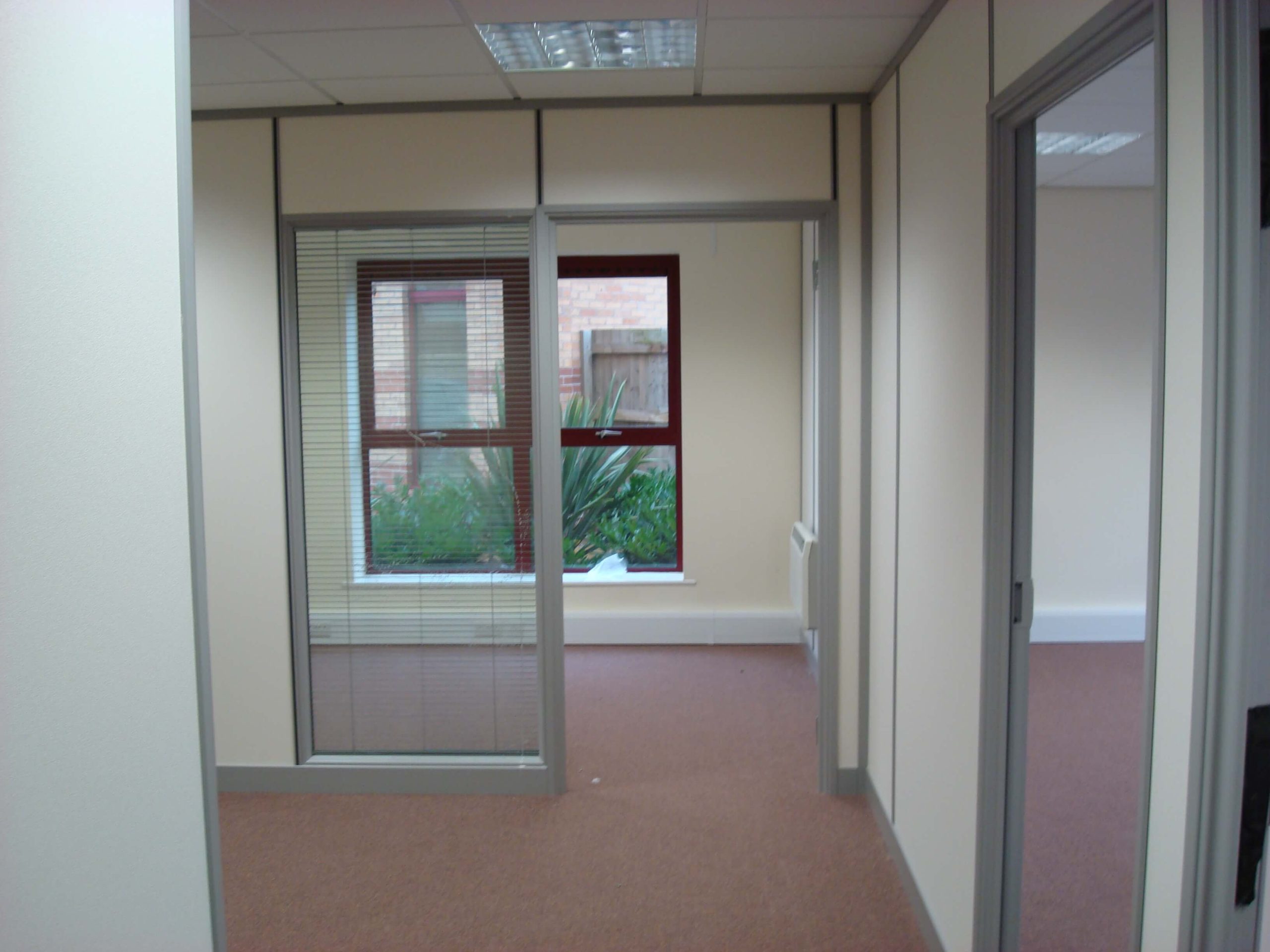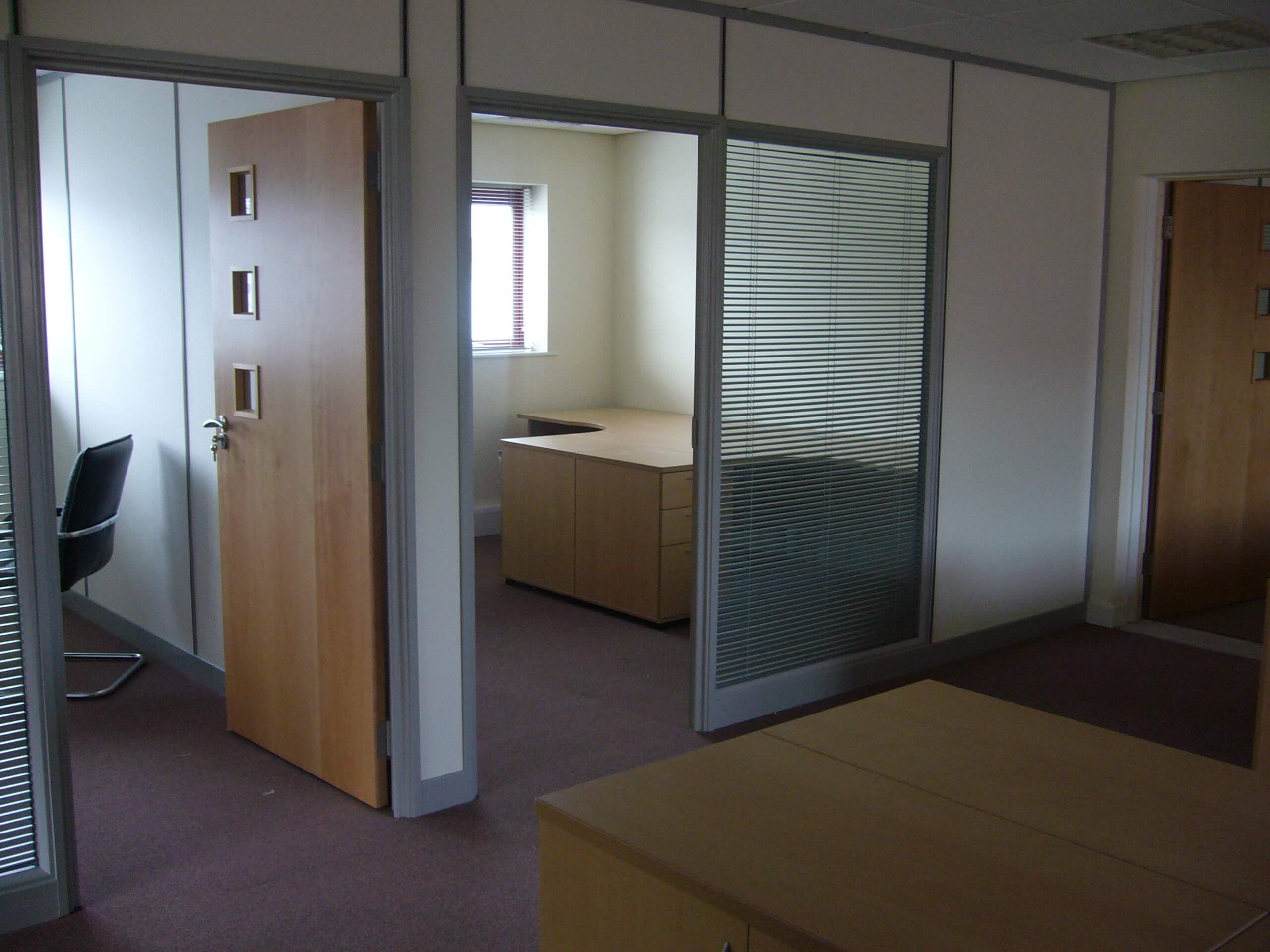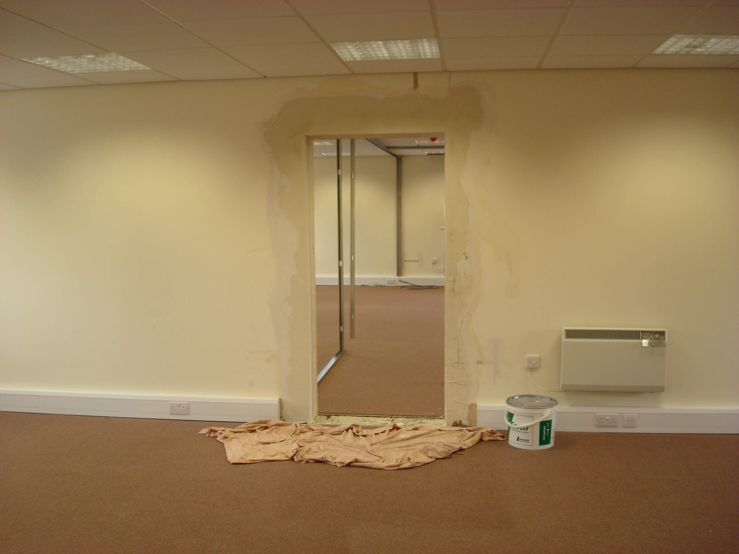The main building is rented, and so a requirement from landlords is that the partitioning needs to be demountable. The condition of the existing space was pretty good, with cabling and lighting already in place. We did have to re- cable all of the Cat5 data and voice sockets to the comms cabinet position, as well as re-position power sockets in the perimeter trunking so that there appeared in the correct places. All we had to do was to fit some partitioning as well as some storage wall for the main meeting room. We also had to build a small kitchen.