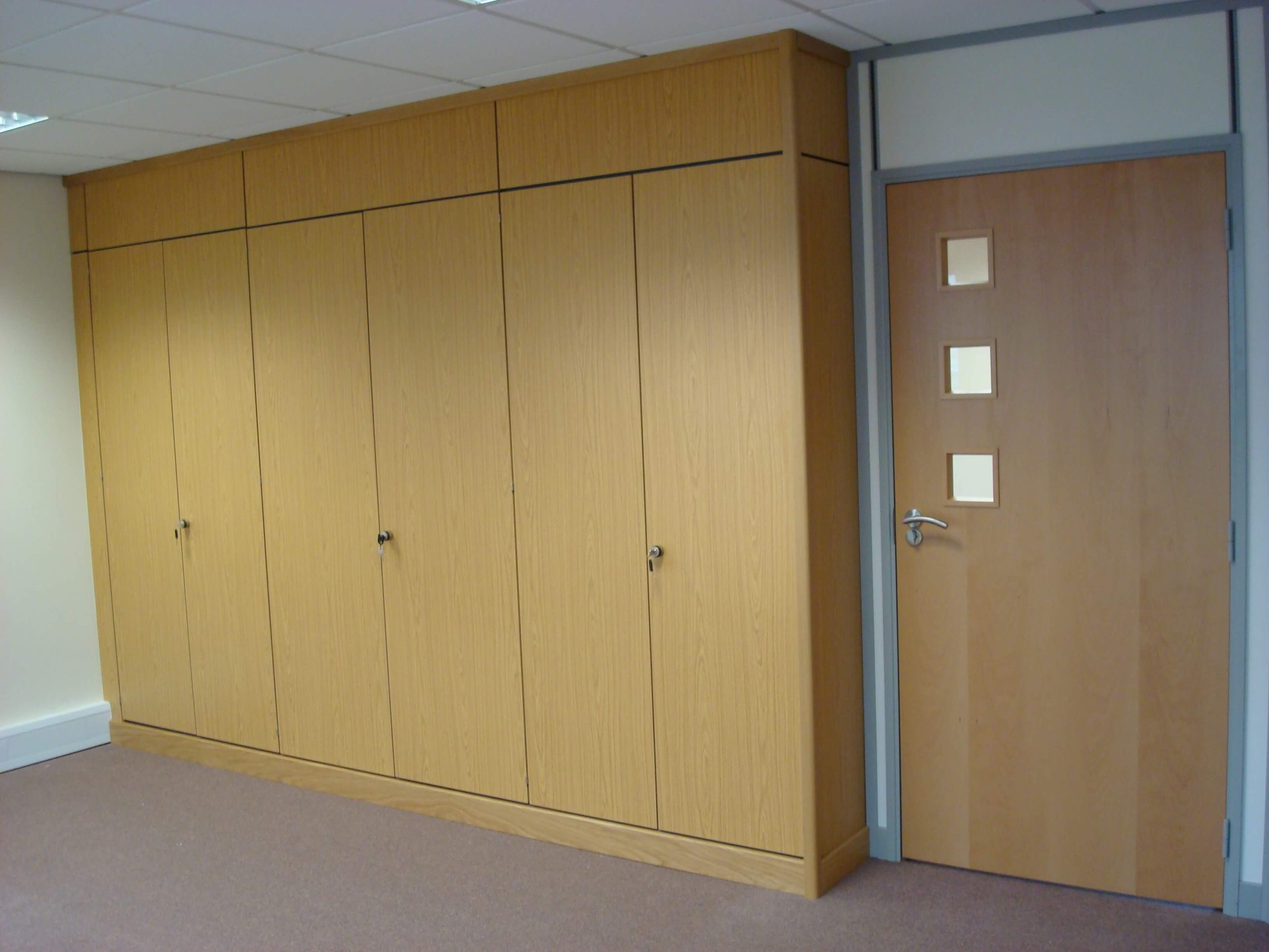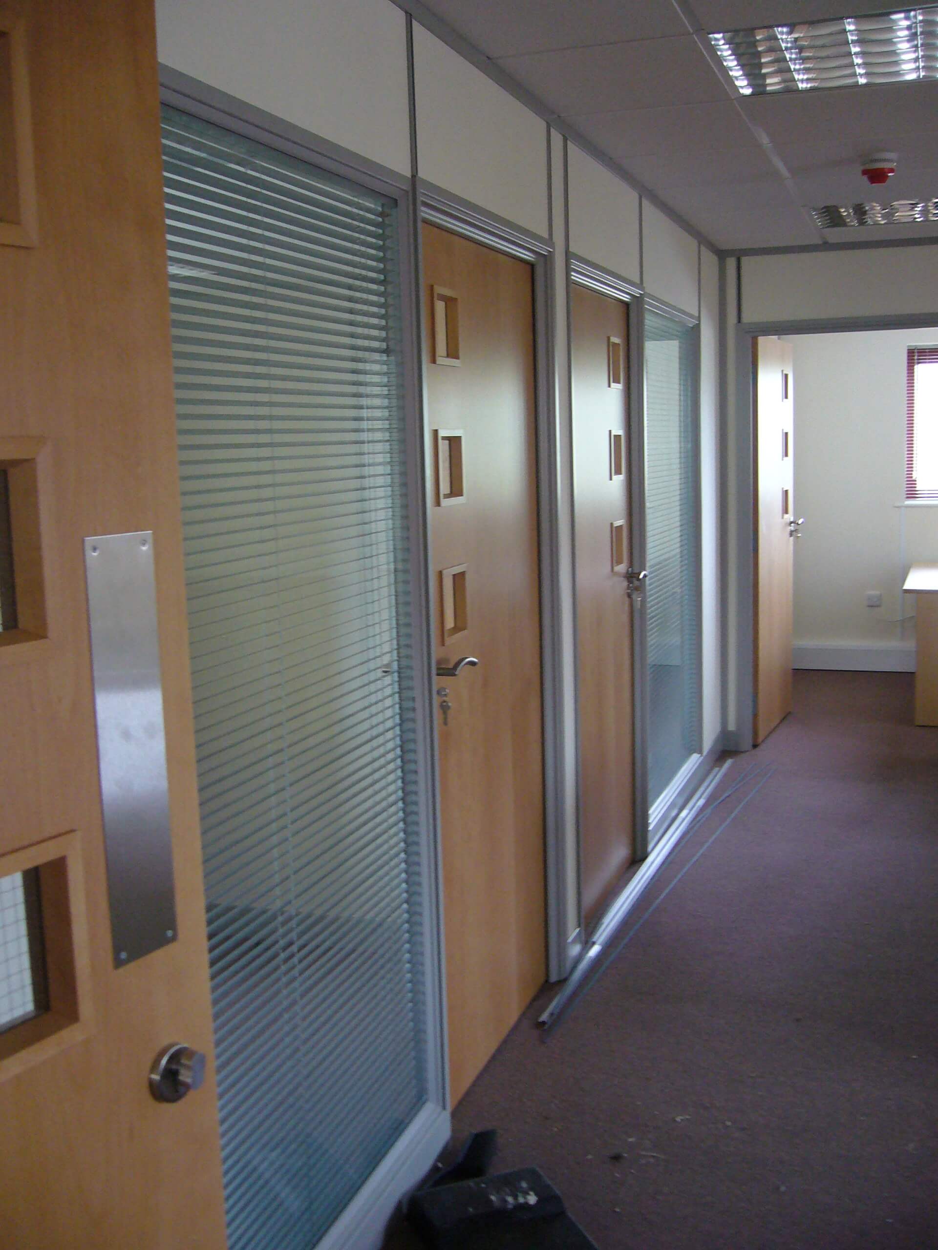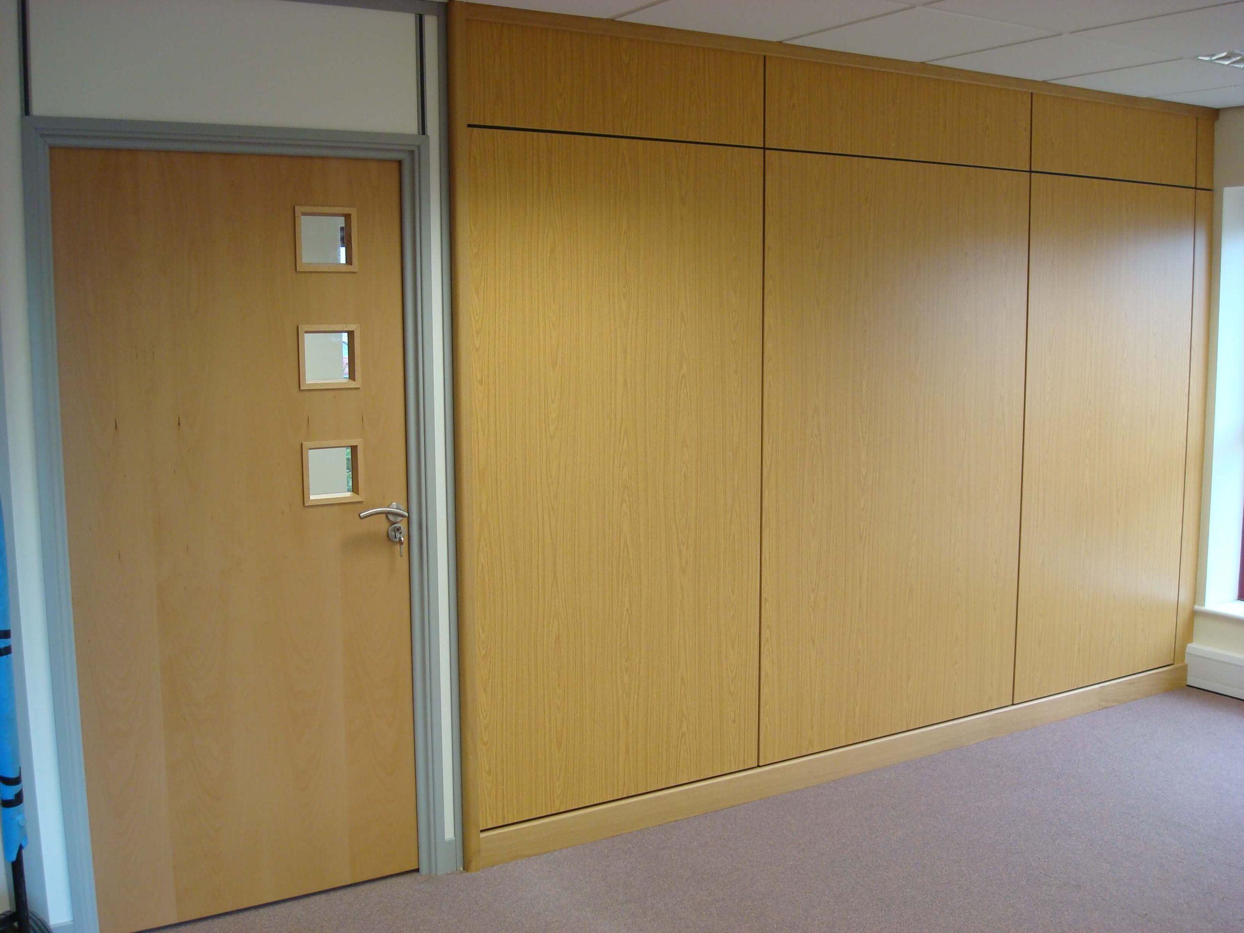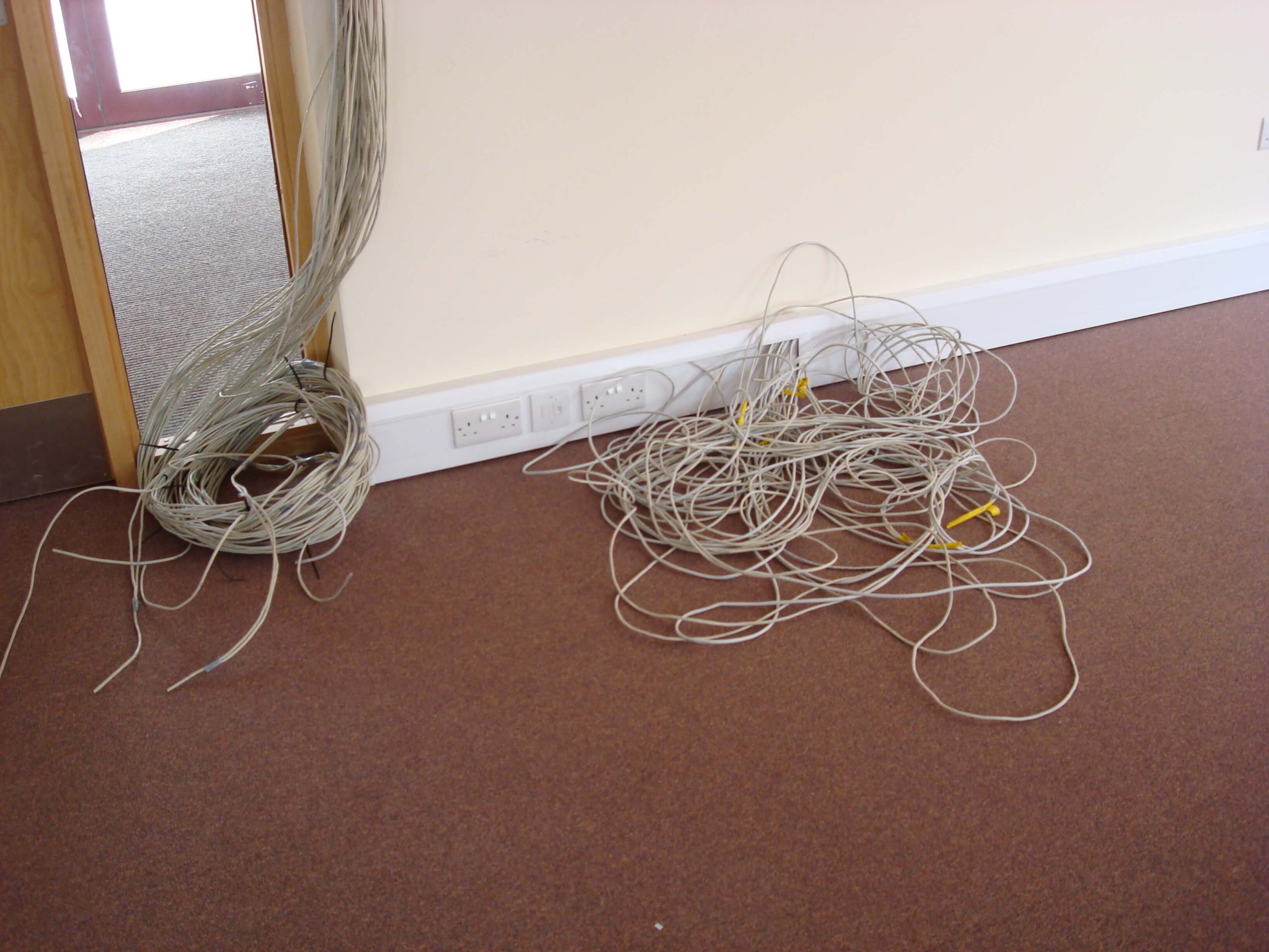 The main building is rented, and so a requirement from landlords is that the partitioning needs to be demountable. The condition of the existing space was pretty good, with cabling and lighting already in place. We did have to re- cable all of the Cat5 data and voice sockets to the comms cabinet position, as well as re-position power sockets in the perimeter trunking so that there appeared in the correct places. All we had to do was to fit some partitioning as well as some storage wall for the main meeting room. We also had to build a small kitchen.