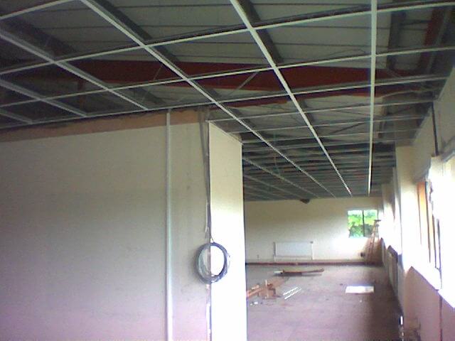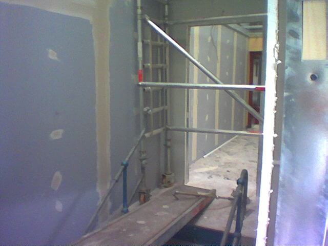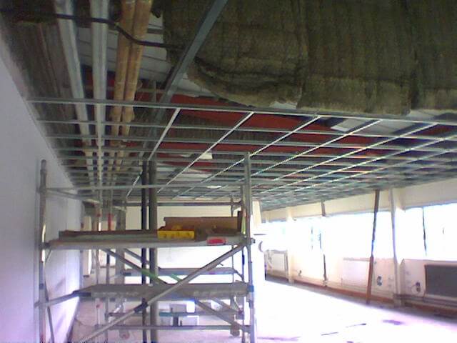 The mezzanine floor had to be turned around and a new jumbo stud fire wall constructed. Below the mezzanine floor we created a new reception area with fire rated ceiling, decorations and flooring. Upstairs included new ceilings, carpets, plastering and decorations as well as a new kitchen. Also fitted upstairs was a new office constructed from Komfort Kameo 75mm demountable partition.