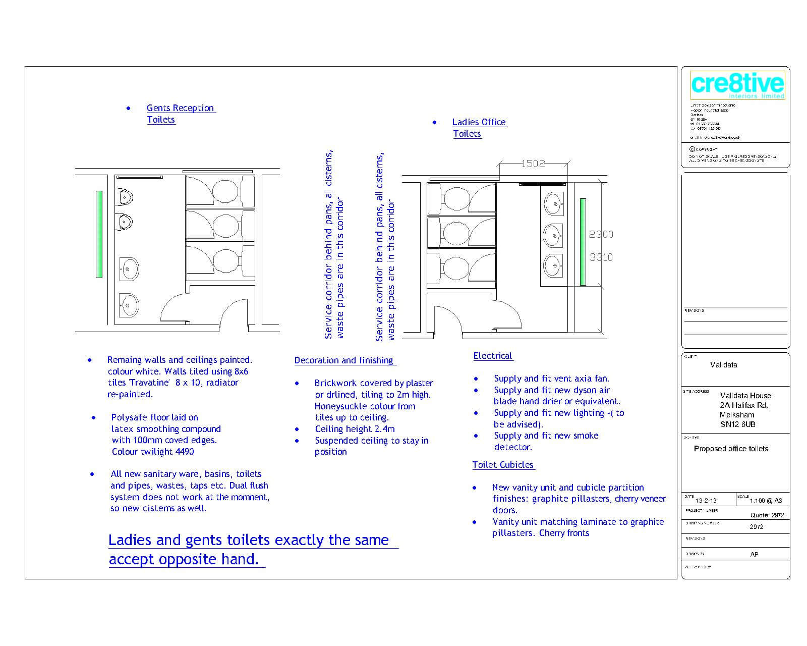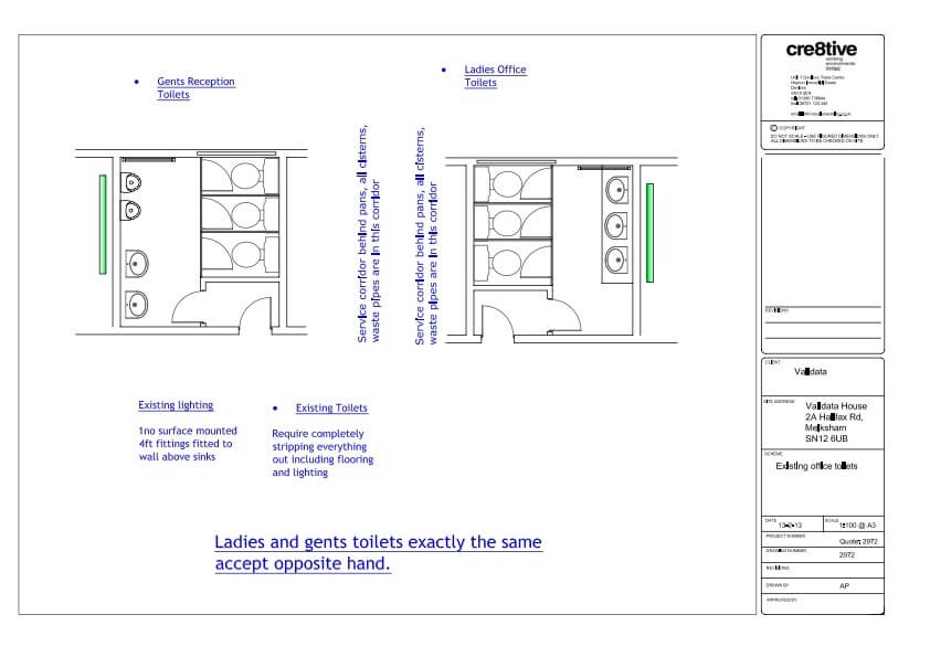 Cre8tive was asked to carry out a toilet refurbishment in Melksham by looking at Valldata’s current toilets as they were showing the signs of age. There were two sets, reception side for visitors, and the office side which were much larger and were for the office staff.