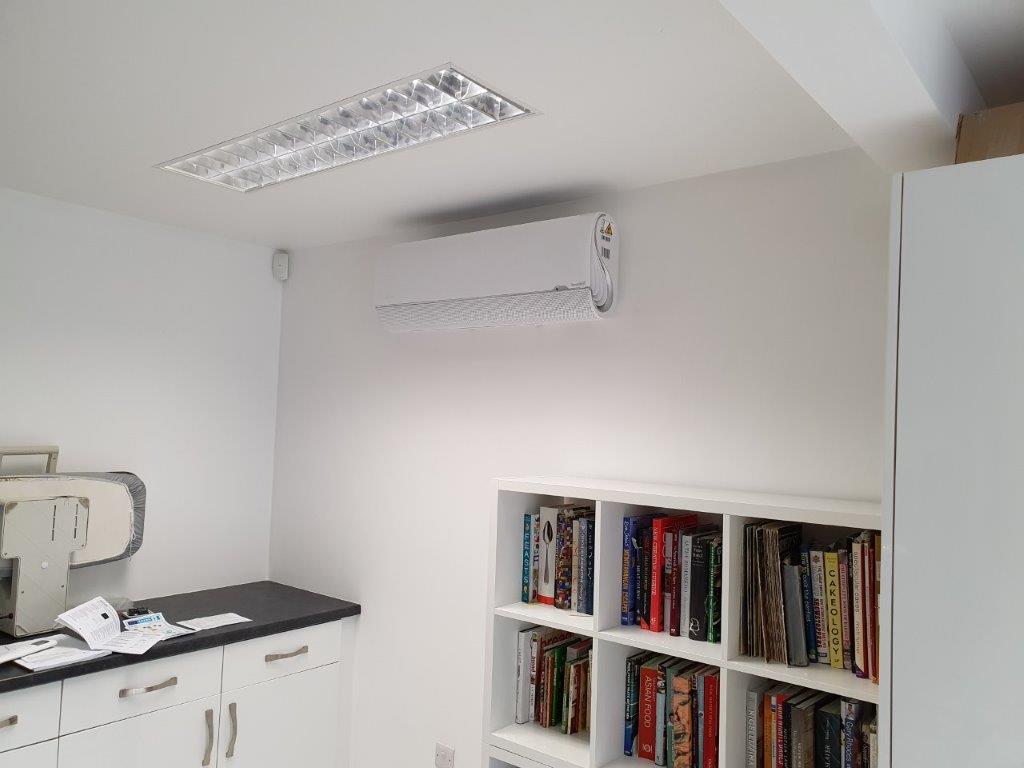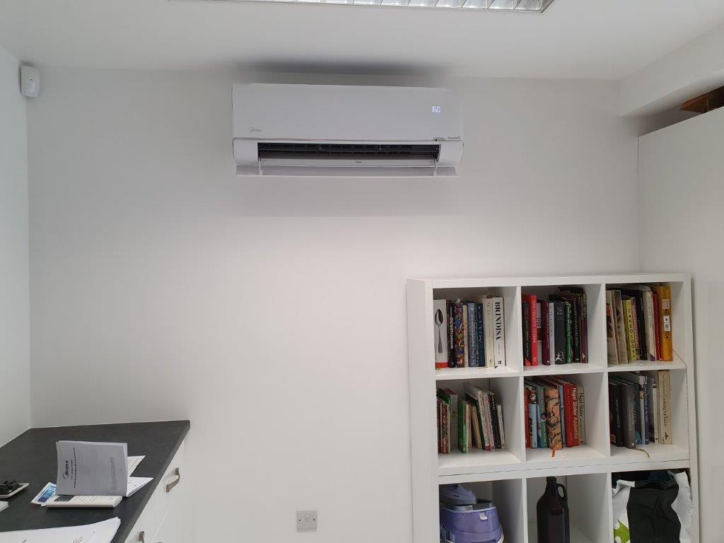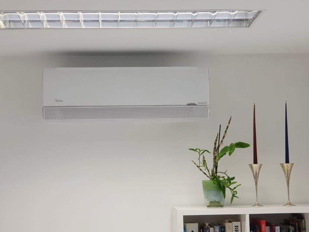 Most wall mounted units for offices direct the air using blades and in the commercial environment we always have issues with the direction of cold blast of air on people. The unit we chose was a new design from Midea which lets the air come out of the unit through thousands of perforated holes in a front grill, resulting in no cold blasts. The cooled and heated air also comes out of the unit from the sides. We felt that this was a much better unit for the customer as the air supply to the space would be much more comfortable than conventional units from Daikin, Fujitsu and some of the other makes that we can fit and maintain.