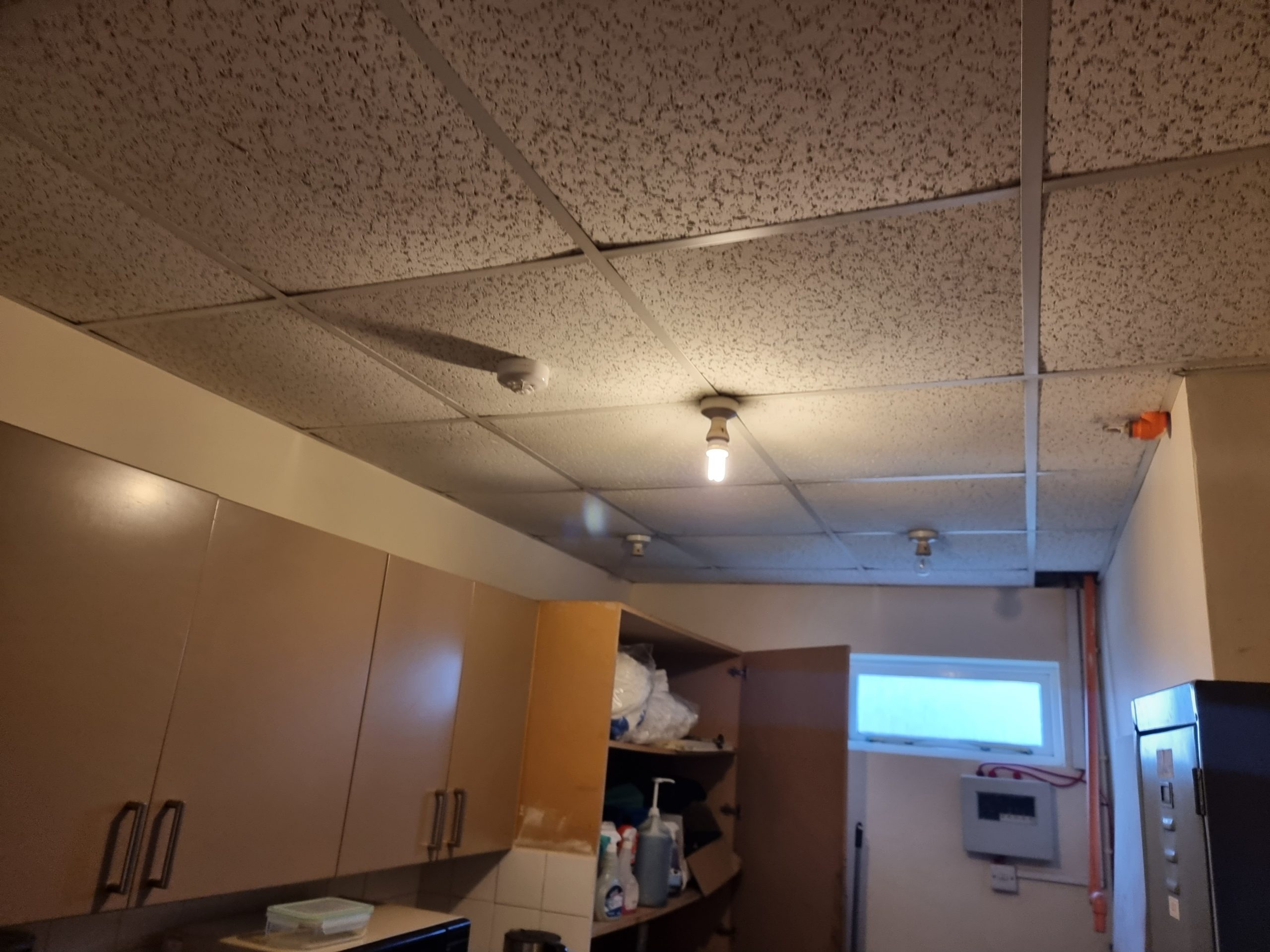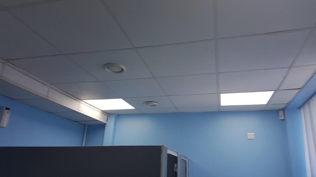 To brighten the space, the dated ceiling was replaced with a modern suspended system. We utilized flat white tiles paired with high-output LED panels. This combination dramatically increased the ambient light levels while providing a clean, professional finish and improved energy efficiency.