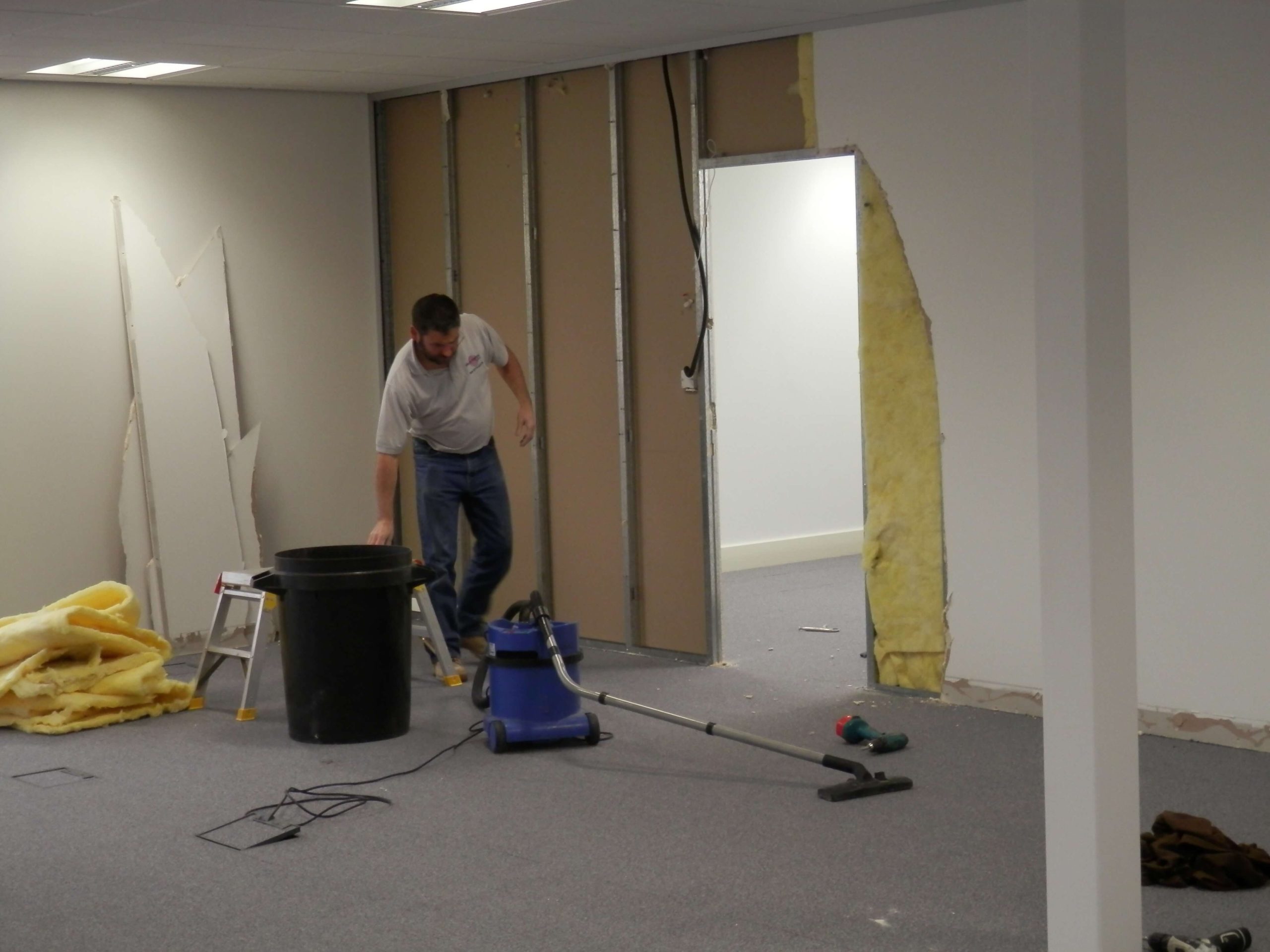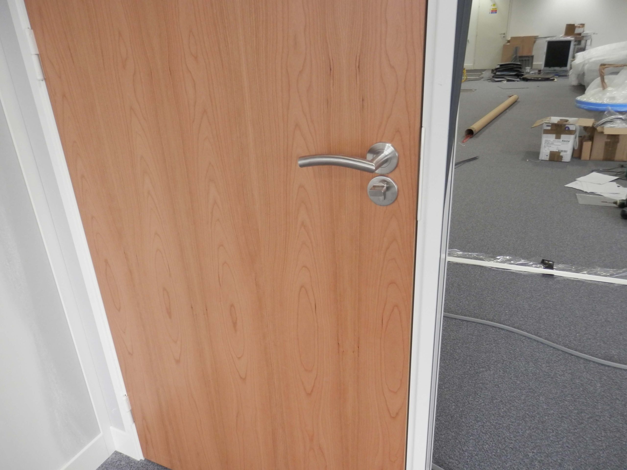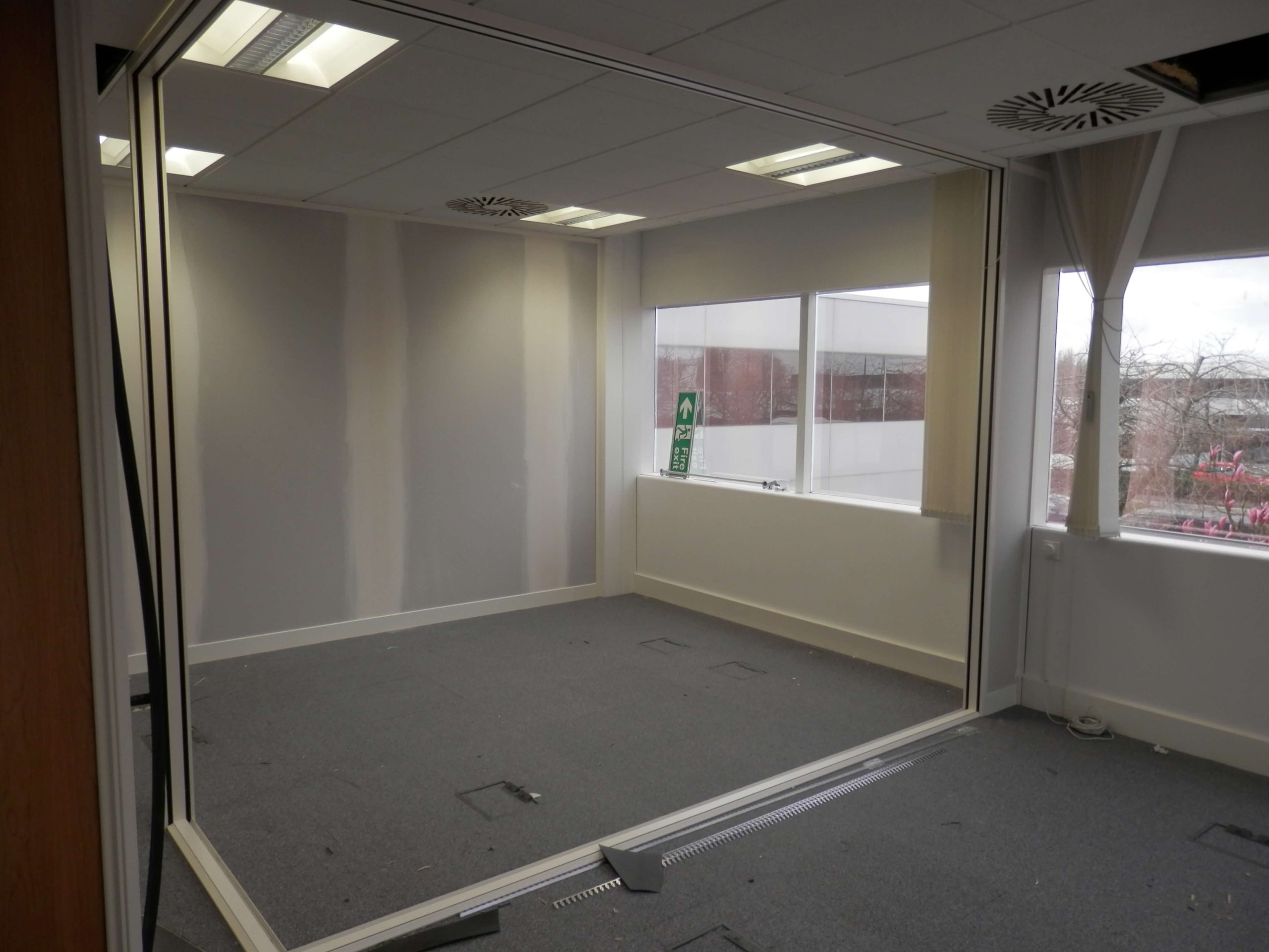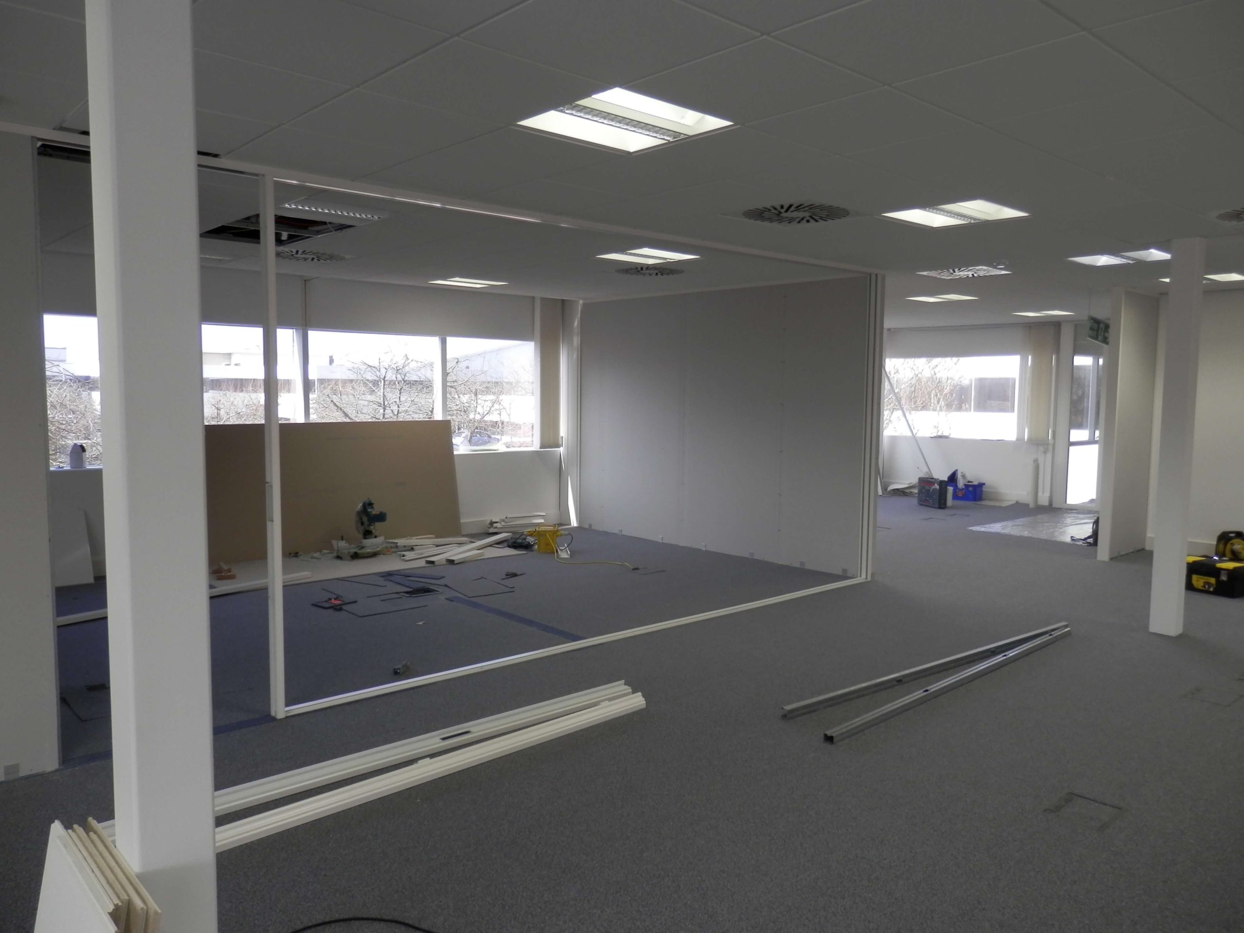 Many offices have problems with sound, problems with fitting enough people in, and may look dated and need reworking which is where we can help. From an initial brief as to what the problems are to the final completed office we can carry out everything that you need inside an office. In the project above we used demountable partitioning but using a special type of glass to enhance sound performance. The system was also a propriety demountable partition system called Komfort Polar. The glass wall was double glazed, with seamless glass joints for a smooth simple look.