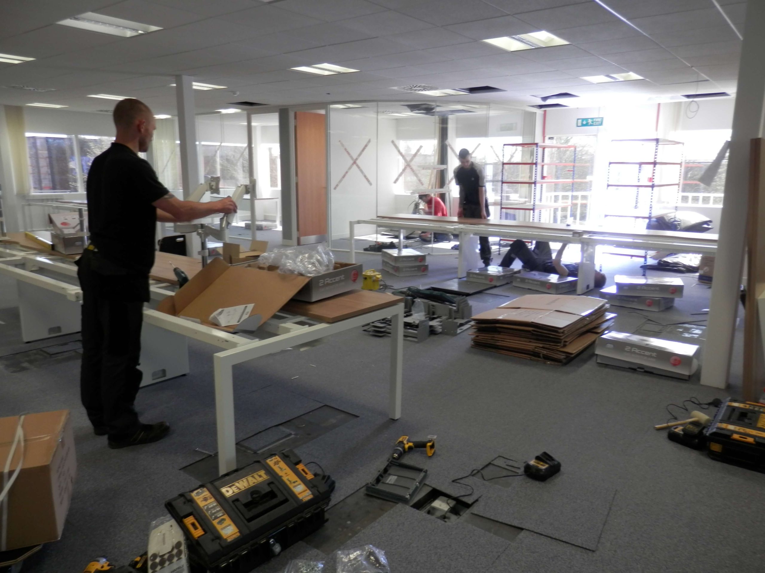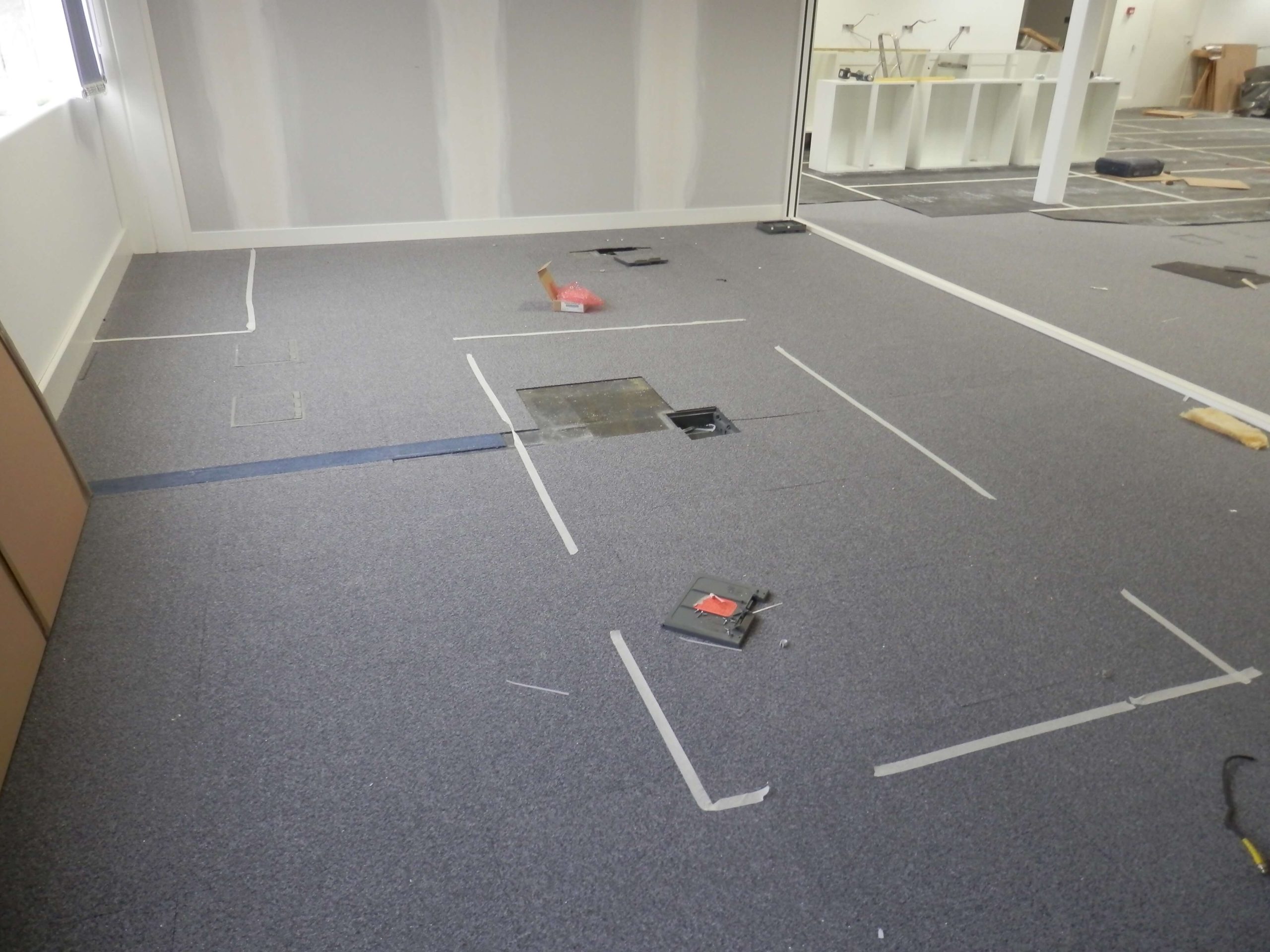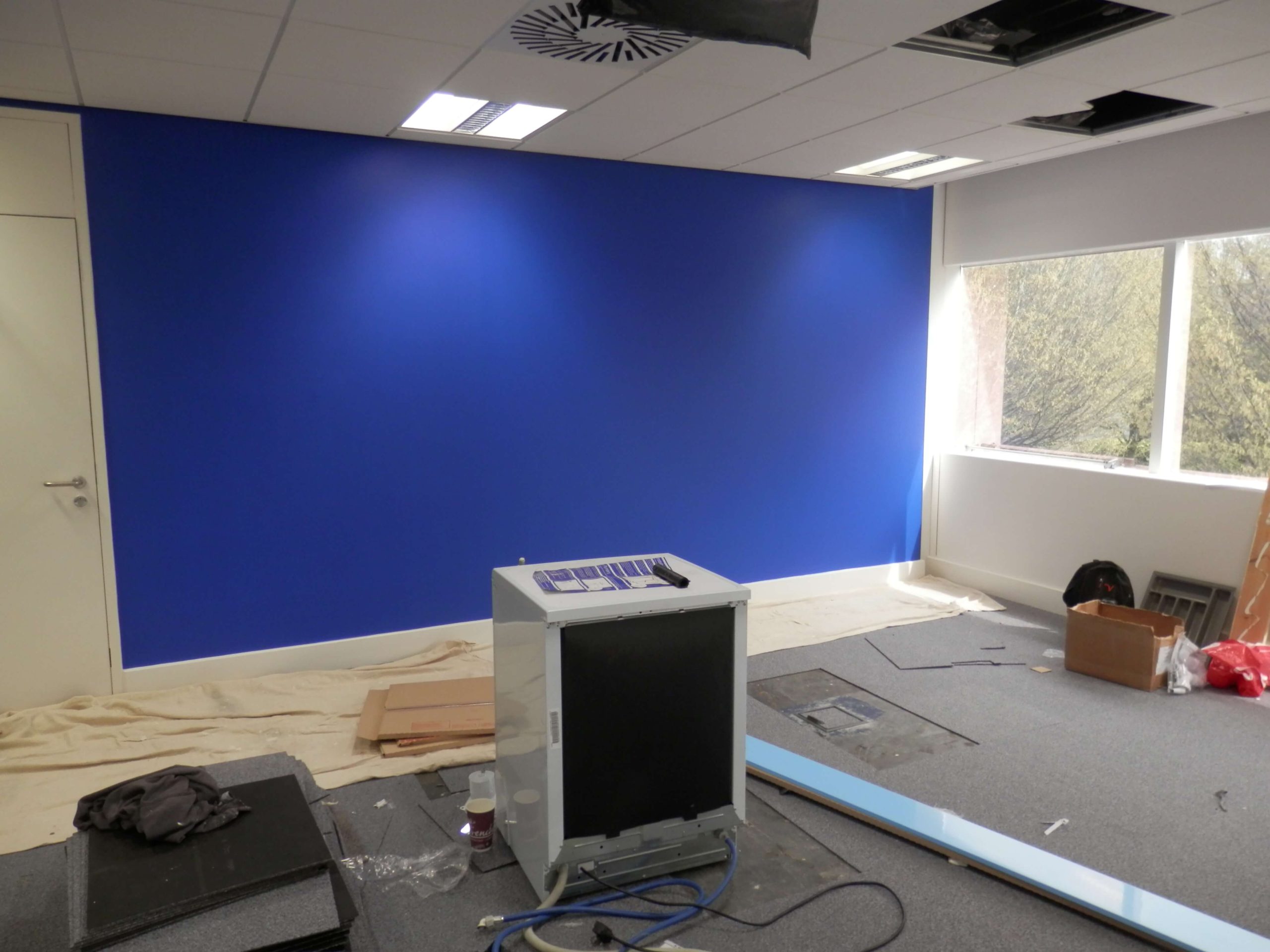 As you can see from the photographs there was quite a bit to organise, in particular we had to follow the progress to a programme, as well as maintaining dates that had to fit in with the American IT team visiting the UK to install the server the programme had to be met for the financial reasons in order to maintain a steady flow of payments coming to us from the USA. The main office design and fit out project for us was only one small part in order to get the office up and working. The customers IT people only had 3 days to install all of the equipment, so all of the infrastructure cabling, power, air conditioning, cabinets and of course all of the security access controls and cameras had to be fully working before they came over to visit. They were bringing with them a special server built by Dell to handle the call volumes anticipated in the office and the server itself cost 7 figures.