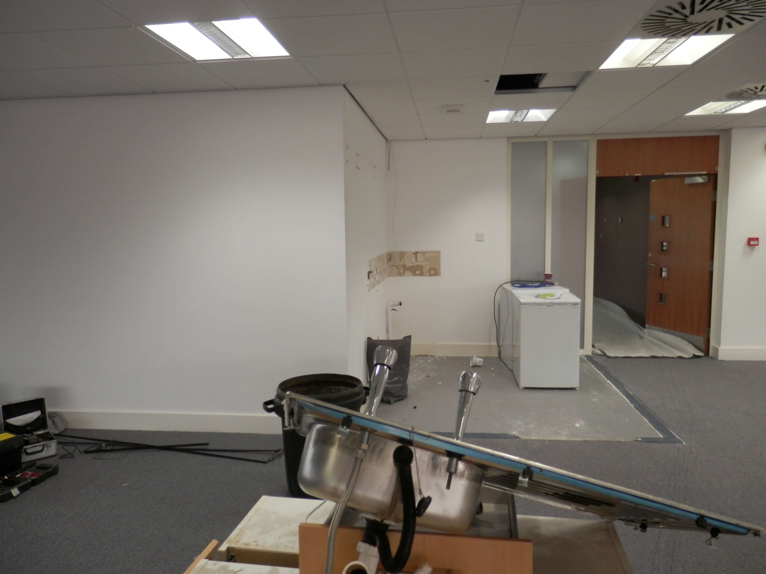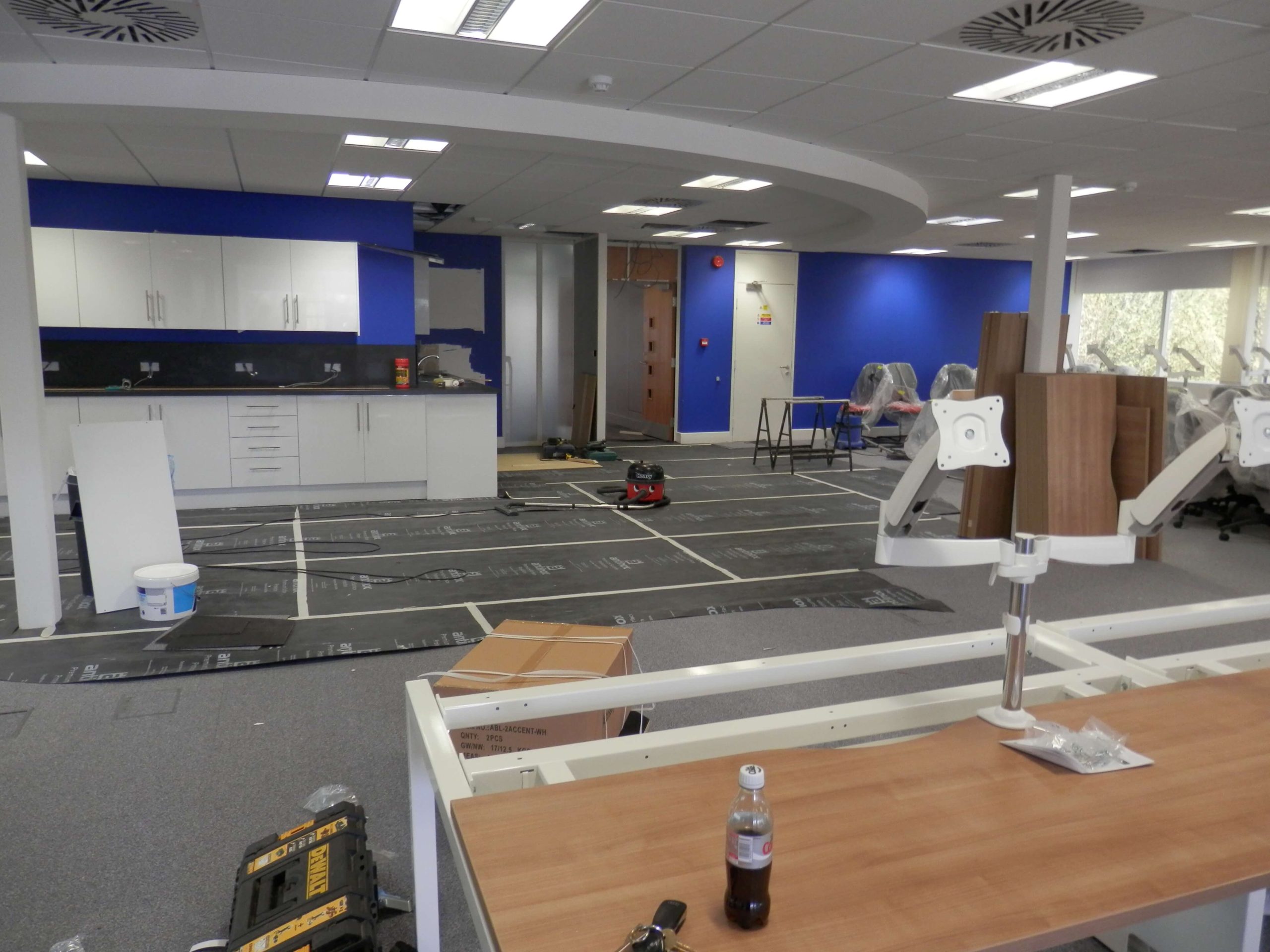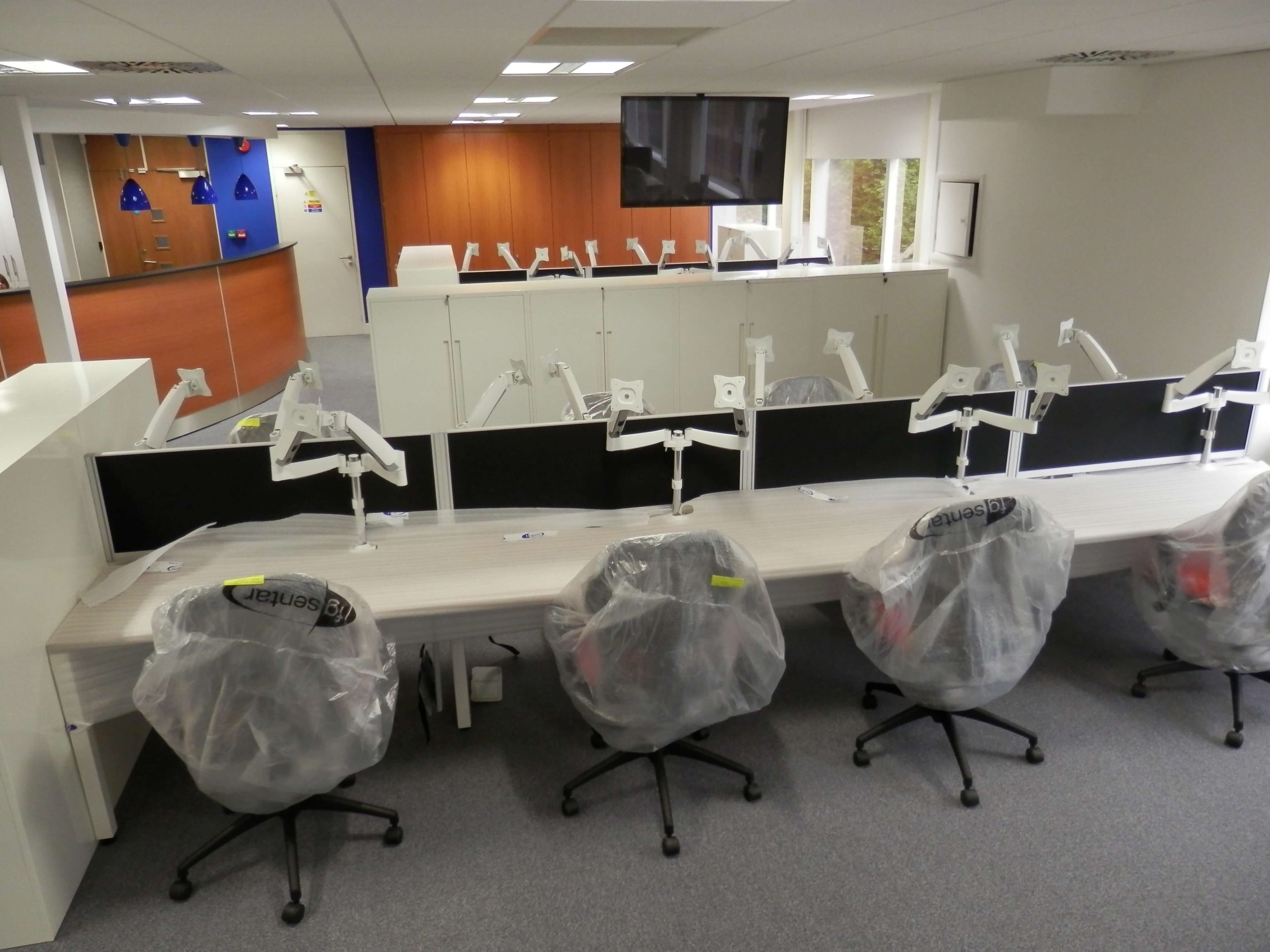 The activities included Office Design, Project Management, CDM regulations, Building Regulations, contracts, stripping out work, demountable glass partitioning, decorations, design of a breakfast bar, supply and fit of all office furniture, air conditioning new and changes to existing, ventilation changes, lighting, electrical work, data cabling, supply and fitting of the communications cabinet, cctv, access control, audio visual equipment and connection, storage wall and flooring changes. We also supplied all of the office furniture, screens, cupboards, plants, graphics, chairs and monitor arms.