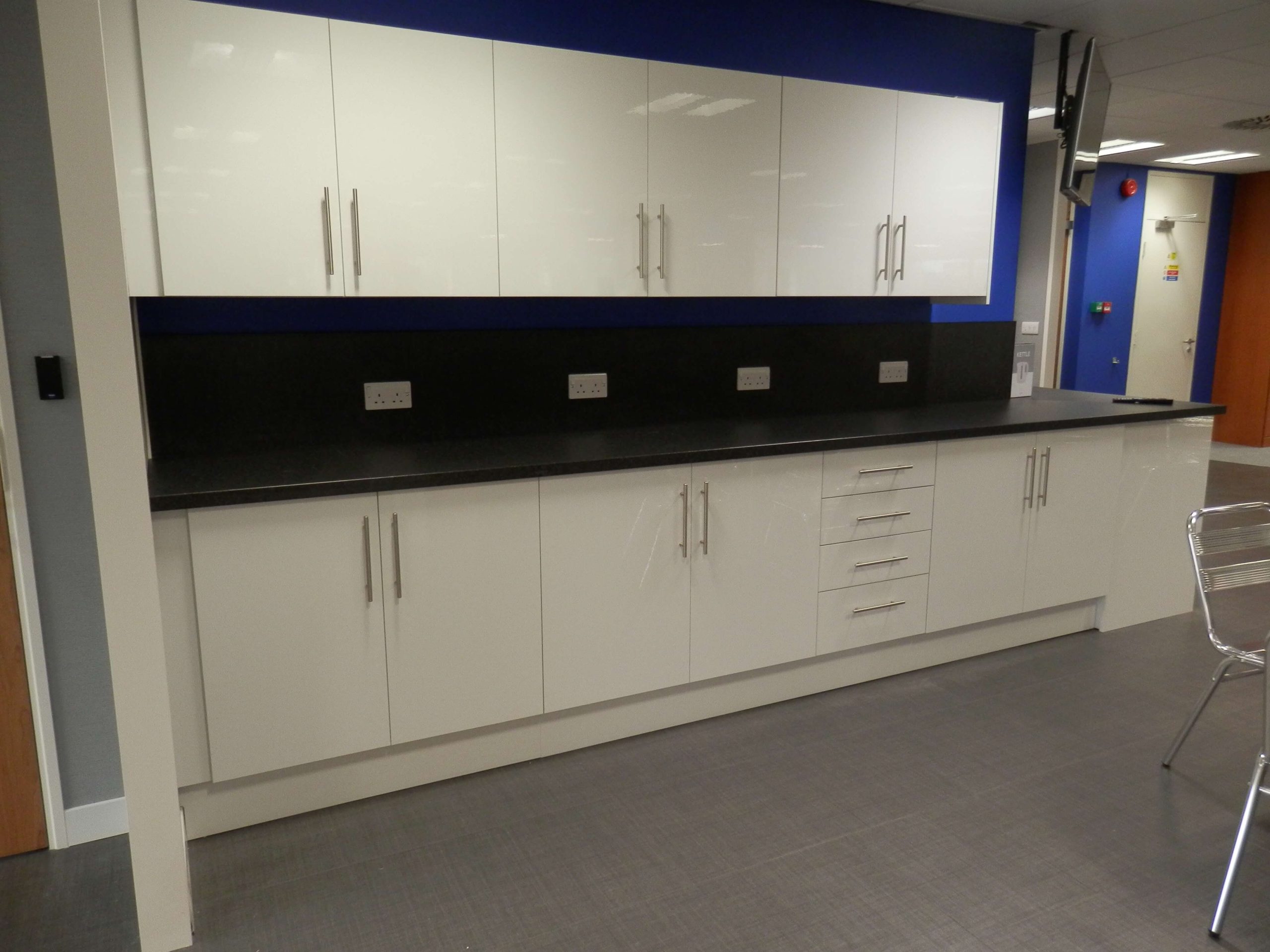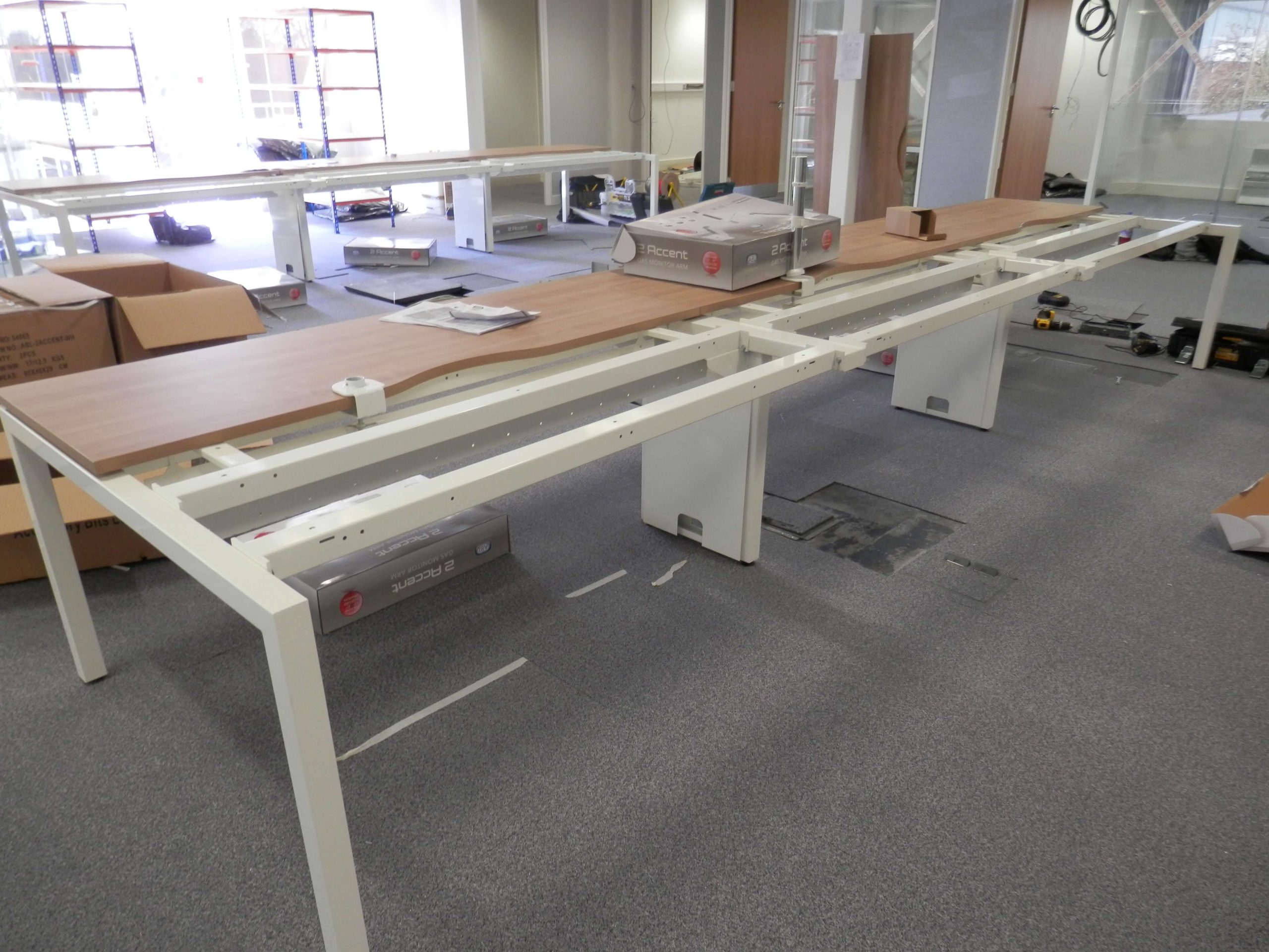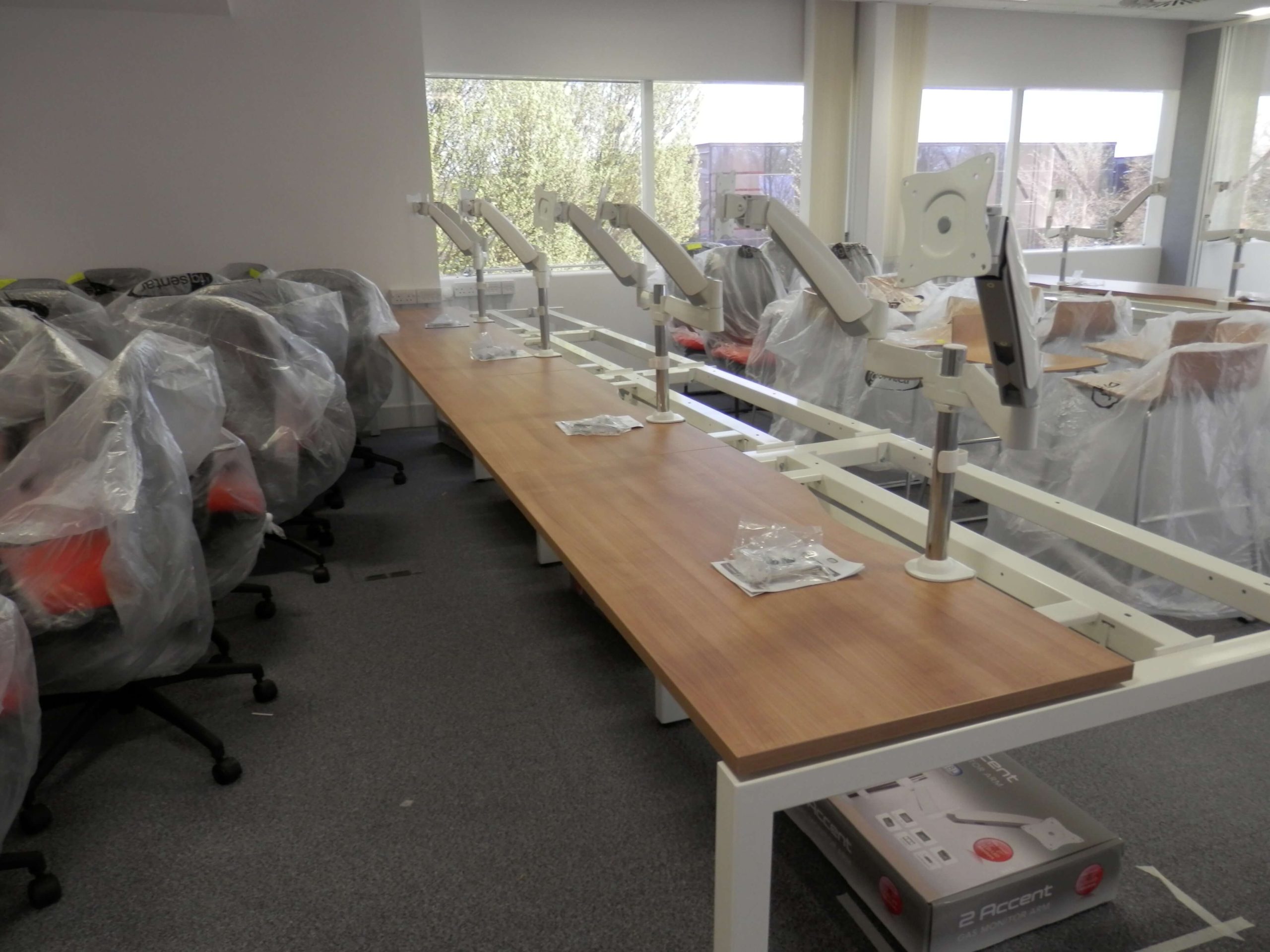 The activities included Office Design, Project Management, CDM regulations, Building Regulations, contracts, stripping out work, demountable glass partitioning, decorations, design of a breakfast bar, supply and fit of all office furniture, air conditioning new and changes to existing, ventilation changes, lighting, electrical work, data cabling, supply and fitting of the communications cabinet, cctv, access control, audio visual equipment and connection, storage wall and flooring changes. We also supplied all of the office furniture, screens, cupboards, plants, graphics, chairs and monitor arms.