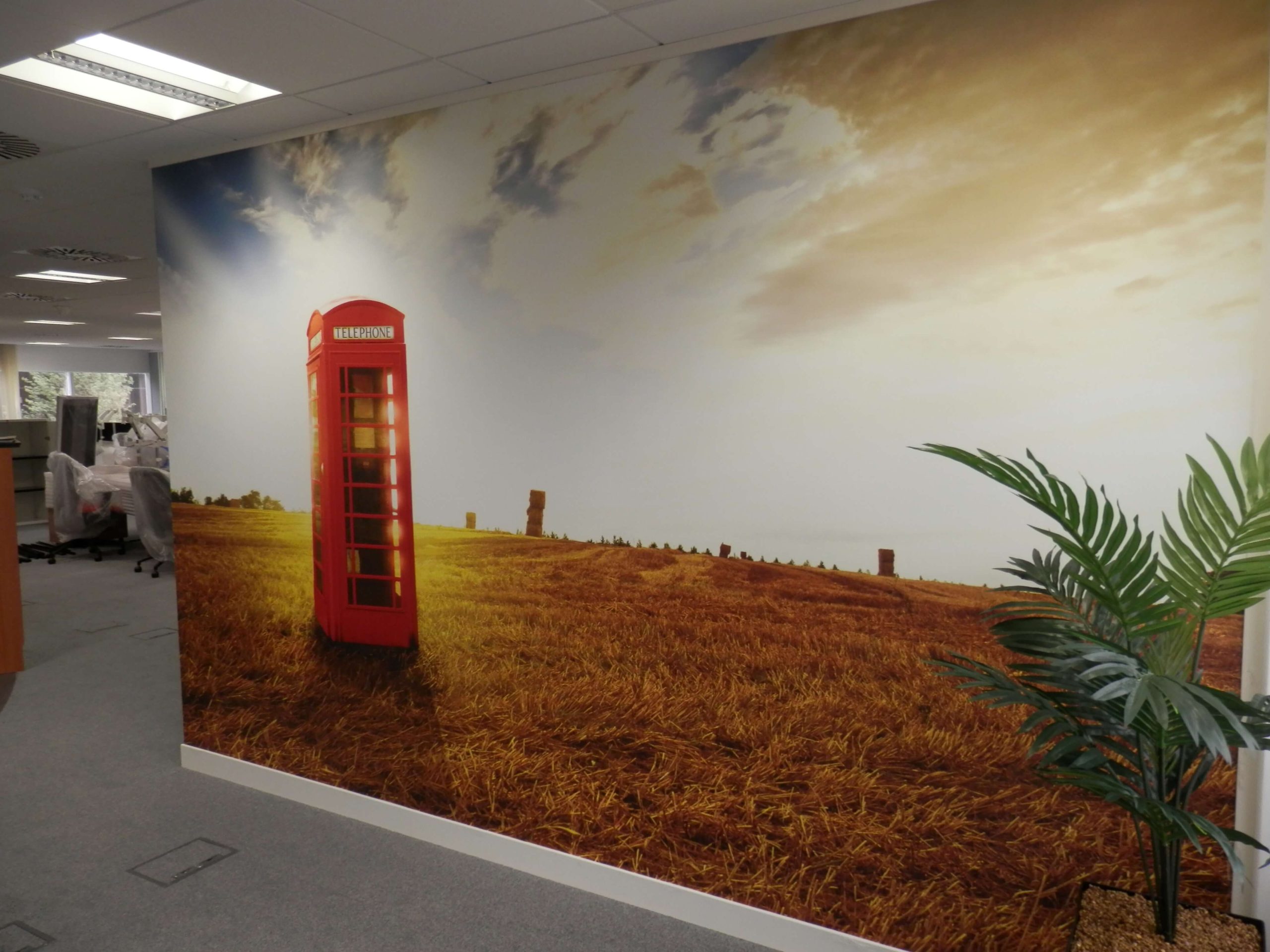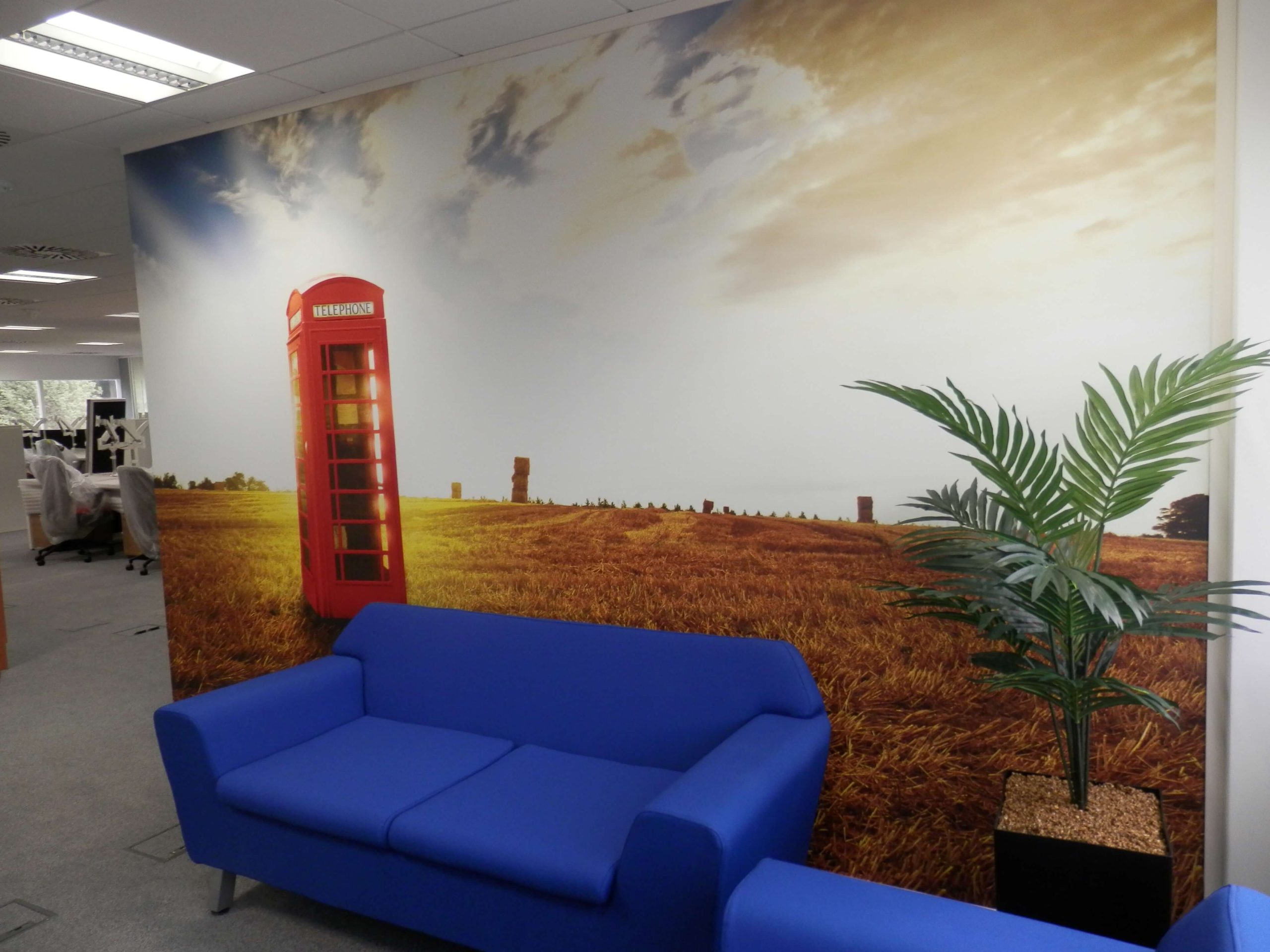 The customer is an American company that wanted to set up and office in the UK. They had a breakfast bar in their office in Dallas, we tried to replicate the way they work in the US so part of their culture of how they work comes across into the UK. The customer is a web based company and the new office will be receiving inbound calls so is basically a call center. The image of a phone box in the reception is intended to reflect this and is one reason why there is a  concentration of desks in space. The digital image that is printed on heavy textured wall covering. Desk footprint was important in getting the right numbers in, and we have designed this so they can increase the numbers easily, all of the future space planning has been done. You will see the grey wallpaper in the office is very textured to give some personality to the paper and help with sound performance.