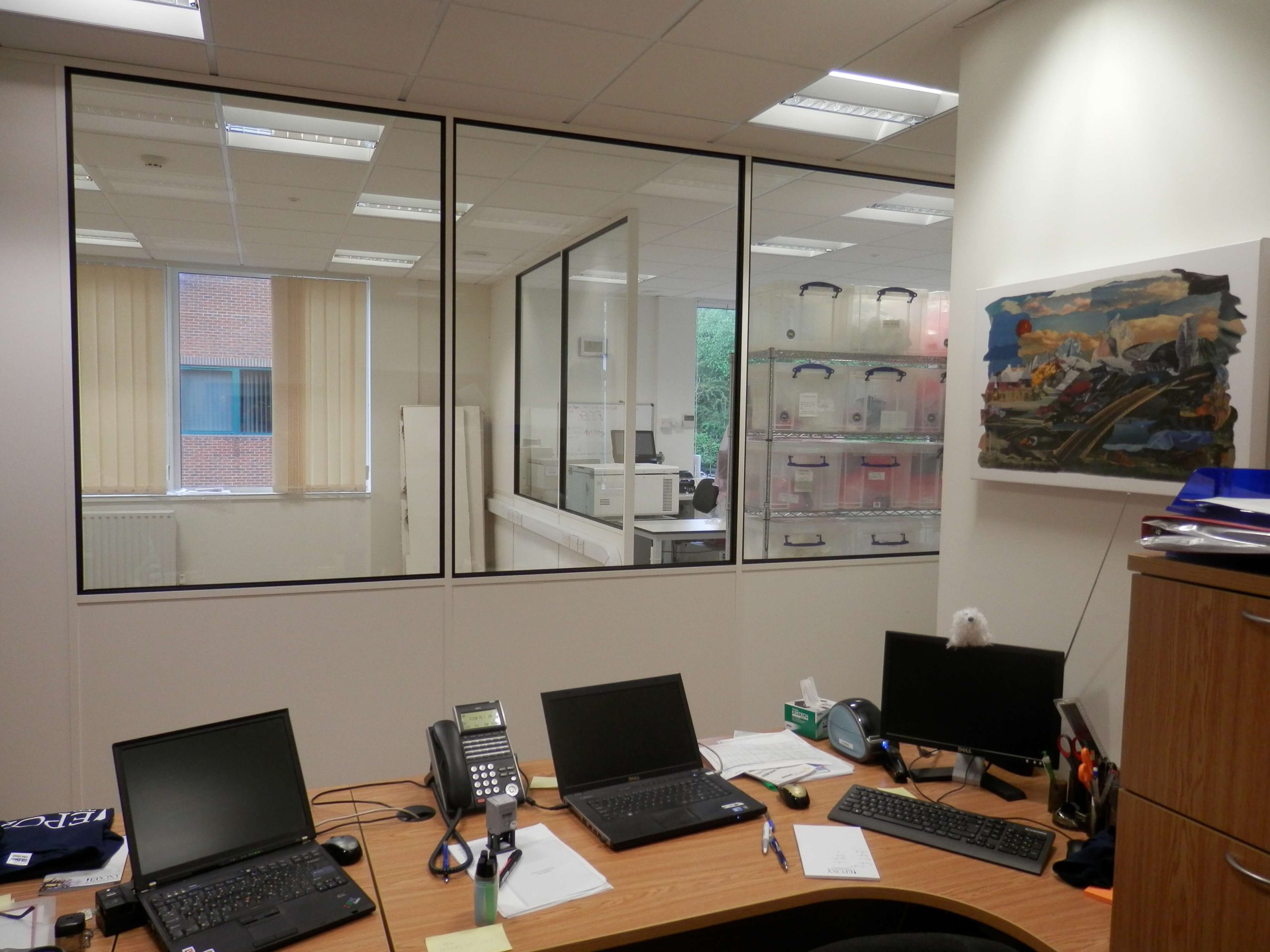 We used demountable partitioning on this project and we managed to match the existing configuration and colours. However as you can see by the first image above, there is a slight variation with the colour on the wall covering which was not possible to match completely 100%. We did offer to redecorate all of the remaining existing partitions with the new wall covering but the customer did not want to do this. The original wallpaper had been on the partitions for over 10 years. By using demountable office partitioning we created some additional laboratory space providing an office extension for the customer and we saved the customer quite a bit of cost as we re-used the expensive materials. The walls are fully demountable so can be taken down and rebuilt again if required without throwing them away. There are some other advantages listed below;
