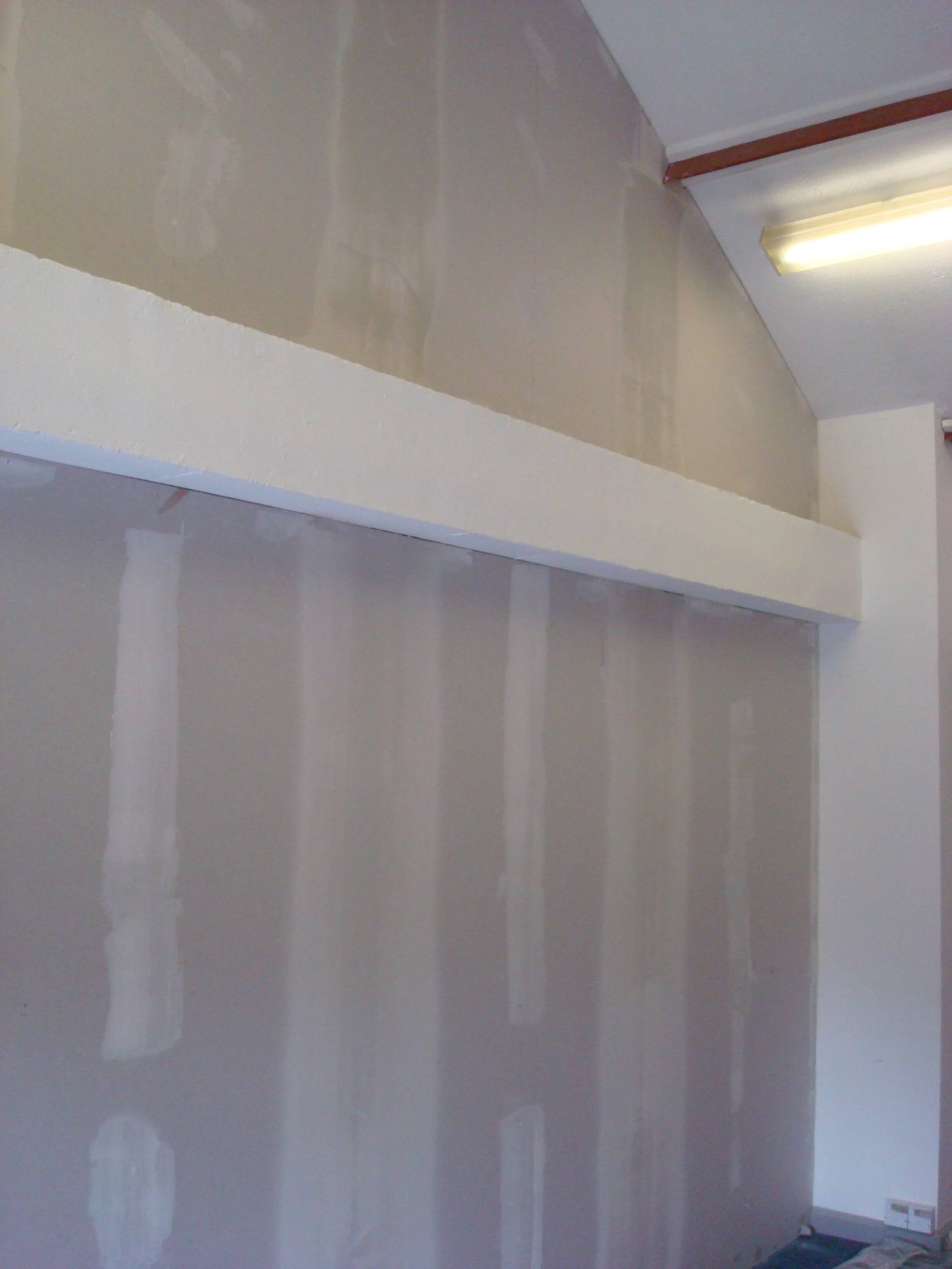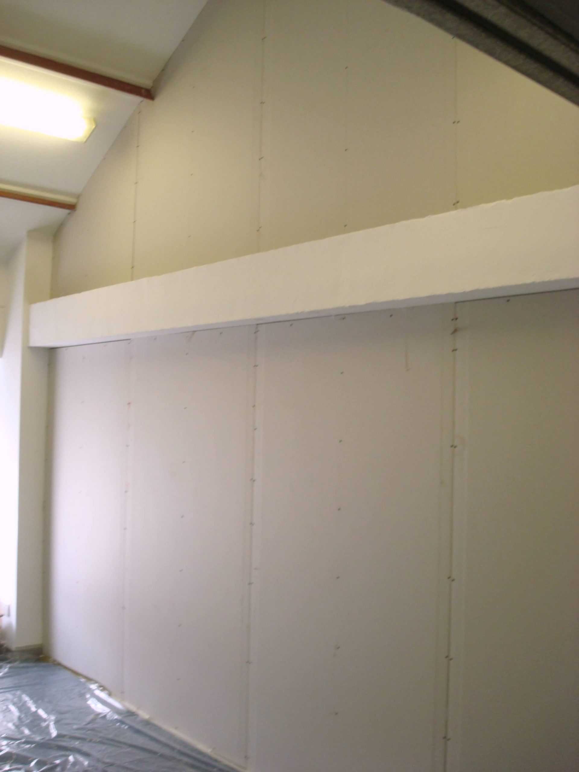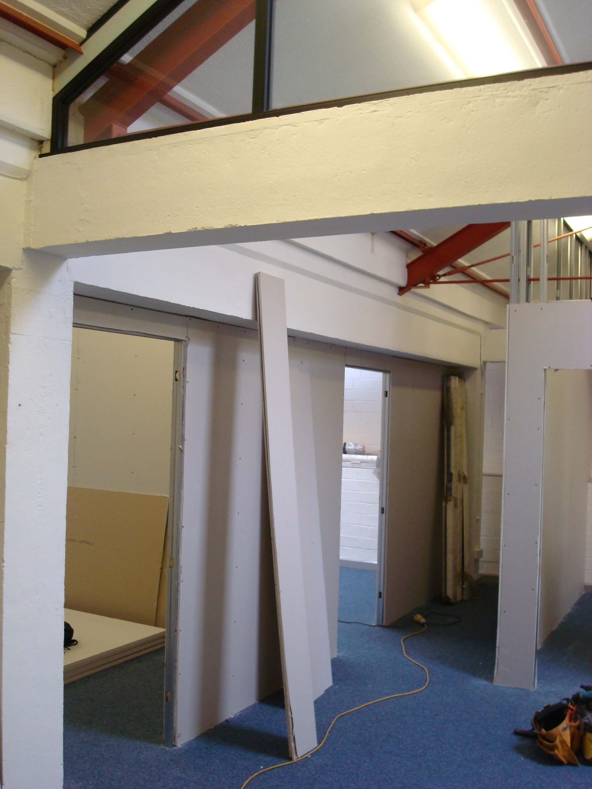The walls were constructed from stud and board with jumbo stud to achieve a strong structure to that height. The walls were taped and jointed and painted in an off white colour so that each room was kept light and airy. The front doors to the training rooms were constructed from some conventional demountable partitioning system materials, as well as some demountable partitioning skirting sections to run around the walls.